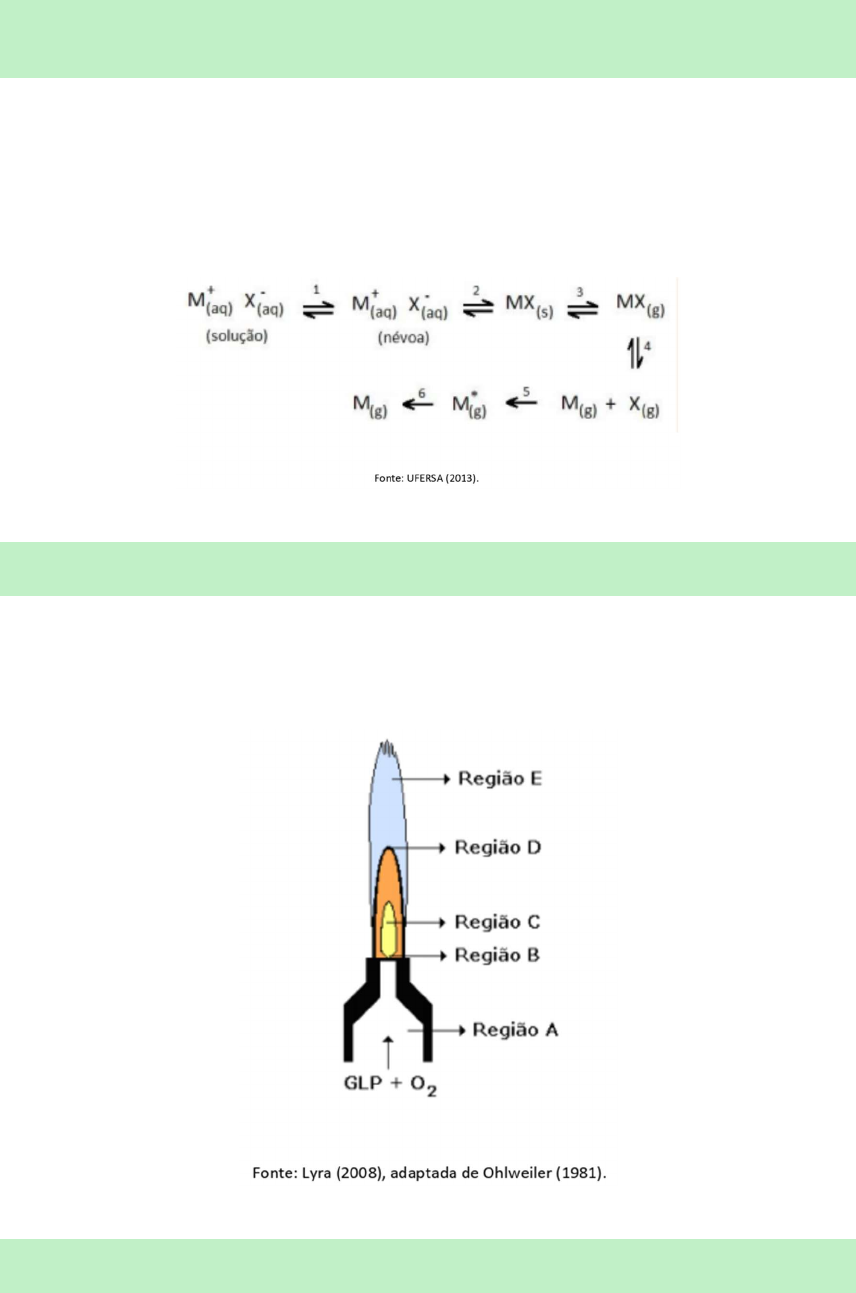 <p>DETERMINAÇÃO DE SÓDIO E POTÁSSIO EM BEBIDA</p><p>ISOTÔNICA POR FOTOMETRIA DE CHAMA</p><p>Pré Teste</p><p>1. Na fotometria de chama, a análise de elementos de uma amostra, geralmente</p><p>líquida, é introduzida em uma chama, na qual ocorrem fenômenos físicos e químicos.</p><p>O esquema a seguir representa as etapas inerentes aos fenômenos que ocorrem nessa</p><p>técnica.</p><p>As etapas 1, 2, 3, 4, 5 e 6 correspondem, respectivamente, aos processos de:</p><p>C. formação de aerossol, dessolvatação, vaporização, atomização, excitação e</p><p>emissão.</p><p>2.</p><p>Em análises químicas por fotometria, o conhecimento acerca das características da</p><p>chama é de grande importância. A figura a seguir mostra esquematicamente a</p><p>estrutura de uma chama típica baseada na mistura de combustível e comburente.</p><p>Assinale a alternativa que traz corretamente a descrição da região em questão:</p><p>B. A região oxidante (D) é a mais indicada para se fazerem medidas, pois nela ocorrem</p><p>o equilíbrio térmico e uma diminuição significativa das concentrações de radicais.</p><p>3. Os métodos de espectroscopia atômica analítica são baseados nas interações de</p><p>átomos do analito com a energia térmica e/ou radiante, e nos processos de radiação</p><p>produzidos.</p><p>Sobre a técnica da fotometria de chama, são apresentadas as seguintes afirmações:</p><p>I. A lâmpada de cátodo oco é a fonte de radiação mais comum, utilizada na</p><p>determinação de metais por essa técnica.</p><p>II. É uma técnica de absorção atômica amplamente utilizada na química analítica para</p><p>detecção de elementos de fácil excitação, como sódio, potássio e cálcio.</p><p>III. As espécies excitadas, geradas na chama, ao retornarem para o estado</p><p>fundamental, liberam parte da energia recebida na forma de radiação</p><p>eletromagnética, a qual é medida.</p><p>Quais afirmações são verdadeiras?</p><p>B. Apenas a III.</p><p>4. A espectroscopia refere-se a uma variedade de técnicas diferentes que empregam</p><p>a radiação, a fim de obter dados da estrutura e das propriedades da matéria, sendo</p><p>utilizada para resolução de inúmeros problemas analíticos. Está relacionada com a</p><p>absorção, emissão ou dispersão da radiação eletromagnética por átomos ou</p><p>moléculas.</p><p>A figura a seguir apresenta a configuração geral de um instrumento para realização de:</p><p>A. espectroscopia de emissão atômica por chama.</p><p>5. Para se calcular a concentração de K em uma amostra de água de coco, uma</p><p>alíquota de 1,0mL da amostra foi diluída em um balão volumétrico de 100,0mL. Então,</p><p>realizou-se a determinação de K por fotometria de chama, em que a solução resultante</p><p>forneceu uma concentração experimental de 16,1mg.L–1. A curva de calibração</p><p>forneceu a equação: y = 0,952 x –0,0039. Sabendo-se que o valor de K no rótulo da água</p><p>de coco é 290mg/200mL, pode-se dizer que a concentração teórica de potássio na</p><p>amostra e o erro relativo são, respectivamente:</p><p>A. 16,95mg.L–1 e 16,9%.</p><p>Pós Teste</p><p>1. Apenas 2% das reservas hídricas do planeta são de água doce, sendo que 97%</p><p>encontram-se no subsolo, na forma de água subterrânea. Estas, por sua vez, ao</p><p>contrário das águas superficiais, têm grandes períodos de residência e, uma vez</p><p>contaminadas, exigem muito tempo para que ocorra sua descontaminação. Análises</p><p>de sódio e potássio em águas e extratos de solos comumente são realizadas por</p><p>fotometria de chama.</p><p>A medição por fotometria de chama se baseia:</p><p>C. na emissão de ondas eletromagnéticas discretas quando os elétrons excitados voltam</p><p>a seu nível original.</p><p>2.</p><p>fotometria de chama é a mais simples das técnicas analíticas baseadas em</p><p>espectroscopia atômica. Nesse caso, a amostra contendo cátions metálicos é</p><p>inserida em uma chama e analisada pela quantidade de radiação emitida pelas</p><p>espécies atômicas ou iônicas excitadas.</p><p>Na fotometria de chama, a mistura gasosa tipicamente utilizada para produção da</p><p>chama é constituída por:</p><p>B. GLP e ar.</p><p>3. Na fotometria de chama, os elementos, ao receberem energia de uma chama,</p><p>geram espécies excitadas que, ao retornarem para o estado fundamental, liberam</p><p>parte da energia recebida na forma de radiação, em comprimentos de onda</p><p>característicos para cada elemento químico. Essa técnica é útil para analisar os</p><p>elementos:</p><p>A. Li, Na e K.</p><p>4. Os métodos espectroscópicos atômicos são empregados na determinação</p><p>qualitativa e quantitativa de mais de 70 elementos. Na criminalística, são comumente</p><p>utilizados para a determinação de resíduos de tiros, por suas vantagens de</p><p>sensibilidade, detecção e distinção de amostras complexas. Marque a alternativa que</p><p>apresenta apenas métodos de atomização por chama.</p><p>A. Espectroscopia de absorção atômica (EA), espectroscopia de emissão atômica (EEe</p><p>espectroscopia de fluorescência atômica (EFA).</p><p>5. Em uma análise por fotometria de chama, deve-se estar sempre atento às</p><p>interferências presentes, pois podem prejudicar os resultados obtidos. Um plano deve</p><p>ser traçado para isolar os analitos das interferências antes que a medida final seja</p><p>feita.</p><p>Sobre as possíveis interferências em fotometria de chama, é correto afirmar que:</p><p>C. os constituintes que influenciam a volatilização das partículas do analito causam</p><p>interferência química.</p>
