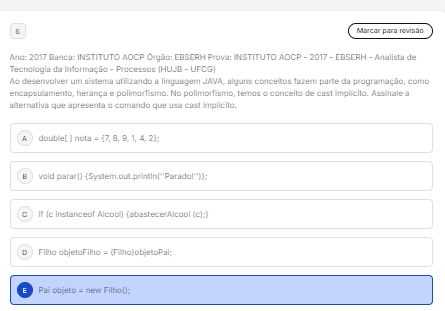 <p>Marcar para revisão 2017 Banca: INSTITUTO AOCP Orgão: EBSERH Prova: INSTITUTO AOCP - 2017 - EBSERH - Analista de Tecnologia da - Processos (HUJB - UFCG) desenvolver um sistema utilizando a linguagem JAVA alguns conceitos parte da como herança e No temos conceito de cast implicito. Assinale a alternativa que apresenta comando que usa cast A nota void parar() if (c instanceof Alcool) {abastecerAlcool D Filho objetoFilho E Pai objeto new</p>