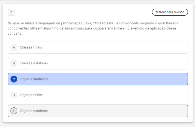 <p>7 Marcar para revisão No que se refere à linguagem de programação Java, "thread safe" é um conceito segundo qual threads concorrentes utilizam algoritmo de sincronismo para cooperarem entre si. É exemplo da aplicação desse conceito: A Classes finais B Classes estáticas C Objetos imutáveis D Objetos finais E Objetos estáticos</p>