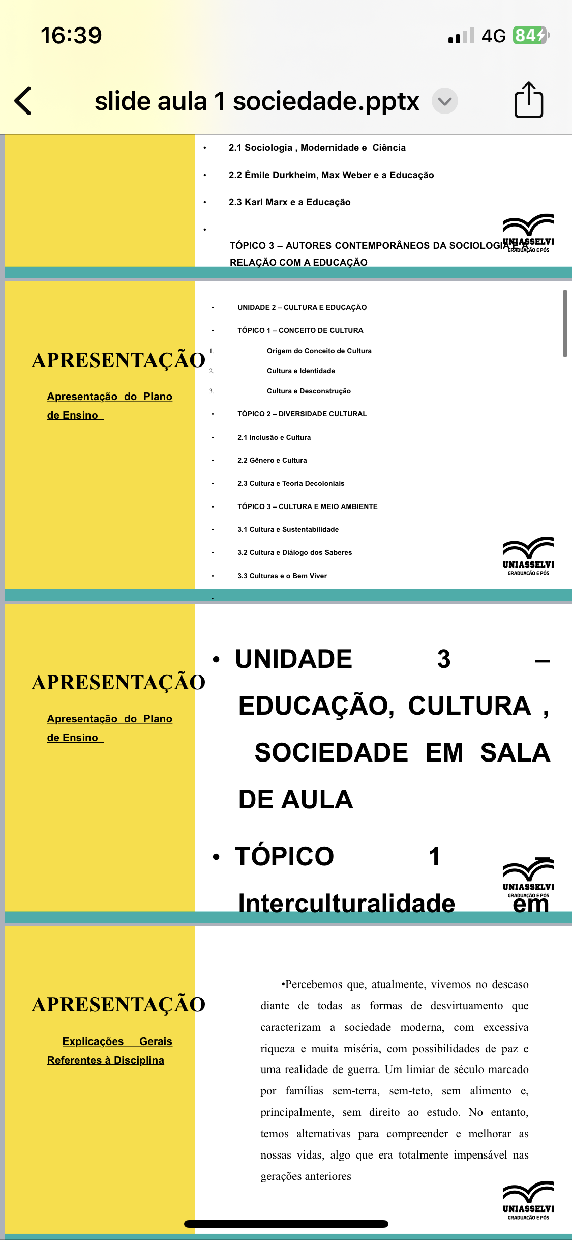 <p>16:39 4G 844 slide aula 1 sociedade.pptx 2.1 Sociologia , Modernidade e Ciência 2.2 Émile Durkheim, Max Weber e a Educação 2.3 Karl Marx e a Educação TÓPICO 3 - AUTORES DA RELAÇÃO COM A EDUCAÇÃO UNIDADE 2 - CULTURA E EDUCAÇÃO TÓPICO 1 CONCEITO DE CULTURA 1 APRESENTAÇÃO Origem do Conceito de Cultura 2 Cultura Identidade 3 Cultura Desconstrução Apresentação do Plano de Ensino . TÓPICO 2 DIVERSIDADE CULTURAL . 2.1 Inclusão Cultura . 2.2 Gênero Cultura . 2.3 Cultura e Teoria Decoloniais . TÓPICO 3 CULTURA E MEIO AMBIENTE . 3.1 Cultura Sustentabilidade . 3.2 Cultura Diálogo dos Saberes UNIASSELVI . 3.3 Culturas Bem Viver GRADUAÇÃO PÓS UNIDADE 3 APRESENTAÇÃO EDUCAÇÃO, CULTURA , Apresentação do Plano de Ensino SOCIEDADE EM SALA DE AULA TÓPICO 1 UNIASSELVI Interculturalidade em que, atualmente, vivemos no descaso APRESENTAÇÃO diante de todas as formas de desvirtuamento que caracterizam a sociedade moderna, com excessiva Explicações Gerais riqueza e muita miséria, com possibilidades de paz e Referentes à Disciplina uma realidade de guerra. Um limiar de século marcado por famílias sem-terra, sem-teto, sem alimento e, principalmente, sem direito ao estudo. No entanto, temos alternativas para compreender e melhorar as nossas vidas, algo que era totalmente impensável nas gerações anteriores UNIASSELVI GRADUAÇÃO PÓS</p>