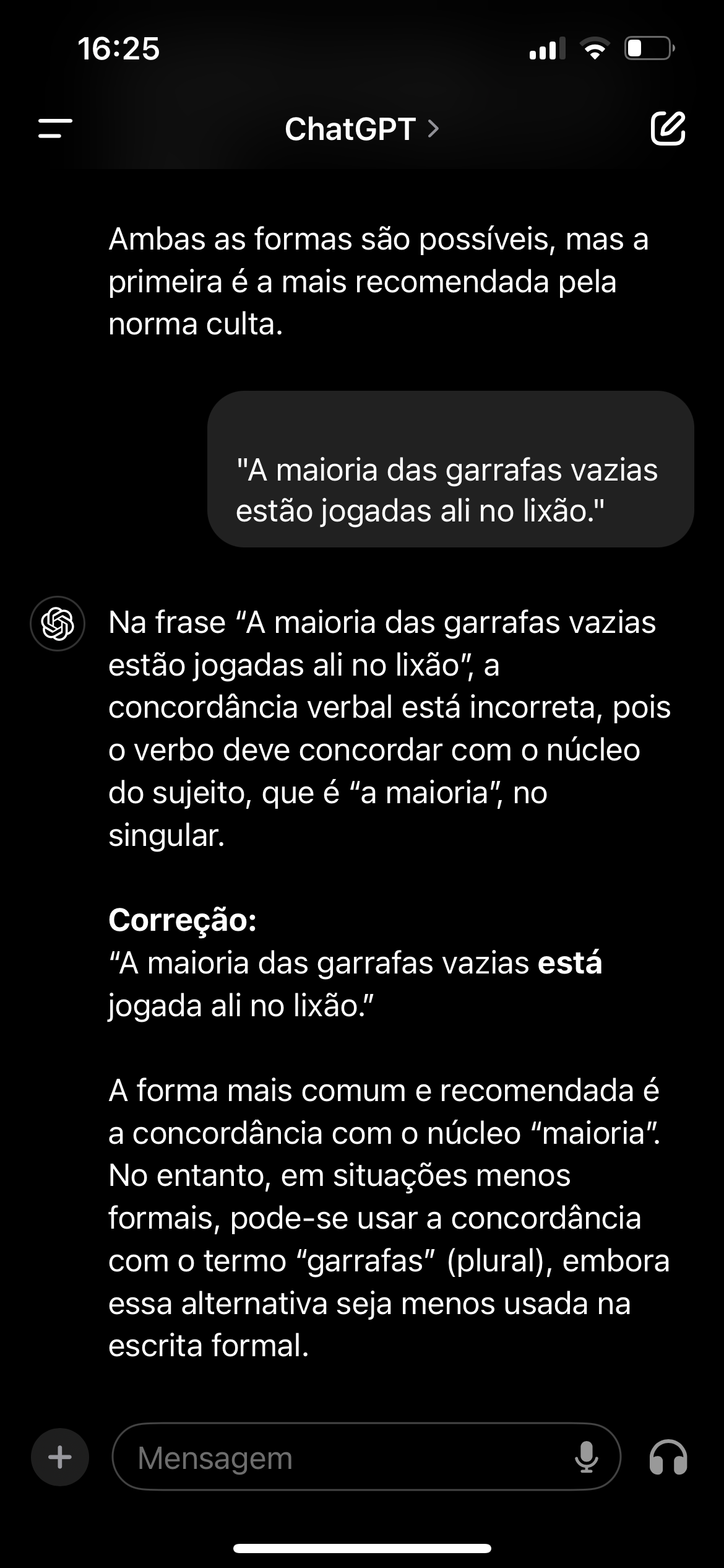 <p>16:25 ChatGPT > Ambas as formas são possíveis, mas a primeira é a mais recomendada pela norma culta. "A maioria das garrafas vazias estão jogadas ali no lixão." Na frase "A maioria das garrafas vazias estão jogadas ali no lixão", a concordância verbal está incorreta, pois O verbo deve concordar com núcleo do sujeito, que é "a maioria", no singular. Correção: "A maioria das garrafas vazias está jogada ali no lixão." A forma mais comum e recomendada é a concordância com núcleo "maioria". No entanto, em situações menos formais, pode-se usar a concordância com termo "garrafas" (plural), embora essa alternativa seja menos usada na escrita formal. + Mensagem</p>