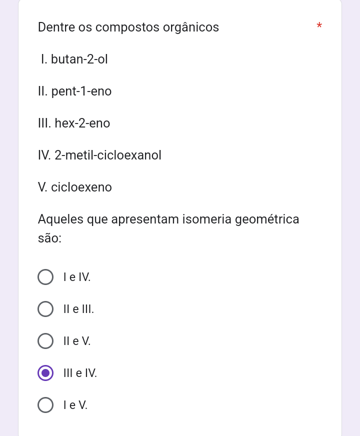 <p>Dentre os compostos orgânicos * I. butan-2-ol II. pent-1-eno III. hex-2-eno IV. 2-metil-cicloexanol V. cicloexeno Aqueles que apresentam isomeria geométrica são: le IV. e III. e V. III e IV. le V.</p>