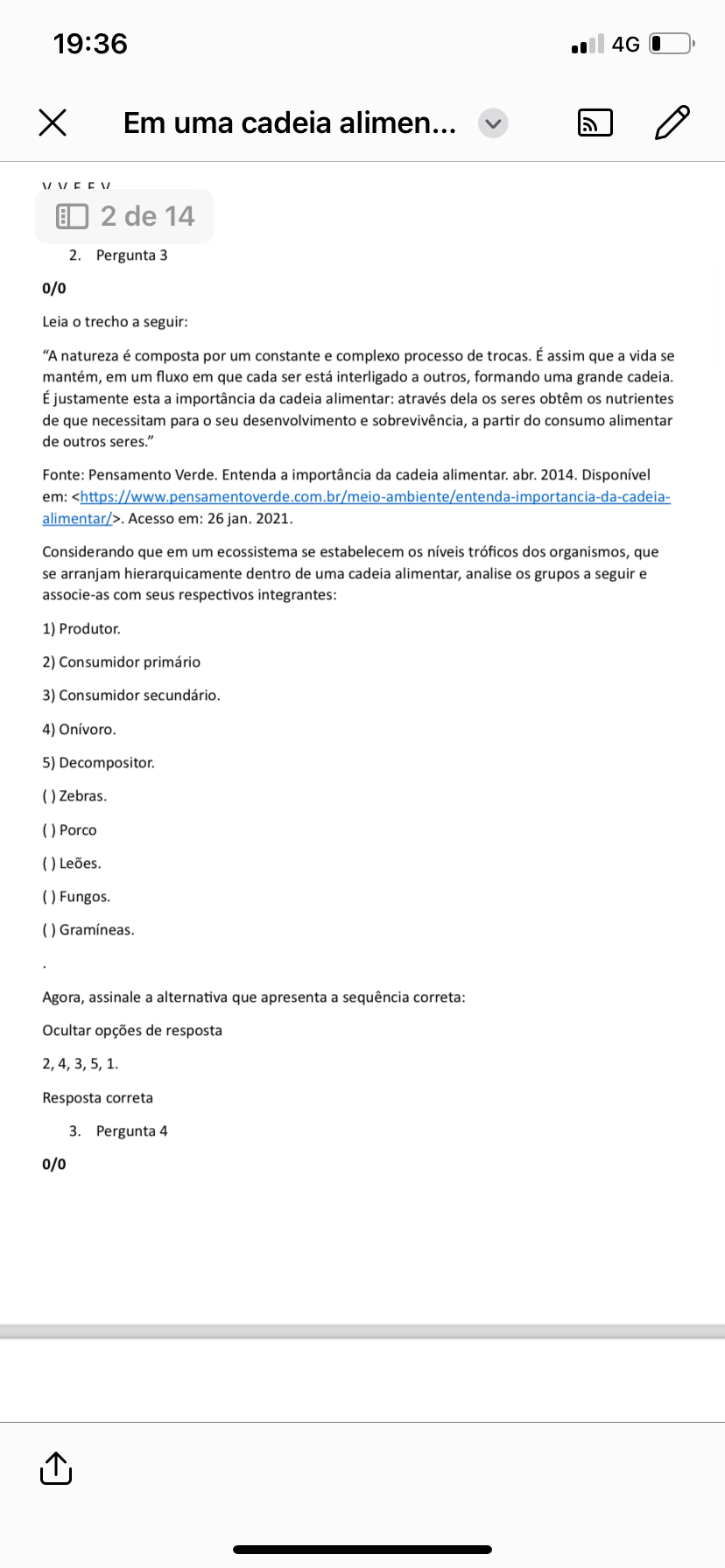 <p>19:36 4G X Em uma cadeia alimen... 2 de 14 2. Pergunta 3 0/0 Leia o trecho a seguir: "A natureza é composta por um constante e complexo processo de trocas. É assim que a vida se mantém, em um fluxo em que cada ser está interligado a outros, formando uma grande cadeia. É justamente esta a importância da cadeia alimentar: através dela os seres obtêm os nutrientes de que necessitam para o seu desenvolvimento e sobrevivência, a partir do consumo alimentar de outros seres." Fonte: Pensamento Verde. Entenda a importância da cadeia alimentar. abr. 2014. Disponível em: Acesso em: 26 jan. 2021. Considerando que em um ecossistema se estabelecem os níveis tróficos dos organismos, que se arranjam hierarquicamente dentro de uma cadeia alimentar, analise os grupos a seguir e associe-as com seus respectivos integrantes: 1) Produtor. 2) Consumidor primário 3) Consumidor secundário. 4) 5) Zebras. Porco Fungos. Agora, assinale a alternativa que apresenta a sequência correta: Ocultar opções de resposta 2, 4, 3, 5, 1. Resposta correta 3. Pergunta 4 0/0</p>