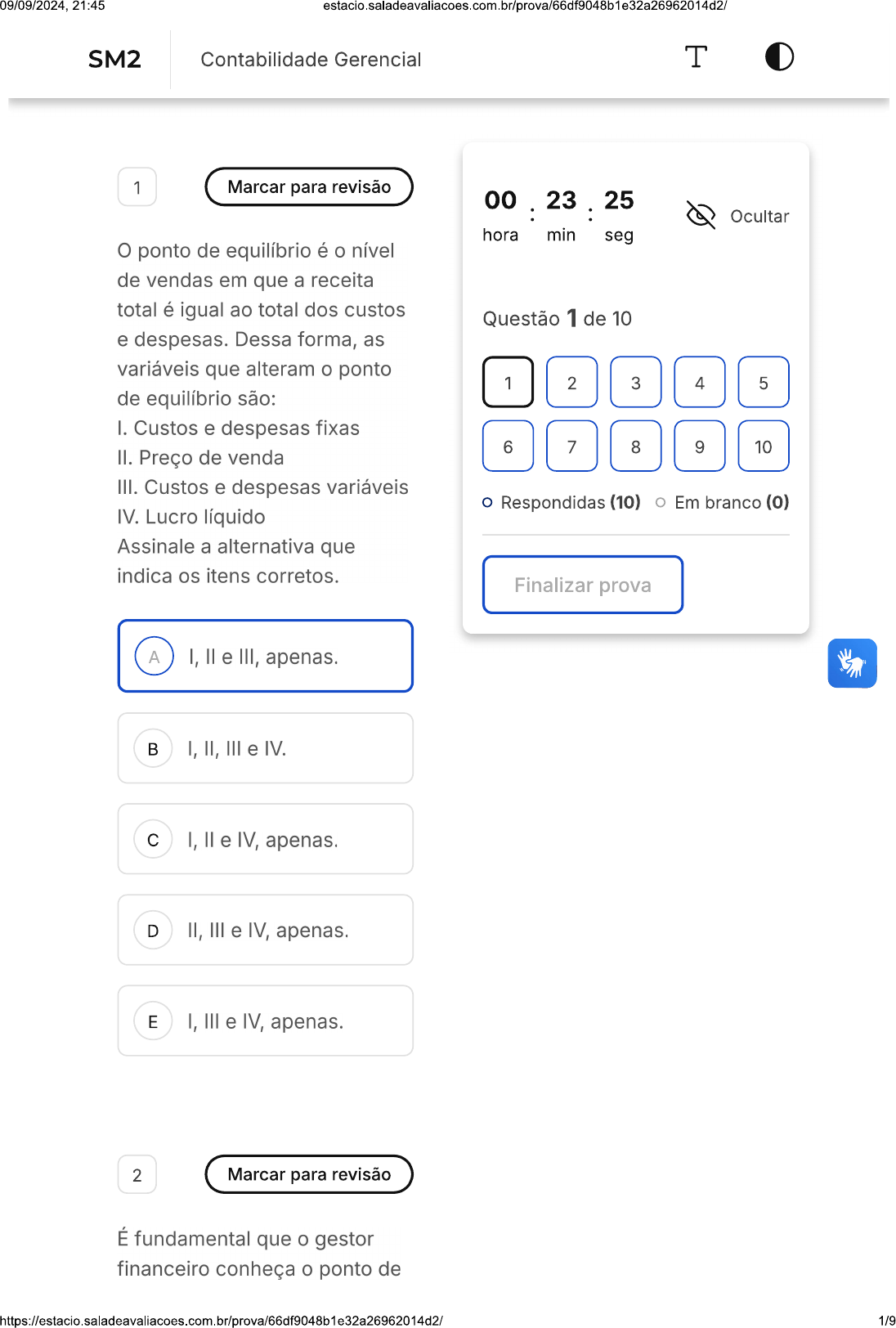 <p>09/09/2024, 21:45 SM2 Contabilidade Gerencial T 1 Marcar para revisão 00 : 23 : 25 Ocultar hora min seg O ponto de equilíbrio é o nível de vendas em que a receita total é igual ao total dos custos Questão 1 de 10 e despesas. Dessa forma, as variáveis que alteram o ponto 1 2 3 4 5 de equilíbrio são: I. Custos e despesas fixas 6 7 8 9 10 II. Preço de venda III. Custos e despesas variáveis Respondidas (10) Em branco (0) IV. Lucro líquido Assinale a alternativa que indica os itens corretos. Finalizar prova A I, e III, apenas. B I, II, III e IV. C I, e IV, apenas. D II, III e IV, apenas. E I, III e IV, apenas. 2 Marcar para revisão É fundamental que o gestor financeiro conheça o ponto de 1/9</p><p>09/09/2024, 21:45 estacio.saladeavaliacoes.com.br/prova/66df9048b1e32a26962014d2/ equilíbrio da operação que controla. O que acontece a partir do momento que uma empresa atinge seu ponto de equilíbrio? Reduz seus custos A variáveis. B Começa a gerar lucro. Começa a aumentar C seus custos e despesas. Aumenta seus custos D fixos. Começa a gerar E prejuízos. 3 Marcar para revisão Um restaurante vende 300 pratos por dia a R$30 cada. Seus custos variáveis diários são R$6.000 e custos fixos mensais de R$90.000. Qual é a receita diária do restaurante? 2/9</p><p>09/09/2024, 21:45 A R$11.000. B R$10.000. C R$9.000. D R$8.000. E R$12.000. 4 Marcar para revisão A análise da relação entre o custo, o volume e o lucro é uma ferramenta importante para a tomada de decisão nas empresas. Qual o objetivo da análise da relação entre o custo, o volume e o lucro nas empresas? Identificar os custos A fixos da empresa. Definir a margem de B lucro da empresa. 3/9</p><p>09/09/2024, 21:45 estacio.saladeavaliacoes.com.br/prova/66df9048b1e32a26962014d2/ Projetar os resultados financeiros da C empresa para diferentes cenários de produção e venda. Analisar a qualidade D dos produtos da empresa. Avaliar o desempenho E dos funcionários da empresa. 5 Marcar para revisão A empresa deve combinar as visões de custos e mercado na definição do preço de venda. Por que essa combinação é importante? Para garantir que a empresa atenda A apenas as demandas dos clientes atuais. Para garantir que a empresa ofereça B preços competitivos no mercado. Para garantir que a C empresa tenha um alto lucro. 4/9</p><p>09/09/2024, 21:45 estacio.saladeavaliacoes.com.br/prova/66df9048b1e32a26962014d2/ Para garantir que os preços de venda D cubram apenas os custos de produção. Para garantir que a empresa atenda às demandas do E mercado e ao mesmo tempo cubra seus custos e gere lucro. 6 Marcar para revisão método de precificação com base no retorno esperado permite que a empresa recupere o investimento. Qual é a base utilizada na precificação pelo método no retorno esperado? Custos e despesas A variáveis Custos de B transformação Custo de C oportunidade 5/9</p><p>09/09/2024, 21:45 estacio.saladeavaliacoes.com.br/prova/66df9048b1e32a26962014d2/ Capital investido na D empresa Preços de mercado E dos concorrentes 7 Marcar para revisão método do custeio variável ou direto é muito utilizado e útil para tomada de decisão. Qual é a principal vantagem do método de precificação que utiliza o custeio direto como base? Permite maior A precisão na alocação dos custos indiretos. Não considera os custos e despesas B variáveis na precificação dos produtos. É mais simples e fácil C de ser aplicado do que outros métodos. 6/9</p><p>09/09/2024, 21:45 estacio.saladeavaliacoes.com.br/prova/66df9048b1e32a26962014d2/ Inclui os custos fixos D na valoração dos produtos. Permite estabelecer uma margem de E contribuição para cada produto. 8 Marcar para revisão Uma padaria produz 1.000 pães por dia, vendidos a R$1 cada. Os custos variáveis somam R$0,50 por pão e os custos fixos diários são de R$200. Qual é a margem de contribuição total diária da padaria? A R$400. B R$800. C R$700. D R$500. E R$300. 7/9</p><p>09/09/2024, 21:45 estacio.saladeavaliacoes.com.br/prova/66df9048b1e32a26962014d2/ 9 Marcar para revisão É fundamental que o gestor financeiro conheça o ponto de equilíbrio da operação que controla. que acontece a partir do momento que uma empresa atinge seu ponto de equilíbrio? Começa a gerar A prejuízos. Reduz seus custos B variáveis. Aumenta seus custos C fixos. D Começa a gerar lucro. Começa a aumentar E seus custos e despesas. 10 Marcar para revisão Uma empresa está no processo de desenvolvimento de um novo produto e solicitou pesquisas de mercado para sua equipe especializada. Os resultados apontam que esse novo produto pode ser vendido no mercado pelo valor de $ 8/9</p><p>09/09/2024, 21:45 120,00/unidade e há demanda para a empresa vender 10.000 unidades por mês. Para conseguir adaptar seu processo produtivo e fabricar esse novo produto, a empresa precisa de um investimento de $ 250.000,00, e os acionistas estabeleceram uma taxa mínima de retorno de 30%. Com base nessas informações, qual o custo-meta unitário para esse novo produto? A $ 112,20 B $ 112,30 C $ 112,10 D $ 112,50 E $ 112,00 9/9</p>