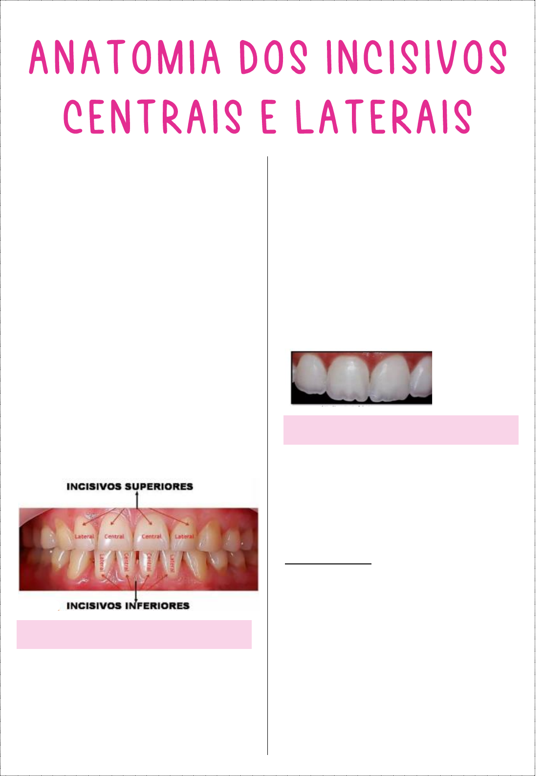 <p>Anatomia Dental</p><p>Os dentes incisivos se localizam na</p><p>porção anterior do arco dente</p><p>O grupo dos incisivos é composto por</p><p>oito dentes, sendo 4 superiores e 4</p><p>inferiores</p><p>Esse grupo é composto pelos incisivos</p><p>centrais (dois superiores e 2 inferiores) e</p><p>pelos incisivos laterais (2 superiores e 2</p><p>inferiores)</p><p>A principal função é prender e cortar</p><p>os alimentos</p><p>Dentes importantes na estética</p><p>Dentes mais importantes na articulação</p><p>das palavras e para emissão de som</p><p>Borda incisal</p><p>A borda incisal, é a parte cortante dos</p><p>dentes. Nos dentes anteriores (incisivos e</p><p>caninos)é chamada de borda incisal. Já</p><p>nos dentes posteriores (Pré molares e</p><p>molares) chama-se oclusal, pois ocorre a</p><p>formação das cúspides que formam a</p><p>mesa oclusal que é responsável por</p><p>triturar os alimentos</p><p>Logo após a erupção (em bebes e</p><p>crianças), a borda incisal dos incisivos</p><p>centrais pode apresentar três saliências</p><p>arredondadas (flor de liz). Com o</p><p>desgaste, essa borda serrilhada pode</p><p>desaparecer com o passar do tempo</p><p>Incisivo central superior</p><p>Formato de trapézio</p><p>Divisão em 3 segmentos e 2 sulcos</p><p>vestibulares (lóbulo distal, médio e mesial,</p><p>separados por 2 sulcos transversal)</p><p>Face Vestibular</p><p>Cervical: estreita</p><p>Incisal: larga</p><p>*Convergência: faces proximais inclinam</p><p>para o terço cervical, que é menor que</p><p>o terço incisal</p><p>Ângulo MI: agudo</p><p>Ângulo DI: obtuso</p><p>Borda cervical: curva e convexa para</p><p>raiz</p><p>Borda incisal: reta e inclinada para distal</p><p>(isso que da a curvatura do sorriso)</p><p>Bordas mesiais mais retilíneas (mais reta)</p><p>Borda distais mais convexas (mais</p><p>arredondada)</p><p>*Desgaste excessivo desaparecimento</p><p>dos ângulos</p><p>Face lingual</p><p>Menor do que a vestibular</p><p>(convergência)</p><p>Bastante escavada (Fossa lingual)</p><p>Cristais marginais: largas nos cíngulo e</p><p>estreita na incisal</p><p>Cíngulo bem desenvolvido</p><p>Face proximal</p><p>Convergem para o terço incisal (Na vista</p><p>proximal, o terço cervical é maior que o</p><p>incisal</p><p>Mesial maior, mais plana e mais alta</p><p>Distal menor e mais convexa</p><p>(arredondada)</p><p>Raízes *não cai na prova</p><p>Incisivo lateral superior</p><p>Dente menor que o incisivo central,</p><p>em todas as dimensões, com exceção</p><p>do comprimento da raiz</p><p>Face vestibular</p><p>Trapezoidal e mais convexa que o</p><p>central</p><p>Incisal bem inclinada para distal</p><p>Ângulo distal bem arredondada em</p><p>relação à mesial</p><p>Mais estreito que o incisivo central</p><p>Face lingual</p><p>Menor e com as mesmas características</p><p>do central</p><p>Cristas marginais salientes</p><p>Fossa lingual profunda</p><p>Cíngulo</p><p>Faces Proximais</p><p>Menores e com as mesmas</p><p>características do central (Mesial maior e</p><p>mesial menor)</p><p>Raiz lateral: tem uma raiz mais alongada</p><p>que o central</p><p>Incisivo central inferior</p><p>*Menor e mais simétrico dente humano</p><p>Dentes com menos detalhes e tamanho</p><p>menor que o incisivo central superior</p><p>Face vestibular</p><p>Coroa achatada no sentido V-L</p><p>Forma de trapézio</p><p>Inclinação para lingual</p><p>Discreta bossa no terço cervical</p><p>Morfologia mais discreta com sulcos</p><p>vestibulares e os três segmentos quase</p><p>ausentes</p><p>Pode ter a borda mesial menor quando</p><p>há o desgaste pela oclusão.</p><p>Consequentemente ângulos retos</p><p>*as bordas mesiais e distais podem ter o</p><p>mesmo tamanho devido ao desgaste</p><p>oclusal</p><p>*os incisivos central tem os detalhes</p><p>anatômicos quase imperceptíveis pois</p><p>não tem contato com os dentes</p><p>Face lingual</p><p>Levemente côncava, menor que a vest.</p><p>Cíngulo baixo e cristas marginais</p><p>dificilmente são perceptíveis</p><p>Fossa lingual leve</p><p>Face proximal</p><p>Faces mesial e distal são triangulares</p><p>Borda deslocada para lingual, em relação</p><p>ao longo eixo</p><p>Incisivo lateral inferior</p><p>É muito parecido com o incisivo</p><p>central inferior, mas ligeiramente maior</p><p>em todas as dimensões da coroa e da</p><p>raiz</p><p>A borda incisal é um pouco mais larga</p><p>Face vestibular</p><p>Trapezoidal mais alargada</p><p>Maior que o central inferior</p><p>A metade distal semelhante a metade</p><p>mesial do canino inferior</p><p>Ângulo distal arredondado e mesial reto</p><p>lóbulos um pouco mais evidentes</p><p>Face lingual</p><p>Mais alargada e mais escavada que o</p><p>central inferior</p><p>Detalhes pouco evidentes</p><p>Face Proximal:</p><p>Projeção lingual do ângulo disto-incisal</p><p>Convergências</p><p>Vista vestibular:</p><p>Terço incisal maior que o cervical</p><p>(convergem para cervical)</p><p>Vestibular maior que lingual</p><p>Mesial maior que distal</p><p>Raiz</p><p>Mais longa, mais robusta e com sulcos</p><p>mais profundos</p><p>Achatada no sentido mesio-distal</p><p>Desvio para distal</p><p>Estética</p><p>Incisivo mais estreito: aproximação dos</p><p>lóbulos/sulcos, lóbulo mediano menor</p><p>Incisivo mais largo: sulcos mais afastados,</p><p>lóbulo mediano maior</p><p>Incisivo mais curto: aumentar as áreas</p><p>de difusão da luz, aumentar a</p><p>concavidade da vestibular</p><p>Incisivo mais longo: aumentar áreas de</p><p>reflexão de luz, reduzir a curvatura da</p><p>vestibular</p>