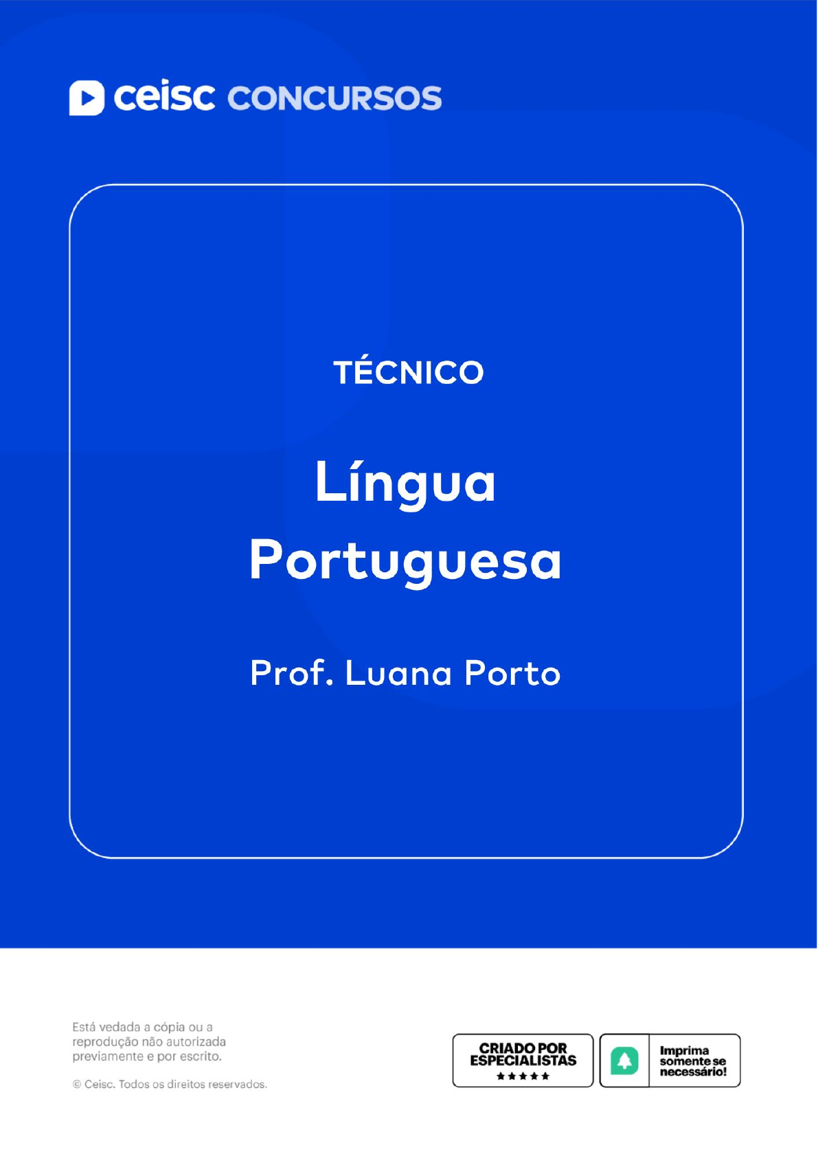 <p>Ceisc Concursos</p><p>Língua portuguesa</p><p>1</p><p>Ceisc Concursos</p><p>Língua portuguesa</p><p>2</p><p>Olá! Boas-Vindas!</p><p>Cada material foi preparado com muito carinho para que você</p><p>possa absorver da melhor forma possível, conteúdos de</p><p>qualidade!</p><p>Lembre-se: o seu sonho também é o nosso!</p><p>Bons estudos! Estamos com você até a sua aprovação!</p><p>Com carinho,</p><p>Equipe Ceisc. ♥</p><p>Ceisc Concursos</p><p>Língua portuguesa</p><p>3</p><p>Língua Portuguesa</p><p>Prof.ª Dra. Luana Porto</p><p>Sumário</p><p>1. Compreensão e interpretação de textos de gêneros variados ................................................. 4</p><p>1.2. Compreensão e interpretação de texto: a linguagem do texto ............................................ 24</p><p>1.3. Pressuposto e subentendido ............................................................................................... 33</p><p>1.4. Interpretação de texto e silogismo ....................................................................................... 36</p><p>Olá, aluno(a). Este material de apoio foi organizado com base nas aulas do curso preparatório</p><p>para concursos e deve ser utilizado como um roteiro para as respectivas aulas. Além disso,</p><p>recomenda-se que o aluno assista as aulas acompanhado da legislação pertinente.</p><p>Bons estudos, Equipe Ceisc.</p><p>Atualizado em fevereiro de 2024.</p><p>Ceisc Concursos</p><p>Língua portuguesa</p><p>4</p><p>1. Compreensão e interpretação de textos de gêneros</p><p>variados</p><p>Profa. Dra. Luana Porto</p><p>@profa.luanaporto</p><p>Ao se realizar a prova de língua portuguesa, o texto precisa ser observado com leitura</p><p>atenta, distinguindo-se dois processos: análise e interpretação.</p><p>Compreensão</p><p>Interpretação</p><p>• Análise e decodificação do que está</p><p>escrito no texto</p><p>• Objetividade analítica</p><p>• Observação a elementos linguísticos</p><p>• Conclusões do leitor com base no</p><p>texto</p><p>• Análise reflexiva</p><p>• Observação a elementos linguísticos</p><p>e extralinguísticos</p><p>Leia os textos a seguir:</p><p>Texto 1</p><p>1</p><p>Texto constante na prova da banca INSTITUTO AOCP - 2019 - UFRB - Farmacêutico - Bioquímico</p><p>Texto 2</p><p>Disponível em: <https://www.revistacaminhoneiro.com.br/maio-faca-bonito-e-proteja-infancia/>. Acesso em: 30</p><p>jun. 2019.</p><p>http://www.revistacaminhoneiro.com.br/maio-faca-bonito-e-proteja-infancia/</p><p>http://www.revistacaminhoneiro.com.br/maio-faca-bonito-e-proteja-infancia/</p><p>Ceisc Concursos</p><p>Língua portuguesa</p><p>5</p><p>Feliz Dia da Árvore. Fonte: https://twitter.com/de_armandinho</p><p>Na prova de língua portuguesa, a leitura é cobrada praticamente por todas as bancas.</p><p>Para isso, é preciso desenvolver:</p><p>a) Habilidade de ler: exige compreensão do tema, das ideias principal e secundárias do</p><p>texto;</p><p>b) Conhecer os traços dos textos: implica identificar como o texto é construído e que</p><p>estratégias discursivas adota;</p><p>c) Conhecer os gêneros: requer identificação dos traços de intencionalidade e</p><p>composição de cada estrutura participar de escrita (carta, ofício, meme, cartum etc);</p><p>d) Identificar a tipologia textual: associa-se à identificação da fora geral de estruturação</p><p>do texto (narração, descrição, dissertação, argumentação, injunção, etc)</p><p>e) Identificar a estrutura dos textos: requer a compreensão da forma como se dá a</p><p>progressão temática do texto e das partes que o constituem;</p><p>f) Apreender a intencionalidade do texto: implica identificar o objetivo de comunicação</p><p>do autor do texto bem como a sua intenção ao produzir o texto;</p><p>g) Analisar aspectos linguísticos e semânticos do texto: associa-se à análise de</p><p>termos que estabelecem coesão e coerência ao texto, assim como ao emprego de</p><p>palavras, seu sentido no texto e possibilidade de inserção, retirada ou mudança de</p><p>expressões em um dado enunciado.</p><p>Habilidade de ler: exige compreensão do tema, das ideias principal e secundárias</p><p>do texto.</p><p>Ler significa atribuir sentido ao texto. Para desenvolver uma leitura adequada, é preciso</p><p>conseguir responder à pergunta essencial sobre o texto: O que o texto quer dizer?</p><p>Para isso, algumas ações de leitura fundamentais:</p><p>a) Avaliar o contexto de produção: Quem escreveu o texto? Em que veículo foi publicado?</p><p>Quanto foi publicado?</p><p>b) Identificar conhecimento prévio sobre o tema;</p><p>c) Relacionar as informações novas do texto às conhecidas;</p><p>d) Marcar em cada parte do texto a informação ou ideia essencial.</p><p>e) Ler globalmente o texto;</p><p>Ceisc Concursos</p><p>Língua portuguesa</p><p>6</p><p>Acionar conhecimento</p><p>prévio</p><p>Destacar partes</p><p>importantes do texto</p><p>Observar palavras de</p><p>coesão no texto e seu</p><p>sentido</p><p>f) Ler as questões sobre o texto;</p><p>g) Retomar a leitura do texto, focando na busca por informações e ideias essenciais para</p><p>responder às questões.</p><p>Conhecer os traços dos textos: implica identificar como o texto é construído e que</p><p>estratégias discursivas adota.</p><p>Conhecer os gêneros: requer identificação dos traços de intencionalidade e composição</p><p>de cada estrutura participar de escrita (carta, ofício, meme, cartum etc)</p><p>Identificar a tipologia textual: associa-se à identificação da fora geral de estruturação</p><p>do texto (narração, descrição, dissertação, argumentação, injunção, etc).</p><p>Atenção!</p><p>Ao se analisar e interpretar um texto, deve-se buscar respostas para as seguintes</p><p>questões:</p><p>Qual a ideia central?</p><p>Quais as ideias secundárias?</p><p>A resposta para essas perguntas deve ser amparada em alguns procedimentos que</p><p>contribuem para
