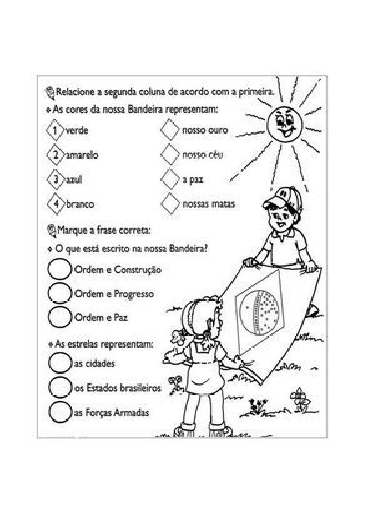 <p>Relacione segunda coluna de acordo com a primeira. As cores da nossa Bandeira representam: 1 verde nosso 2 nosso céu 3 azul a paz 4 branco nossas masas Marque a frase correta: que está escrito na nossa Ordem e Construção Ordem e Progresso Ordem e Paz As estrelas representam: as cidades os Estados brasileiros as Forças Armadas</p>
