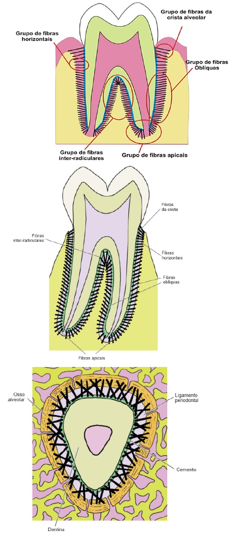 Periodontia Periodonto de Sustentação »Ligamento periodontal, Cemento radicular e Osso alveolar »Origem: folículo dentário »O cemento, o ligamento periodontal e o osso alveolar constituem uma unidade estrutural e funcional entre o dente e o alvéolo; »Têm a mesma origem ectomesenquimal do folículo »Feixes de fibras colágenas do ligamento se inserem no cemento e no osso alveolar, formando as fibras de Sharpey Ligamento periodontal »Tecido conjuntivo denso, não mineralizado, altamente vascularizado e inervado »Feixes espessos de fibras colágenas (fibras principais do ligamento periodontal). Ligam o dente ao osso e ao cemento radicular »Funções: •Físicas: promover articulação entre o dente e o alvéolo e amortecer as forças mastigatórias •Formadoras: síntese de tecido ósseo e cemento •Sensorial: receptores proprioceptivos • Nutritiva: irrigação sanguínea (cemento e osso alveolar) »Origem: células mesenquimais indiferenciadas (região central do folículo dentário) »Constituição: •Células: fibroblastos, células ectomesenquimais indiferenciadas, restos epiteliais de malassez, cementoblastos, osteoblastos e osteoclastos •Matriz extracelular (MEC): fibras principais do LP, fibras secundárias do LP, fibras oxitalânicas e substância fundamental amorfa »Fibroblastos •Alongada e fusiforme (núcleo ovóide e processos citoplasmáticos) •Disposição - longo eixo paralelo aos feixes das fibras colágenas •Função: formação e destruição das fibras colágenas »Células ectomesenquimais indiferenciadas •Morfologia:pequenas fusiformes =~ fibroblastos inativos localização: próximo aos vasos sanguíneos •Função: diferenciação de novas células (natureza conjuntiva) -Fibroblastos -Cementoblastos -Osteoblastos »Restos epiteliais de malassez •Grupos de células epiteliais: desintegração da bainha epitelial de Hertwig •Morfologia: redonda ou poligonal núcleo esférico e central •Localização: próximo ao cemento •Origem: Cisto periodontal lateral (terço médio ou cervical) Cisto radicular (terço apical) »Fibras principais do ligamento periodontal (colágeno I) •Grupo de fibras da crista alveolar •Grupo de fibras horizontal •Grupo de fibras oblíquas •Grupo de fibras apicais •Grupo de fibras inter-radiculares »Fibras de Sharpey •Porções mineralizadas das fibras do ligamento periodontal »Fibras secundárias do ligamento periodontal; elásticas e oxitalânicas •Confinadas na região perivascular; regulam o fluxo sanguíneo »Substância fundamental amorfa •Proteoglicanos •Glicosaminoglicanos •Glicoproteínas •Alguns lipídeos •Grande quantidade de água (amortecimento das forças mastigatórias) Cemento radicular »Tecido conjuntivo mineralizado especializado (recobre a dentina radicular e pequenas porções do esmalte) »Função: inserção das fibras do ligamento periodontal e da gengiva »O cemento não é uma estrutura dentária. »Constituição: •60%- matriz inorgânica (componente mineral) (cristais de hidroxiapatita) •40% - matriz orgânica (fibras colágenas - colágeno do tipo I) (células cementoblastos e cementócitos) »Não possui vasos sanguíneos e linfáticos / nervos / remodelação e reabsorção fisiológicas »Depende do ligamento periodontal para se nutrir (por difusão) »Apresenta deposição contínua, ou seja, cresce lentamente por toda vida »Espessura variável: < terço cervical da raiz (muito fino) > terço apical da raiz (mais espesso) »Origem: células ectomesenquimais (região periférica do folículo dentário) »Tipos de cemento -Cemento primário ou acelular •associação com a forma da raiz •antes da erupção do dente -Cemento secundário ou celular •durante e após (erupção do dente) •resposta a demandas funcionais »Classificação de Schroeder e Page •Acelular afibrilar •Acelular fibrilar •Celular com fibras intrínsecas •Celular com fibras mistas •Cemento acelular afibrilar •Cemento acelular com fibras extrínsecas •Cemento celular com fibras intrínsecas •Cemento celular misto estratificado •Acelular afibrilar: esse cemento é principalmente composto de matriz mineralizada, sem fibras colágenas detectáveis ou cementócitos. É produzido exclusivamente por cementoblastos e é tipicamente encontrado como cemento coronal em dente humano •Importância da perda do cemento primário ou acelular: a exposição da porção cervical da raiz resulta na perda da fina camada de cemento acelular, ocasionando a exposição de dentina com consequente hipersensibilidade da região »Espessura do cemento radicular: •Mais delgado na idade jovem e bem mais espesso na idade avançada •11 à 20 anos: 50um na linha amelocementária e 200um na região de ápice •70 anos: 130um na linha amelocementária e 500um na região de ápice »Tipos celulares do cemento •Cementoblastos •Cementócitos •Fibroblastos do ligamento periodontal •Odontoclastos (cementoclastos) »Cementoblastos •Função: síntese de matriz orgânica do cemento •Semelhante aos fibroblastos se originam de células ectomesenquimais do folículo dentário e de celulas indiferenciadas do ligamento periodontal •Podem ser encontrados como: -Cementoblastos ativos: arredondada ou ovalada (citoplasma ↑ basofílico) / maior número de organela -Cementoblastos em repouso: achatada/ menor número de organelas (cementócitos) »Cementócitos •Cementócitos aprisionados na matriz mineralizada Interior de lacunas •Numerosos prolongamentos citoplasmático (canalículos) »Junção amelocementária •60%cemento recobre parte do esmalte (+comum) •30%: união bordo a bordo (cemento e o esmalte) •10%: o cemento e o esmalte não se encontram •Importância clínica: por constituir a separação anatômica entre a coroa e a raiz do dente, o limite amelocementário é importante no diagnóstico periodontal, medidas para determinar o aumento de volume da gengiva e/o