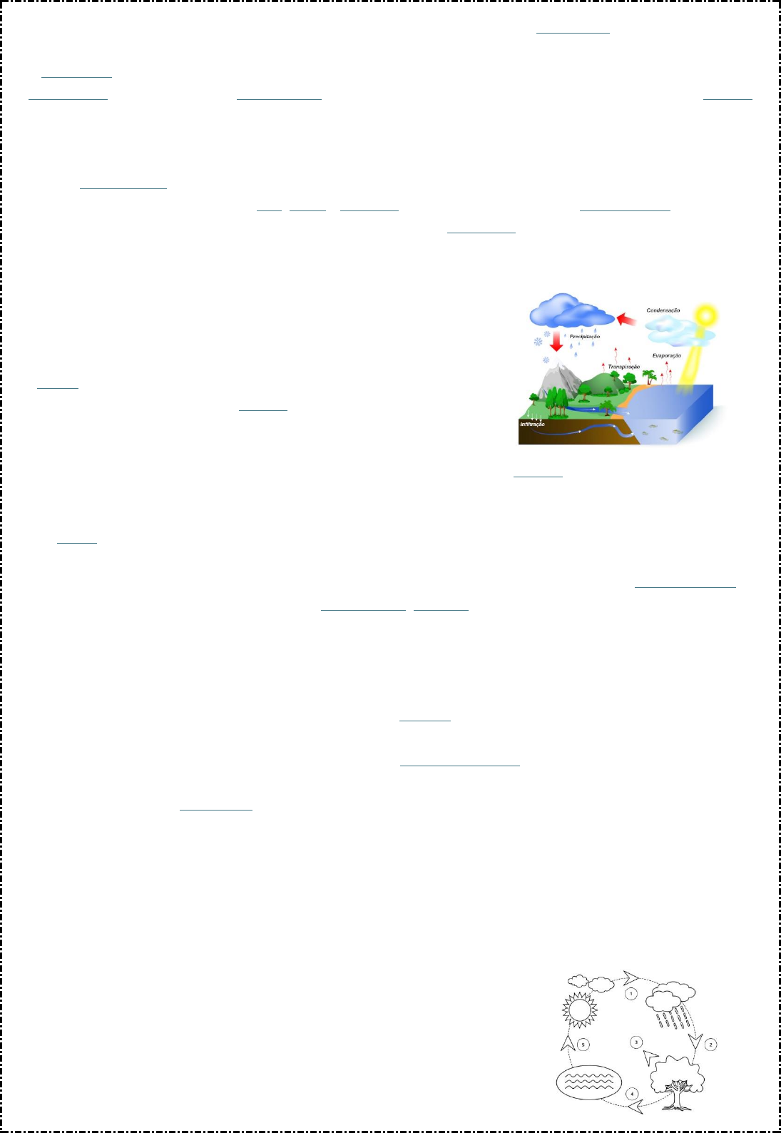 <p>O ciclo da água é fundamental para garantir que a água circule pelos seres vivos e pelo meio ambiente.</p><p>Esse ciclo permite que a água seja disponibilizada para diversos processos e, posteriormente, possa</p><p>ser reutilizada. Dentre os principais processos que ocorrem no ciclo da água, podemos destacar</p><p>a evaporação da água devido à ação do Sol, a condensação do vapor de água e a formação das nuvens e</p><p>precipitação.</p><p>Etapas do ciclo da água</p><p>A energia solar funciona como um grande motor para a ocorrência do ciclo da água. É essa energia que</p><p>provoca a evaporação da água dos rios, lagos e oceanos. O Sol também promove a transpiração das plantas e</p><p>dos animais. O vapor de água liberado nesses processos fica na atmosfera e sobe para camadas mais altas. Em</p><p>grandes altitudes, a temperatura local é mais baixa, fazendo com que o vapor de água condense-se e forme as</p><p>nuvens.</p><p>Observe as principais etapas do ciclo da água.</p><p>Diferentemente do que muitos pensam, as nuvens nada</p><p>mais são do pequenas gotículas de água. Com o tempo, a nuvem</p><p>torna-se cada vez mais carregada, até que a água cai em forma</p><p>de chuva (precipitação). Vale destacar também que a água pode</p><p>ser liberada na forma de neve ou granizo.</p><p>A chuva, ao atingir a superfície terrestre, pode seguir</p><p>diferentes caminhos. A água pode, por exemplo, acumular-se em</p><p>rios, lagos e oceanos, e também se infiltra no solo, tornando-se parte dos lençóis subterrâneos.</p><p>A água presente na superfície terrestre pode também ser usada pelos seres vivos. Os animais, por</p><p>exemplo, utilizam-na para sua hidratação. As plantas, por sua vez, fazem-no por meio da sua absorção</p><p>pelas raízes que possuem.</p><p>A água utilizada por esses seres vivos retorna para o ambiente posteriormente. Além da</p><p>transpiração, os animais podem devolvê-la ao ambiente pela urina, fezes, respiração e decomposição. As</p><p>plantas também liberam a água por meio da transpiração, gutação (eliminação da água no estado líquido pela</p><p>planta) e decomposição.</p><p>Importância do ciclo da água</p><p>O ciclo da água é importante, pois garante que a água circule constantemente pelo nosso planeta.</p><p>Imagine, por exemplo, que os animais consumissem-na, mas que ela não retornasse ao meio. Com o tempo,</p><p>essa importante substância não existiria mais no nosso planeta e, consequentemente, não haveria mais vida.</p><p>Como sabemos, a água é fundamental para qualquer ser vivo, uma vez que ela faz parte da composição do seu</p><p>corpo, ajuda no transporte de substâncias e participa de reações químicas importantes.</p><p>Não podemos esquecer-nos de que o ciclo da água é fundamental também para a economia. A</p><p>produção de energia e a agricultura, por exemplo, são dois ramos da economia extremamente dependentes das</p><p>chuvas.</p><p>Atividade sobre o ciclo da água</p><p>Agora que você já aprendeu um pouco mais a respeito do ciclo da água, observe o desenho apresentado</p><p>a seguir e tente identificar as etapas que estão indicadas pelos números. A resposta correta para cada</p><p>número será apresentada após o desenho.</p><p>Observe atentamente a figura e tente identificar os processos representados pelos números.</p><p>Conseguiu identificar todos os processos? Confira a resposta da atividade proposta:</p><p>1- Condensação</p><p>2- Precipitação</p><p>3- Transpiração</p><p>4- Infiltração</p><p>5- Evaporação</p><p>https://escolakids.uol.com.br/ciencias/seres-vivos-e-seres-naovivos.htm</p><p>https://escolakids.uol.com.br/ciencias/reaproveitamento-agua.htm</p><p>https://escolakids.uol.com.br/ciencias/tipos-de-vaporizacao.htm</p><p>https://escolakids.uol.com.br/ciencias/a-importancia-do-sol-para-os-seres-vivos.htm</p><p>https://escolakids.uol.com.br/geografia/nuvens.htm</p><p>https://escolakids.uol.com.br/geografia/energia-solar.htm</p><p>https://escolakids.uol.com.br/ciencias/os-rios.htm</p><p>https://escolakids.uol.com.br/geografia/lagos.htm</p><p>https://escolakids.uol.com.br/geografia/oceanos.htm</p><p>https://escolakids.uol.com.br/ciencias/respiracao-e-transpiracao-nos-vegetais.htm</p><p>https://escolakids.uol.com.br/geografia/atmosfera-terrestre.htm</p><p>https://escolakids.uol.com.br/geografia/chuva.htm</p><p>https://escolakids.uol.com.br/geografia/granizo.htm</p><p>https://escolakids.uol.com.br/geografia/lencol-freatico.htm</p><p>https://escolakids.uol.com.br/ciencias/tipos-de-raizes.htm</p><p>https://escolakids.uol.com.br/ciencias/importancia-da-decomposicao.htm</p><p>https://escolakids.uol.com.br/ciencias/respiracao-e-transpiracao-nos-vegetais.htm</p><p>https://escolakids.uol.com.br/ciencias/gutacao.htm</p><p>https://www.google.com/url?client=internal-element-cse&cx=010178560479257371445:ypyfp8mkmny&q=https://escolakids.uol.com.br/geografia/terra.htm&sa=U&ved=2ahUKEwjUvaqtlbbpAhVcGLkGHRqmAkYQFjAAegQIARAB&usg=AOvVaw1nSsnQPZkSY-3vfklSiZU5</p><p>https://escolakids.uol.com.br/ciencias/transformacoes-quimicas.htm</p><p>https://escolakids.uol.com.br/geografia/agricultura.htm</p>