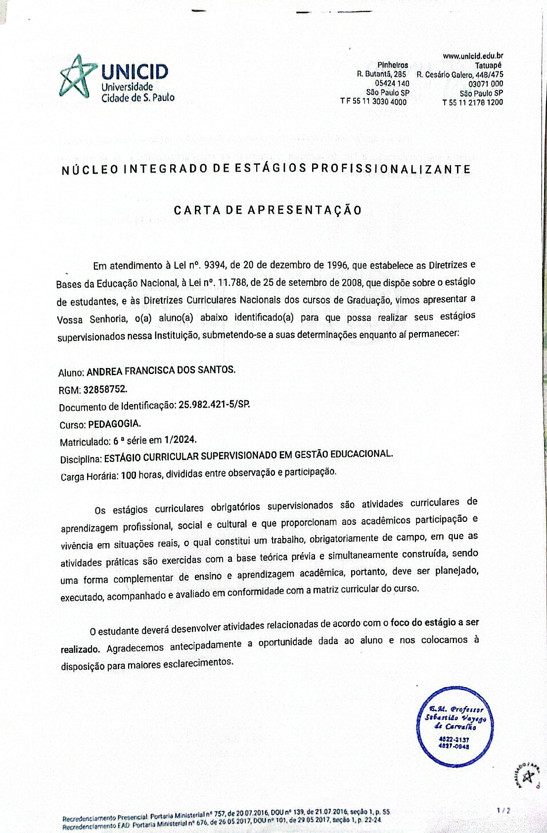 <p>www.unicid.edu.br Pinheiros UNICID Tatuapé R. 285 R. Galero, 448/475 Universidade 05424 140 03071 000 São Paulo SP Cidade de S. Paulo São Paulo SP T F 55 11 3030 4000 T 55 11 2178 1200 DE ESTÁGIOS CARTA DE APRESENTAÇÃO Em atendimento à Lei 9394, de 20 de dezembro de 1996, que estabelece as Diretrizes e Bases da Educação Nacional, à Lei 11.788, de 25 de setembro de 2008, que dispõe sobre o estágio de estudantes, e às Diretrizes Curriculares Nacionais dos cursos de Graduação, vimos apresentar a Vossa Senhoria, o(a) aluno(a) abaixo identificado(a) para que possa realizar seus estágios supervisionados nessa Instituição, submetendo-se a suas determinações enquanto aí permanecer: Aluno: ANDREA FRANCISCA DOS SANTOS. RGM: 32858752. Documento de Identificação: 25.982.421-5/SP. Curso: PEDAGOGIA. Matriculado: série em 1/2024. Disciplina: ESTÁGIO CURRICULAR SUPERVISIONADO EM GESTÃO EDUCACIONAL. Carga Horária: 100 horas, divididas entre observação e participação. Os estágios curriculares obrigatórios supervisionados são atividades curriculares de aprendizagem profissional, social e cultural e que proporcionam aos acadêmicos participação e vivência em situações reais, o qual constitui um trabalho, obrigatoriamente de campo, em que as atividades práticas são exercidas com a base teórica prévia e simultaneamente construída, sendo uma forma complementar de ensino e aprendizagem acadêmica, portanto, deve ser planejado, executado, acompanhado e avaliado em conformidade com a matriz curricular do curso. estudante deverá desenvolver atividades relacionadas de acordo com o foco do estágio a ser realizado. Agradecemos antecipadamente a oportunidade dada ao aluno e nos colocamos à disposição para maiores Professor 4822-2137 Recredenciamento Presencial Portaria Ministerial 757, de 20 DOU 139, de seção 1, p. 55 Recredenciamento EAD Portaria Ministerial n° 676, de 26 05 2017, DOU n° 101, de 29 05 2017, seção 1, 22-24</p><p>UNICID FSG Cruzeiro do Sul Virtual Centro UNIPÊ Universidade Cidade de S. Paulo Universitário Educação a distância Centro Universitário de João Pessoa Universidade Cruzeiro do Sul UNIFRAN Braz Cubas Universidade Universidade de Franca Centro Universitário POSITIVO GERÊNCIA DE GRADUAÇÃO EAD E EDUCAÇÃO PROFISSIONAL E GERÊNCIA DE SUCESSO DO ALUNO & RELACIONAMENTO ACADÊMICO DE POLOS EAD NÚCLEO INTEGRADO DE ESTÁGIOS PROFISSIONALIZANTE-EAD - NIEP-EAD CREDENCIAMENTO - 2024/1 Nome da escola/Instituição: Escola Professor Vayego Carvalho Nível de Ensino: Ensino Educação Telefone fixo da escola: (DDD) E-mail: gmail com ( ) Pública ( ) Privada Ilmo(a). Sr.(a) Diretor(a)/Gestor(a) Em atendimento à Lei 9394, de 20 de dezembro de 1996, que estabelece as Diretrizes e Bases da Educação Nacional, à Lei n°. 11.788, de 25 de setembro de 2008, que dispõe sobre o estágio de estudantes, e às Diretrizes Curriculares Nacionais dos cursos de Graduação, vimos solicitar a Vossa Senhoria, autorização para que o aluno abaixo identificado possa realizar seus estágios supervisionados nessa Instituição, submetendo-se a suas determinações enquanto aí permanecer. Aluno(a): Francisca do R.G: R.G.M.: Curso: em Pedagogia Estágio: Curricular em Educacional Pires , 14 de de 2024. do Santos Assinatura do aluno (a) Ma. Glara Vieira Teixeira Supervisão NIEP-EaD AUTORIZAÇÃO Eu, Mayara Fraccari Barboza Goncalves (Nome do(a) Gestor(a) ou responsável pela escola/instituição) Autorizo a realização do Estágio Supervisionado do(a) aluno(a) supra mencionado(a), nesta Unidade Escolar. Piris , 14 de marco de 2024. Professor Mayara Fraccari Barboza 4822-3137 4827-0948 Escolar CARIMBO DA ESCOLA Assinatura e do(a) Diretor(a)/Gestor(a) OBS: ESTA VIA DEVERÁ FICAR COM o ALUNO PARA SER POSTADA NO AMBIENTE VIRTUAL DE APRENDIZAGEM - AVA DEVIDAMENTE PREENCHIDA, CARIMBADA E ASSINADA.</p>