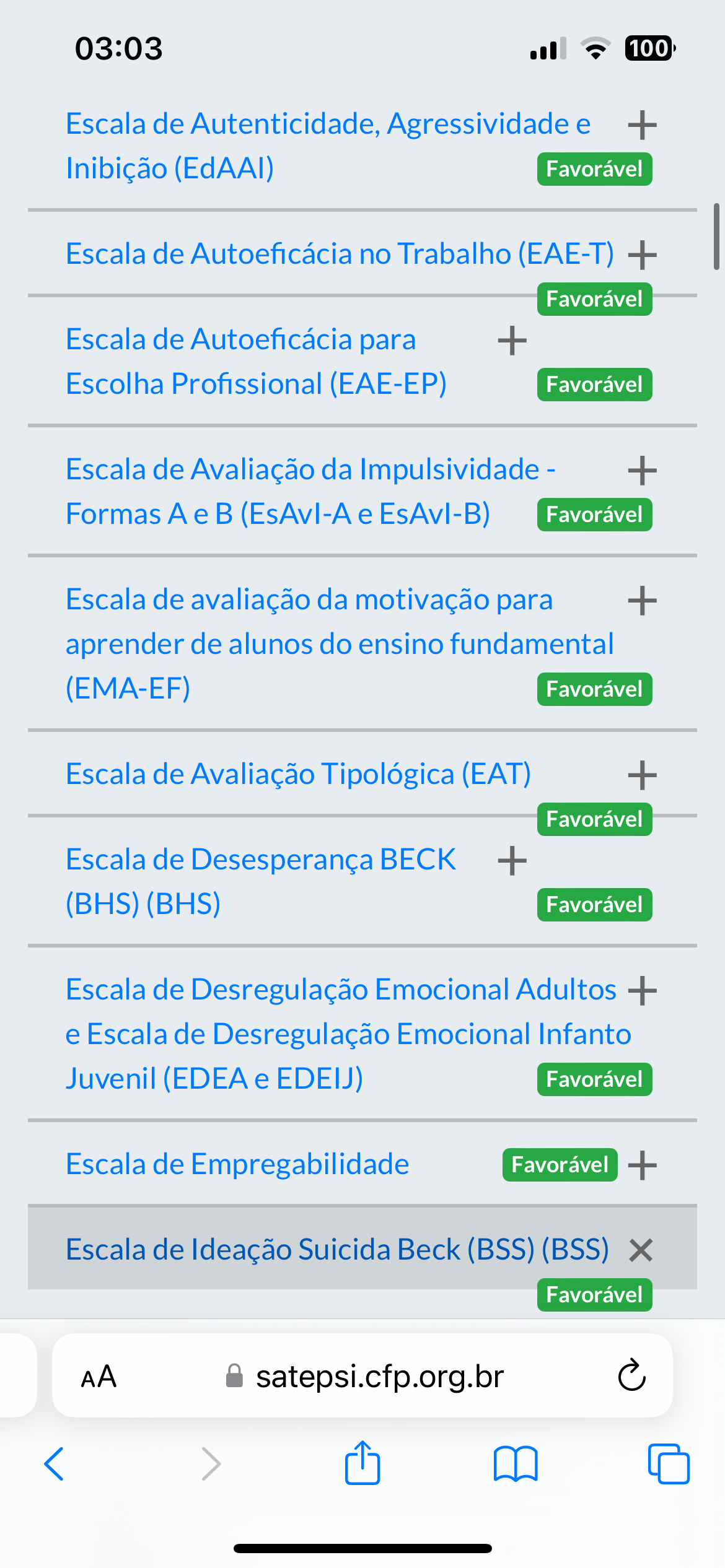 <p>03:03 100 Escala de Autenticidade, Agressividade e + Inibição Favorável Escala de Autoeficácia no Trabalho (EAE-T) + Favorável Escala de Autoeficácia para + Escolha Profissional (EAE-EP) Favorável Escala de Avaliação da Impulsividade - + Formas A e (EsAvl-A e EsAvl-B) Favorável Escala de avaliação da motivação para + aprender de alunos do ensino fundamental (EMA-EF) Favorável Escala de Avaliação Tipológica (EAT) + Favorável Escala de Desesperança BECK + (BHS) (BHS) Favorável Escala de Desregulação Emocional Adultos + e Escala de Desregulação Emocional Infanto Juvenil (EDEA e EDEIJ) Favorável Escala de Empregabilidade Favorável + Escala de Ideação Suicida Beck (BSS) (BSS) X Favorável AA satepsi.cfp.org.br</p>