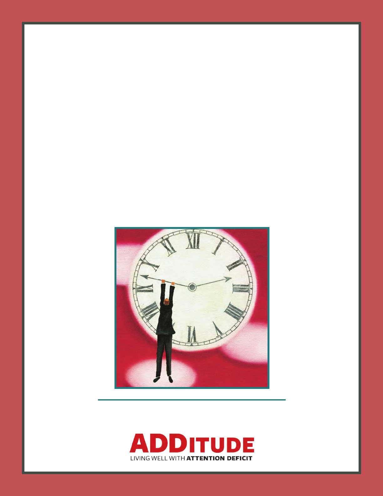 <p>From ADDitude’s Experts</p><p>Better Time</p><p>Management</p><p>with Adult</p><p>ADHD</p><p>19 ways to meet deadlines and get things done</p><p>TERMS OF USE</p><p>Copyright © 2013 by New Hope Media. All rights reserved. No part of this report may be reproduced or</p><p>transmitted in any form or by any means, electronic or mechanical, including photocopying, recording,</p><p>faxing, e-mailing, posting online, or by any information storage and retrieval system, without written</p><p>permission from the Publisher.</p><p>All trademarks and brands referred to herein are the property of their respective owners. All references</p><p>to ADDitude magazine, ADDitudeMag.com, and ADDConnect.com are trademarks of New Hope Media.</p><p>CONTACT INFORMATION</p><p>New Hope Media</p><p>1-646-366-0830</p><p>39 West 37th Street, 15th Floor</p><p>New York, NY 10018</p><p>LEGAL NOTICES</p><p>While all attempts have been made to verify information provided in this publication, neither the au-</p><p>thor nor the publisher assumes any responsibility for error, omissions, or contrary interpretations of the</p><p>subject matter contained herein.</p><p>The purchaser or reader of this publication assumes responsibility for the use of these materials and</p><p>information. Adherence to all applicable laws and regulations, both referral and state and local, govern-</p><p>ing professional licensing, business practices, advertising, and all other aspects of doing business in the</p><p>United States or any other jurisdiction, is the sole responsibility of the purchaser or reader. The author</p><p>and publisher assume no responsibility or liability whatsoever on the behalf of any purchaser or reader</p><p>of these materials. Any perceived slights of specific people or organizations are unintentional.</p><p>1</p><p>Here is your game plan for organizing and</p><p>finishing projects—big and small.</p><p>By Edward Hallowell, M.D., and Sandy Maynard, M.S.</p><p>9 Time Management Tips</p><p>from Dr. Ned Hallowell</p><p>R emember rotary telephones? I had to use one at the lakeside cot-</p><p>tage my family rented last summer, and, boy, was it irritating. That</p><p>old monster took forever to dial. OK, it took only 11 seconds (I timed it),</p><p>but that seemed an eternity in today’s fast-paced world. Which got me</p><p>thinking about why I found it so irritating to spend an entire 11 seconds</p><p>dialing a phone number! So what?</p><p>Without intending to, many people find they live in a rush they didn’t</p><p>create, or at least didn’t mean to create. Sometimes busy-ness is blissful.</p><p>But not if “busy” keeps you from doing what’s most important to you.</p><p>Here’s how to overcome this common malady:</p><p>1. Focus on what truly matters.</p><p>Don’t spread yourself too thin, and don’t get sidetracked. Remember,</p><p>cell phones, personal computers, and other high-tech gadgets enable</p><p>us to do more, but more is not necessarily better.</p><p>Better Time</p><p>Management</p><p>with Adult</p><p>ADHD</p><p>19 ways to meet deadlines and get things done</p><p>http://www.additudemag.com</p><p>http://www.additudemag.com/authorID/7.html</p><p>http://www.additudemag.com/adhd/article/765.html</p><p>http://www.additudemag.com/adhd/article/765.html</p><p>Better Time</p><p>Management</p><p>with Adult</p><p>ADHD</p><p>from the editors of</p><p>2</p><p>2. Create a positive emotional environment wherever you go.</p><p>Positive emotion is not a frill. It’s the on/off switch for effective</p><p>mental functioning. When you feel secure in your surroundings, you</p><p>think better, behave better, work better, and are better able to help</p><p>others. So do your best to build positive relationships. Always aim to</p><p>be friendly and upbeat.</p><p>3. Don’t waste time “screensucking.”</p><p>What’s that? It’s being glued to your TV or computer screen. Screen-</p><p>sucking interferes with the brain’s ability to focus. Whenever possible,</p><p>limit such electronic hypnosis to one hour a day.</p><p>4. Minimize distractions.</p><p>Things that distract you on a regular basis should be addressed. Keep</p><p>losing your glasses? Train yourself to put them in a special place. If</p><p>you’re distracted by magazines strewn about your kitchen, put a</p><p>basket in another room, and make sure the magazines get into it.</p><p>5. Delegate anything you’re not good at.</p><p>Is paying bills each month an irritant because you never manage to</p><p>send them in on time? Hand the job over to your spouse. If you’re not</p><p>married (or have a spouse who isn’t good at it, either), put as many</p><p>bills as possible on auto-pay.</p><p>Your goal is not to be independent, but to be effectively interdepen-</p><p>dent—that is, to share responsibilities for tasks with other people.</p><p>6. Slow down.</p><p>Periodically ask yourself why you’re in such a hurry, and take the</p><p>question seriously. If the answer is “because I’m late,” assess your</p><p>priorities and cut out unnecessary responsibilities. The time you save</p><p>should be devoted solely to personal or family time.</p><p>7. Think twice about multitasking.</p><p>Research shows that doing two things at once takes about 50 percent</p><p>longer than doing them sequentially. An exception to this rule: Some</p><p>people with ADD focus better if they do something essentially mind-</p><p>less while tackling an important task—for example, listening to music</p><p>or balancing on a ball while doing homework.</p><p>8. Invest your time for maximum return.</p><p>Not sure where the time goes? Create a chart, and record everything</p><p>you do. Maybe the chart indicates you’re spending too much time</p><p>looking for lost keys or nagging your teenage daughter to clean up</p><p>her room. Think of some creative ways to eliminate these (hanging a</p><p>key hook near the front door or deciding that her room doesn’t really</p><p>need to be clean, af