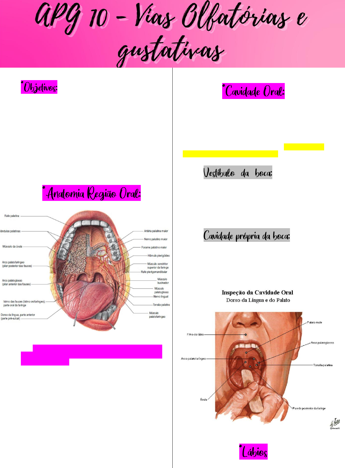 <p> Compreender a anatomia da região oral e</p><p>da cavidade nasal;</p><p> Entender a anatomia dos receptores e vias</p><p>olfatórias;</p><p> Estudar a anatomia do sistema gustatório;</p><p> Compreender a histologia da cavidade</p><p>nasal e faringe e do sistema gustatório;</p><p> Entender a fisiologia da olfação e da</p><p>gustação;</p><p>A região oral compreende a cavidade oral, os</p><p>dentes, a gengiva, a língua, o palato e a região das</p><p>tonsilas palatinas. (MOORE, 2019)</p><p>A cavidade oral consiste num local onde o</p><p>alimento é ingerido e preparado para a digestão no</p><p>estômago e no intestino delgado. Aos dentes, cabe</p><p>a função de triturar o alimento que juntamente com</p><p>a saliva proveniente das glândulas salivares,</p><p>formará um bolo alimentar macio. (DRAKE, 2019)</p><p>A deglutição é iniciada voluntariamente na</p><p>cavidade oral, através da qual, o bolo alimentar é</p><p>empurrado para a faringe através da atividade</p><p>sincronizada da língua e do palato mole, onde</p><p>ocorre a fase involuntária,ou seja, automática da</p><p>deglutição.</p><p>A cavidade oral é o local que o sabor dos</p><p>alimentos e das bebidas é percebido, onde o</p><p>alimento é mastigado e manipulado pela língua</p><p>para iniciar a deglutição.</p><p>-Ela possui duas partes principais: o vestíbulo da</p><p>boca e a cavidade própria da boca. (MOORE, 2019)</p><p> é uma região</p><p>semelhante a uma fenda, localizada entre</p><p>os dentes/gengiva e os lábios/bochechas.</p><p>Comunica-se com o meio externo através</p><p>da rima da boca, que é controlada pelos</p><p>músculos periorais (orbicular da boca,</p><p>bucinador, risório e os depressores e</p><p>elevadores dos lábios).</p><p> consiste no</p><p>espaço entre as arcadas dentárias superior</p><p>e inferior. O teto é formado pelo palato duro</p><p>e posteriormente é limitada pela parte oral</p><p>da faringe. Quando a boca está fechada e</p><p>em repouso, esta cavidade é totalmente</p><p>preenchida pela língua.</p><p>Os lábios são considerados pregas</p><p>musculofibrosas móveis que circundam a boca.</p><p>Estendem-se dos sulcos nasolabiais lateral e</p><p>superiormente até o sulco mentolabial</p><p>inferiormente.</p><p>São formados pelo músculo orbicular da boca.</p><p>Externamente são revestidos por pele e</p><p>internamente por túnica mucosa. Atuam como</p><p>válvulas da rima da boca, contendo o esfíncter</p><p>muscular que controla a entrada e a saída do</p><p>sistema digestório superior. (DRAKE, 2019)</p><p>Os principais objetivos dos lábios são:</p><p>apreender o alimento, sugar líquidos, manter o</p><p>alimento fora do vestíbulo da boca, atuar na</p><p>modulação da fala e na osculação (beijo).</p><p>As bochechas têm estrutura muito parecida</p><p>com a dos lábios. São as paredes móveis da</p><p>cavidade oral. Os principais músculos das</p><p>bochechas são os bucinadores. Superficialmente a</p><p>eles existem coleções de gordura encapsuladas,</p><p>chamados de corpos adiposos da bochecha. Em</p><p>lactentes, são proporcionalmente maiores para</p><p>reforçar a estrutura das bochechas e evitar o seu</p><p>colapso durante a sucção na amamentação. Alguns</p><p>adultos recorrem à retirada desses corpos</p><p>adiposos, por questões estéticas, no procedimento</p><p>conhecido como bichectomia. (MOORE, 2019)</p><p>São formadas por tecido fibroso recoberto por</p><p>túnica mucosa. A gengiva propriamente dita está</p><p>firmemente presa aos processos alveolares da</p><p>mandíbula, da maxila e aos colos dentários.</p><p>Normalmente, é vermelho-brilhante e não</p><p>queratinizada.</p><p>As principais funções dos dentes são:</p><p> Cortar, triturar, reduzir e misturar o alimento</p><p>à saliva durante a mastigação;</p><p> Ajudar na sustentação dos alvéolos</p><p>dentários e na proteção dos tecidos que os</p><p>sustentam;</p><p> Participar da articulação e modulação da</p><p>fala.</p><p>O dente fica inserido no alvéolo dental e é</p><p>descrito como decíduo (primário) ou permanente</p><p>(secundário). Crianças têm 20 dentes decíduos e os</p><p>adultos normalmente têm 32 dentes secundários.</p><p>Podem ser:</p><p> Incisivos: margens cortantes finas =</p><p>cortam</p><p> Caninos: cones proeminentes únicos =</p><p>perfuram</p><p> Pré-molares: possuem duas cúspides</p><p> Molares: possuem três cúspides</p><p>Os dentes são vascularizados pelas artérias</p><p>alveolares superior e inferior, ramos da artéria</p><p>maxilar, suprem os dentes maxilares e</p><p>mandibulares, respectivamente. São inervados por</p><p>ramos do nervo trigêmeo (quinto par de nervo</p><p>craniano). (MOORE, 2019)</p><p>O palato forma o teto curvo da boca e o</p><p>assoalho da cavidade nasal. Em sua porção oral, é</p><p>coberta por túnica mucosa e densamente povoada</p><p>por glândulas. Divide-se em:</p><p>-Palato duro:</p><p>Possui um formato côncavo, espaço onde a</p><p>língua fica em repouso. É formado por um</p><p>esqueleto ósseo, resultado dos processos palatinos</p><p>da maxila e as lâminas horizontais do palatino.</p><p>-Palato mole:</p><p>É o terço posterior e móvel do palato. Fica</p><p>suspenso posteriormente ao palato duro. Recebe</p><p>esse nome por não possuir nenhum esqueleto</p><p>ósseo, mas ter um reforço dado pela aponeurose</p><p>palatina, que o fixa no palato duro. (MOORE, 2019)</p><p>Em sua porção posteroinferior possui uma</p><p>margem livre curva da qual pende um processo</p><p>cônico, a úvula.</p><p>Durante a deglutição, o palato mole é</p><p>tensionado para permitir que a língua seja</p><p>pressionada sobre ele, o que leva o bolo alimentar</p><p>para a parte posterior da boca. Em seguida, o</p><p>palato mole se eleva para trás e para cima</p><p>(posterior e superiormente) contra a parede da</p><p>faringe, impedindo assim a entrada de alimentos</p><p>na cavidade nasal.</p><p>São massas de tecid