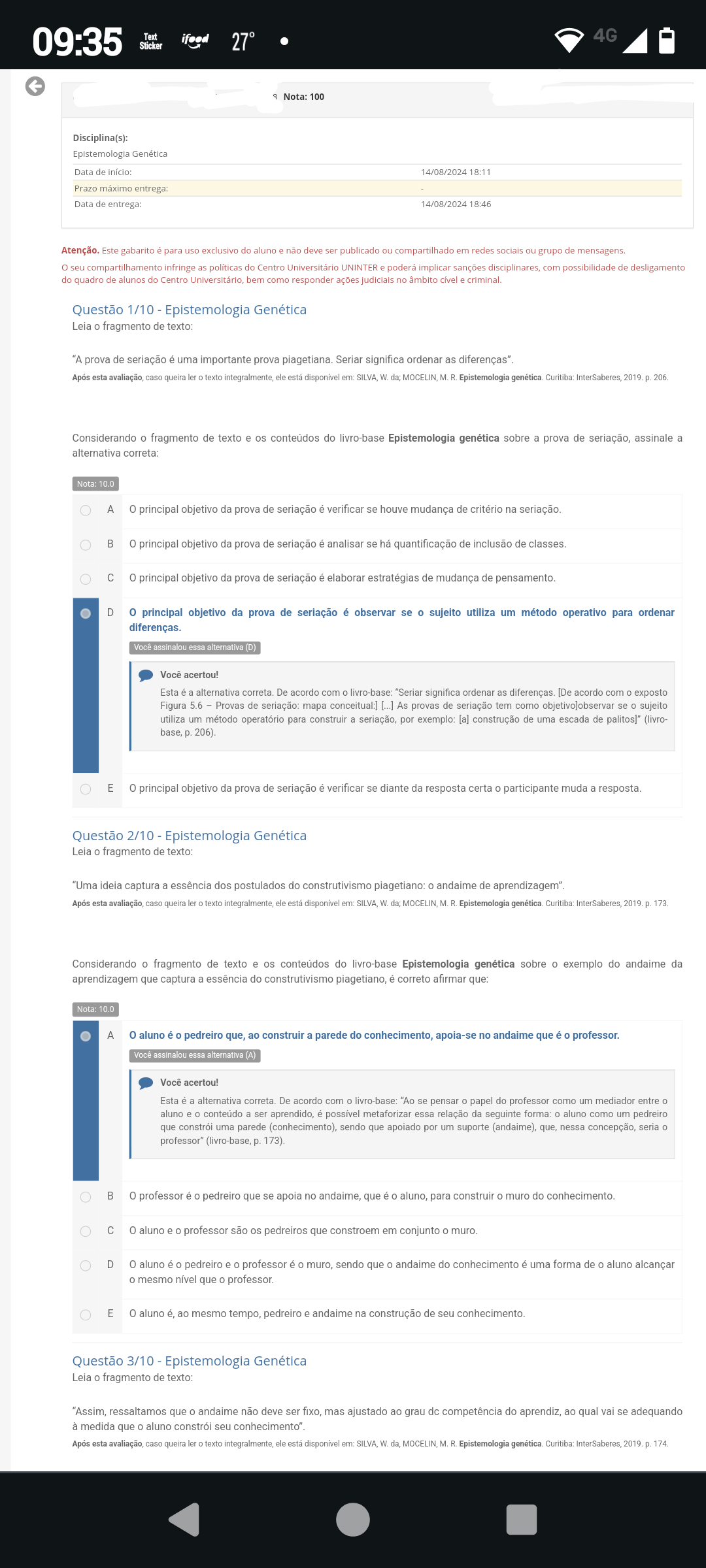 <p>09:35 Text Sticker 4G 8 Nota: 100 Disciplina(s): Epistemologia Genética Data de início: 14/08/2024 18:11 Prazo máximo Data de entrega 14/08/2024 18:46 Atenção. Este gabarito é para uso exclusivo do e não deve ser publicado ou compartilhado em redes sociais ou grupo de mensagens. seu compartilhamento infringe as políticas do Centro Universitário UNINTER e poderá implicar sanções disciplinares, com possibilidade de desligamento do quadro de alunos do Centro Universitário, bem como responder ações judiciais no âmbito civel e Questão 1/10 Epistemologia Genética Leia o fragmento de texto: "A prova de seriação é uma importante prova piagetiana. Serian significa ordenar as diferenças". Após esta caso queira ler texto integralmente, ele está disponível em: SILVA MOCELIN M. R. Epistemologia genética. InterSaberes 2019 p 206 Considerando o fragmento de texto e os conteúdos do livro-base Epistemologia genética sobre a prova de seriação, assinale a alternativa correta: Nota: 10.0 A o principal objetivo da prova de seriação é verificar se houve mudança de critério na seriação. B principal objetivo da prova de seriação é analisar se há quantificação de inclusão de classes C o principal objetivo da prova de seriação é elaborar estratégias de mudança de pensamento. D principal objetivo da prova de seriação é observar se o sujeito utiliza um método operativo para ordenar diferenças. Você assinalou essa alternativa (D) Você acertou! Esta é a alternativa De acordo com significa ordenar as diferenças. [De acordo com o exposto Figura - Provas de seriação: mapa [...] As provas de seriação tem como se o sujeito utiliza um método operatório para construir a seriação, por exemplo: [a] construção de uma escada de (livro- base, p. 206). E principal objetivo da prova de seriação é verificar se diante da resposta certa o participante muda a resposta. Questão 2/10 Epistemologia Genética Leia o fragmento de texto: "Uma ideia captura a essência dos postulados do construtivismo piagetiano: o andaime de Após esta caso queira ler texto integralmente, ele está disponível em: SILVA W da: MOCELIN R Epistemologia genética InterSaberes, Considerando fragmento de texto e os conteúdos do livro-base Epistemologia genética sobre exemplo do andaime da aprendizagem que captura a essência do construtivismo piagetiano, é correto afirmar que: Nota: 10.0 A aluno é o pedreiro que, ao construir a parede do conhecimento, apoia-se no andaime que é o professor. Você assinalou essa alternativa (A) Você acertou! Esta é a alternativa correta. De acordo com o livro-base: "Ao se pensar o papel do professor como um mediador entre o aluno e conteúdo a ser aprendido, é possível metaforizar essa relação da seguinte forma: aluno como um pedreiro que constrói uma parede (conhecimento), sendo que apoiado por um suporte (andaime), que, nessa concepção, seria (livro-base, p. 173). B professor é o pedreiro que se apoia no andaime, que é o aluno, para construir muro do C aluno e o professor são os pedreiros que constroem em conjunto muro. D 0 aluno é o pedreiro e o professor é o muro, sendo que o andaime do conhecimento é uma forma de o aluno alcançar o mesmo nível que o professor. E aluno ao mesmo tempo, pedreiro e andaime na construção de seu conhecimento. Questão 3/10 Epistemologia Genética Leia o fragmento de texto: "Assim, ressaltamos que o andaime não deve ser fixo, mas ajustado ao grau do competência do ao qual vai se adequando à medida que o aluno seu conhecimento". Após esta caso queira ler texto integralmente, ele está disponível em: SILVA da MOCELIN M R Epistemologia genética Curitiba: p 174</p>
