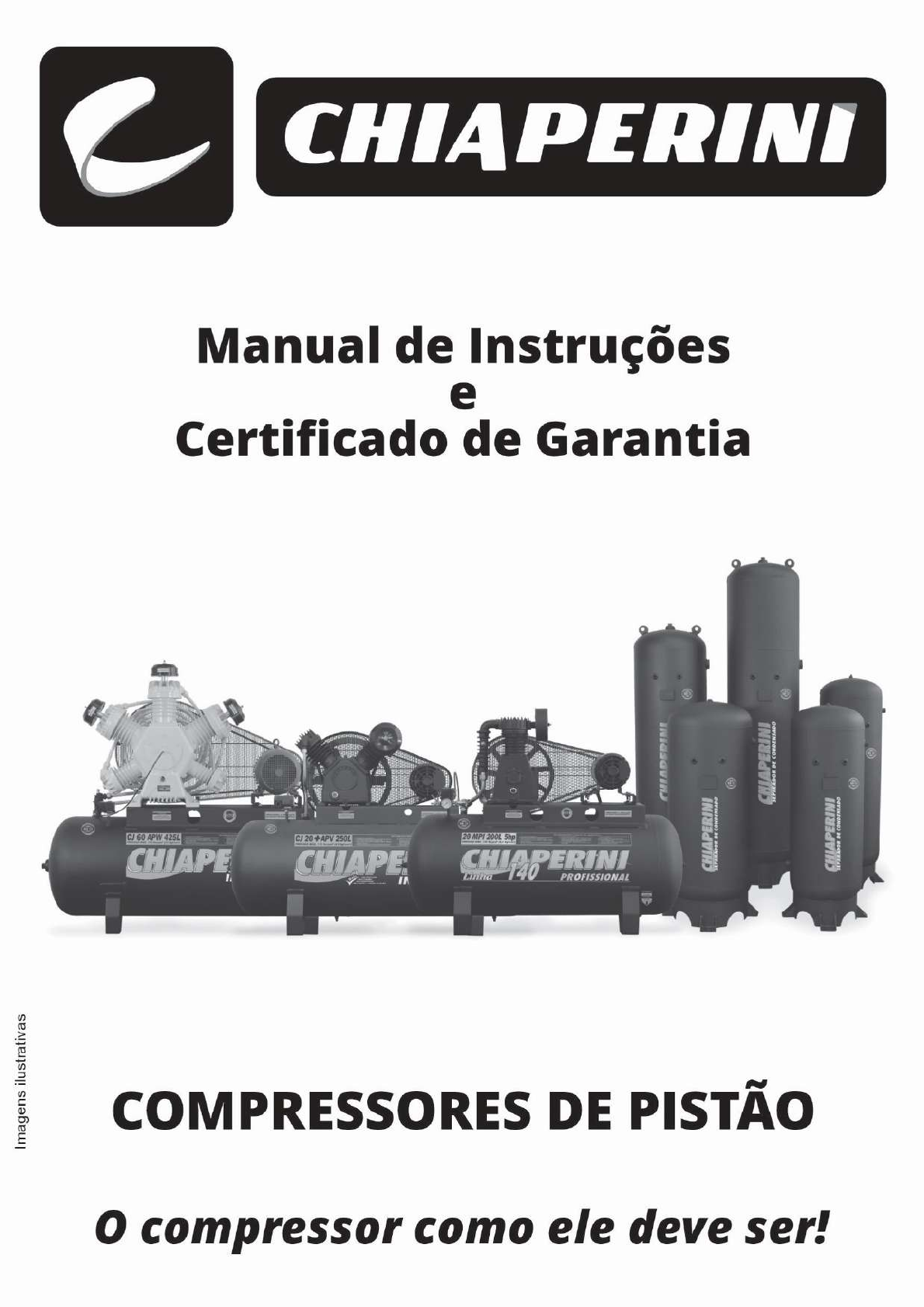 <p>CHIAPERINI Manual de Instruções e Certificado de Garantia 250L CHIAPERINI Linha PROFISSIONAL COMPRESSORES DE PISTÃO compressor como ele deve ser!</p><p>INTRODUÇÃO PARA A CORRETA UTILIZAÇÃO E INSTALAÇÃO DOS COMPRESSORES CHIAPERINI, RECOMENDAMOS A LEITURA COMPLETADESTE MANUAL. Este manual irá orientá-lo na instalação, uso seguro e manutenção preventiva do equipamento. Ocorrendo algum problema que não possa ser solucionado com as informações contidas neste manual, entre em contato com um dos nossos Assistentes Técnicos cadastrados em nosso Guia de Rede de Assistentes Técnicos que acompanha o produto, ou através do site Os compressores CHIAPERINI são fornecidos separadamente, sobre reservatório ou base, com ou sem motor, ou outras composições, conforme necessidade do cliente. Para compressores fornecidos sobre reservatório, é de responsabilidade do usuário final a instalação, inspeção, operação, manutenção do vaso de pressão de acordo com as recomendações da NR-13 do MTB e manter a documentação específica do Vaso de Pressão. prontuário do Vaso de Pressão faz parte da documentação obrigatória da norma NR - 13. Portanto, guarde-o em local seguro juntamente com o Manual de Instruções e demais documentos exigidos pela norma. Para melhor vida útil de seu equipamento utilize sempre óleo lubrificante CMP AW 150 e peças genuínas CHIAPERINI.</p><p>ÍNDICE 1 - INSPEÇÃO NO COMPRESSOR 6 2 - INSTRUÇÕES DE SEGURANÇA 6 3 - APLICAÇÃO 6 4 - INSTALAÇÃO 7 5 - COMPONENTES E FUNÇÕES 8 6 - INSTALAÇÃO ELÉTRICA 9 7 - ETAPAS PARA PARTIDA INICIAL 12 8 - VASO DE PRESSÃO 13 9 - RECOMENDAÇÃO AMBIENTAL 13 10 - MANUTENÇÃO PREVENTIVA 14 11 - VERIFICAÇÃO DE POSSÍVEIS FALHAS 15 12 - CARACTERÍSTICAS TÉCNICAS 16 13 - CERTIFICADO DE GARANTIA 18 14 - CONDIÇÕES GERAIS DE GARANTIA 18 15 - EXCLUSÃO DA GARANTIA 18 16 - ASSISTÊNCIA TÉCNICA 19 FICHA DE TROCA DE ÓLEO 20 TABELA DE REVISÕES 21</p><p>1 INSPEÇÃO NO COMPRESSOR 1.1 Inspecione e verifique se ocorreram danos causados pelo transporte. Em caso afirmativo, comunique a transportadora imediatamente. 1.2 Assegure-se de que todas as peças danificadas tenham sido substituídas e de que os problemas mecânicos e elétricos foram corrigidos, antes de operar o compressor de ar. 2 INSTRUÇÕES DE SEGURANÇA 2.1 AR COMPRIMIDO: Os compressores têm por finalidade a produção de ar comprimido de uso geral. Para aplicações específicas, o ar comprimido consumido deverá ser tratado conforme normas e regulamentações exigidas. 2.2 MANUTENÇÃO: compressor é um equipamento que liga e desliga automaticamente, portanto antes de qualquer manutenção este deverá estar desconectado da rede elétrica. 2.3 TENSÃO ELÉTRICA: Este produto contém componentes energizados. Para realizar 4 limpeza, ajustes e manutenção, sempre desconecte-o da rede elétrica eliminando o risco de choque elétrico. 2.4 RESERVATÓRIO E COMPONENTES SOB PRESSÃO: Sempre verifique os reservatórios de ar, pois se estiverem amassados ou oxidados podem causar explosão. operador sempre deverá fazer a drenagem através de uma válvula purgadora/dreno manual ou automática. 2.5 EPI: Sempre utilize equipamentos de proteção e segurança pois o fluxo de de saída poderá conter fragmentos e causar acidentes. Nunca direcione jato de ar comprimido no corpo. 2.6 SUPERFÍCIES QUENTES: Quando o produto está em operação, alguns componentes podem apresentar alta temperatura. Evite queimaduras graves, antes de manuseá-lo, desligue-o e aguarde a queda da temperatura destes componentes. 2.7 PEÇAS EM MOVIMENTO: compressor possuí partes girantes, nunca faça manutenções ou reparos com compressor em funcionamento ou conectado à rede elétrica. 2.8 PROTEÇÕES: Para utilizar o compressor mantenha as proteções na posição original e montadas corretamente. Esta deverá ser substituída caso esteja danificada. 3 APLICAÇÃO Os compressores de ar Chiaperini devem ser utilizados apenas para a compressão do ar atmosférico, até a pressão máxima indicada em sua plaqueta de identificação. 6</p><p>4 - INSTALAÇÃO 4.1 Todos os compressores e demais equipamentos de geração, tratamento e armazenamento de comprimido são máquinas que além de cuidados específicos também precisam de local próprio para instalação. 4.2 Prepare uma sala própria, coberta, ventilada, livre de raios solares, chuva, poeira ou qualquer outro tipo de poluição. Figura1 4.3 A temperatura ambiente máxima recomendada para trabalho é de 40°C. 4.4 Procure isolar os ruídos emitidos pelos equipamentos. Sala de máquinas Chave Rede de Ar Contatora Saída de Quente Entrada de Ar Entrada de FIGURA 1 4.5 Instalar o equipamento em uma distância mínima de 50 cm da parede com amortecedor de vibração adquirido pelo cliente. Figura 2 4.6 A casa de máquinas deverá ter uma base firme e nivelada de forma que suporte o peso do compressor. 4.7 Sempre que houver necessidade de acessar a sala de Saída de Ar máquinas, deve-se utilizar EPI's exigidos por lei, para sua Quente segurança. 4.8 Em serviços onde há necessidade do ar comprimido com Sugestão de Entrada qualidade requerida sem partículas de óleo ou pó, é de 50cm necessário a instalação de secador de e filtros especiais após o compressor ou próximo do ponto de consumo conforme norma NBR ISO 8573-1. 4.9 Verifique periodicamente o alinhamento entre o volante e a Entrada polia, o tensionamento da correia e o sentido de rotação. de Figura 4 e Figura 5 4.10 Recomendamos sempre a aplicação de proteção elétrica. Para motores a partir de 2CV, o acionamento deve ser através FIGURA 2 de chave contatora (Eletromagnética) com protetor térmico. Base nivelada Amortecedores tensão da correia INCORRETO INCORRETO CORRETO Verificar deflexão de acordo com as informações do fabricante de correia FIGURA 3 FIGURA 4 FIGURA 5 7</p><p>5 - COMPONENTES E FUNÇÕES Componentes de compressor sobre reservatório. 12.