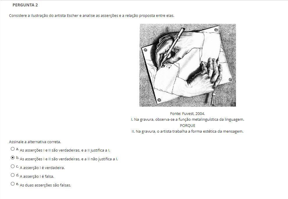 <p>PERGUNTA 2 Considere a ilustração do artista Escher e analise as asserções e a relação proposta entre elas. Fonte: 2004. I. Na gravura, observa-se a função metalinguística da linguagem. PORQUE II. Na gravura, o artista trabalha a forma estética da mensagem. Assinale a alternativa correta. a. As asserções I e são verdadeiras, e a II justifica b. As asserções I e II são verdadeiras, e a II não justifica al. A asserção I é verdadeira. d. A asserção é falsa. e. As duas asserções são</p>