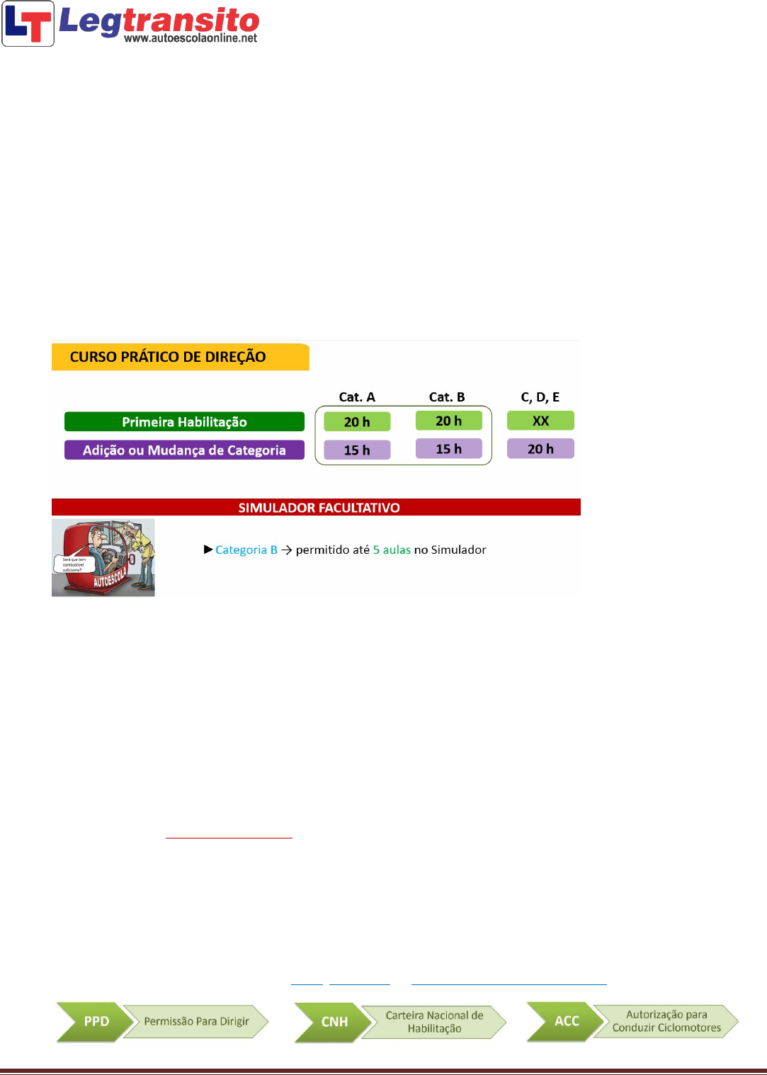 <p>Prof. Ronaldo Cardoso | e-mail: contato@autoescolaonline.net | Canww.YouTube.com/LegTransito 1</p><p>PROCESSO de HABILITAÇÃO</p><p>1. Pré-requisitos ao candidato à habilitação:</p><p>►Ser penalmente imputável – Pessoa que possa ser responsabilizada perante a Lei Penal;</p><p>►Ser alfabetizado - Não se exige grau de escolaridade. Basta que saiba ler e escrever;</p><p>►Possuir documento de identificação - RG, Carteira de Trabalho, Passaporte ou outro documento com foto;</p><p>►Possuir CPF.</p><p>Obs. O processo de habilitação tem duração de 12 meses, a contar da data de cadastro no sistema BINCO (Base Índice de</p><p>Condutores) e no RENACH (Registro Nacional de Condutores Habilitados).</p><p>2. Etapas do Processo de Habilitação:</p><p>►Avaliação Psicológica e Exames Físico e Mental;</p><p>►Curso Teórico Técnico (45 horas-aula) e Exame Teórico (70% de aproveitamento para aprovação)</p><p>►Curso Prático de Direção (20 horas-aula categoria inicial A ou B ou) e Exame de Direção.</p><p>3. ACC - Autorização para Conduzir Ciclomotores (Cinquentinhas):</p><p>a. Curso Teórico com 20 horas-aula e Prova Teórica com 15 questões → mínimo 60% para aprovação.</p><p>b. Curso Prático de Direção com 5 horas-aula e Prova de Direção, em motopista, conforme categoria A.</p><p>Obs. Em caso de reprovação em qualquer exame, a marcação poderá ser feita após 5 dias e se reprovado pela segunda vez,</p><p>poderá refazer o curso referente à etapa em que foi reprovado → o exame pode ser realizado em ciclomotor próprio.</p><p>4. LADV – Licença e Aprendizagem e Direção Veicular:</p><p>►Documento emitido ao candidato aprovado na primeira e segunda etapa do processo de habilitação - necessário para</p><p>treinamento da prática veicular.</p><p>Obs. O candidato que for flagrado treinando em desacordo com a legislação de trânsito, além das sanções previstas pelo</p><p>CTB, terá sua LADV suspensa por 6 meses. MACETE: Suspensa começa com “S” e Seis meses também.</p><p>5. Em qual categoria começar:</p><p>►O candidato poderá requerer as categorias A, B ou A e B simultaneamente, bem como a ACC.</p><p>Obs. Ao candidato aprovado em todas as etapas do processo, será conferida a PPD ou ACC provisória, com validade de 1</p><p>ano. Caso seja reprovado, poderá repetir o exame a qualquer tempo (na ACC o prazo para reexame é de 5 dias).</p><p>Obs. O portador da PPD ou ACC Provisória, poderá solicitar a habilitação definitiva, após 1 ano, desde que não tenha</p><p>cometido nenhuma infração de natureza grave, gravíssima ou reincidência em infrações médias.</p><p>Prof. Ronaldo Cardoso | e-mail: contato@autoescolaonline.net | Canww.YouTube.com/LegTransito 2</p><p>6. Outros tipos de veículos e suas definições:</p><p>►CICLOMOTOR: Veículo automotor de 2 ou 3 rodas, cuja cilindrada não exceda a 50 cm3, ou elétrico com máximo de 4 kW,</p><p>e velocidade máxima de 50 km/h → popular “cinquentinha”.</p><p>►MOTONETA: Veículo automotor de 2 rodas conduzido por condutor em posição sentada.</p><p>►MOTOCICLETA: Veículo automotor de 2 rodas conduzido por condutor em posição montada.</p><p>►TRICICLO: Veículo com estrutura mecânica similar às motocicletas, dotado de três rodas dispostas simetricamente, com</p><p>motor de propulsão com cilindrada superior a 50 cm3, conduzido por condutor e posição montada ou sentada.</p><p>►QUADRICICLO: Veículo automotor com estrutura mecânica similar às motocicletas, possuindo eixo dianteiro e traseiro,</p><p>dotado de quatro rodas, com massa em ordem de marcha NÃO superior a 400kg, ou 550kg no caso do veículo destinado ao</p><p>transporte de cargas e potência máxima NÃO superior a 15kW.</p><p>►BICICLETA ELÉTRICA: Veículo de duas rodas, impulsionado por um motor elétrico cuja potência não exceda a 350 Watts,</p><p>velocidade máxima de 25 km/h, funcionamento do motor somente ao pedalar e NÃO possui acelerador.</p><p>►VEÍCULO AUTOPROPELIDO: Equipamento de mobilidade individual NÃO equiparado ao ciclomotor ou bicicleta elétrica.</p><p>Velocidade máxima de 6 km/h para circular entre pedestres ou 20 km/h em ciclovias. Equipado com velocímetro, campainha</p><p>e sinalização noturna; dimensões NÃO superiores a de uma cadeira de rodas.</p><p>7. Renovação da Habilitação:</p><p>►Consiste em ser aprovado nos exames físico e mental (e psicológico se EAR), observando os seguintes prazos:</p><p>a. De 10 em 10 anos, para condutores com menos de 50 anos de idade;</p><p>b. De 5 em 5 anos, para condutores com idade entre 50 e 69 anos;</p><p>c. De 3 em 3 anos, para condutores com 70 anos ou mais;</p><p>d. A critério do médico avaliador, os prazos podem ser reduzidos, em razão de alguma anormalidade.</p><p>Obs. Para os condutores habilitados nas categorias C, D ou E é necessário passar por exame toxicológico.</p><p>8. Para que serve cada categoria de habilitação e quais os prazos de troca entre elas.</p><p>Prof. Ronaldo Cardoso | e-mail: contato@autoescolaonline.net | Canww.YouTube.com/LegTransito 3</p><p>9. Veículo utilizado para fazer exame em cada uma das categorias e ACC:</p><p>10. Habilitação para atividades remuneradas:</p><p>a. TRANSPORTE COLETIVO DE PASSAGEIROS:</p><p>►Categoria D ou E;</p><p>►Mínimo de 21 anos de idade;</p><p>►Curso de transporte coletivo de passageiros;</p><p>►Não ter cometido mais de uma infração gravíssima nos últimos 12 meses;</p><p>►Não estar sob efeito de Suspensão ou Cassação da CNH.</p><p>b. TRANSPORTE ESCOLAR:</p><p>►Categoria D ou E;</p><p>►Mínimo de 21 anos de idade;</p><p>►Curso de transporte escolar;</p><p>►Não ter cometido mais de uma infração gravíssima nos últimos 12 meses;</p><p>►Não estar sob efeito de Suspensão ou Cassação da CNH.</p><p>Obs. O veículo para este tipo de atividade deve possuir: Faixa amarela de 40 cm de largura; Registro como veículo de</p><p>