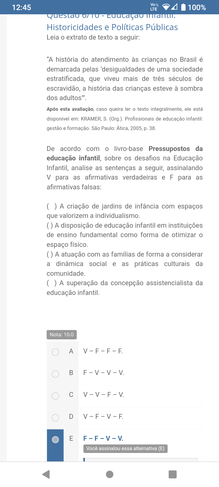 <p>12:45 LTE 100% Questao - Historicidades e Políticas Públicas Leia o extrato de texto a seguir: "A história do atendimento às crianças no Brasil é demarcada pelas "desigualdades de uma sociedade estratificada, que viveu mais de três séculos de escravidão, a história das crianças esteve à sombra dos adultos". Após esta avaliação, caso queira ler o texto integralmente, ele está disponível em: S. (Org.). Profissionais de educação infantil: gestão e formação. São Paulo: 2005, p. 38. De acordo com o livro-base Pressupostos da educação infantil, sobre os desafios na Educação Infantil, analise as sentenças a seguir, assinalando V para as afirmativas verdadeiras e F para as afirmativas falsas: ( ) A criação de jardins de infância com espaços que valorizem a individualismo. () A disposição de educação infantil em instituições de ensino fundamental como forma de otimizar o espaço físico. () A atuação com as famílias de forma a considerar a dinâmica social e as práticas culturais da comunidade. A superação da concepção assistencialista da educação infantil. Nota: 10.0 A B C D E Você assinalou essa alternativa (E)</p>
