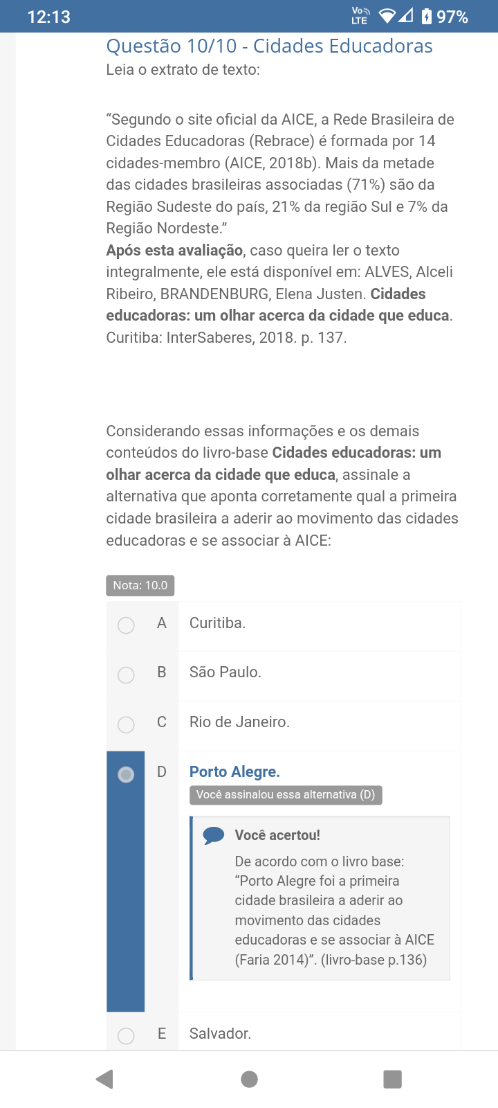 <p>12:13 LTE Questão 10/10 - Cidades Educadoras Leia o extrato de texto: "Segundo o site oficial da AICE, a Rede Brasileira de Cidades Educadoras (Rebrace) é formada por 14 cidades-membro (AICE, 2018b). Mais da metade das cidades brasileiras associadas (71%) são da Região Sudeste do país, 21% da região Sul e 7% da Região Nordeste." Após esta avaliação, caso queira ler o texto integralmente, ele está disponível em: ALVES, Alceli Ribeiro, BRANDENBURG, Elena Justen. Cidades educadoras: um olhar acerca da cidade que educa. Curitiba: InterSaberes, 2018. p. 137. Considerando essas informações e os demais conteúdos do livro-base Cidades educadoras: um olhar acerca da cidade que educa, assinale a alternativa que aponta corretamente qual a primeira cidade brasileira a aderir ao movimento das cidades educadoras e se associar à AICE: Nota: 10.0 A Curitiba. B São Paulo. C Rio de Janeiro. D Porto Alegre. Você assinalou essa alternativa (D) Você acertou! De acordo com o livro base: "Porto Alegre foi a primeira cidade brasileira a aderir ao movimento das cidades educadoras e se associar à AICE (Faria 2014)" (livro-base p.136) E Salvador.</p>