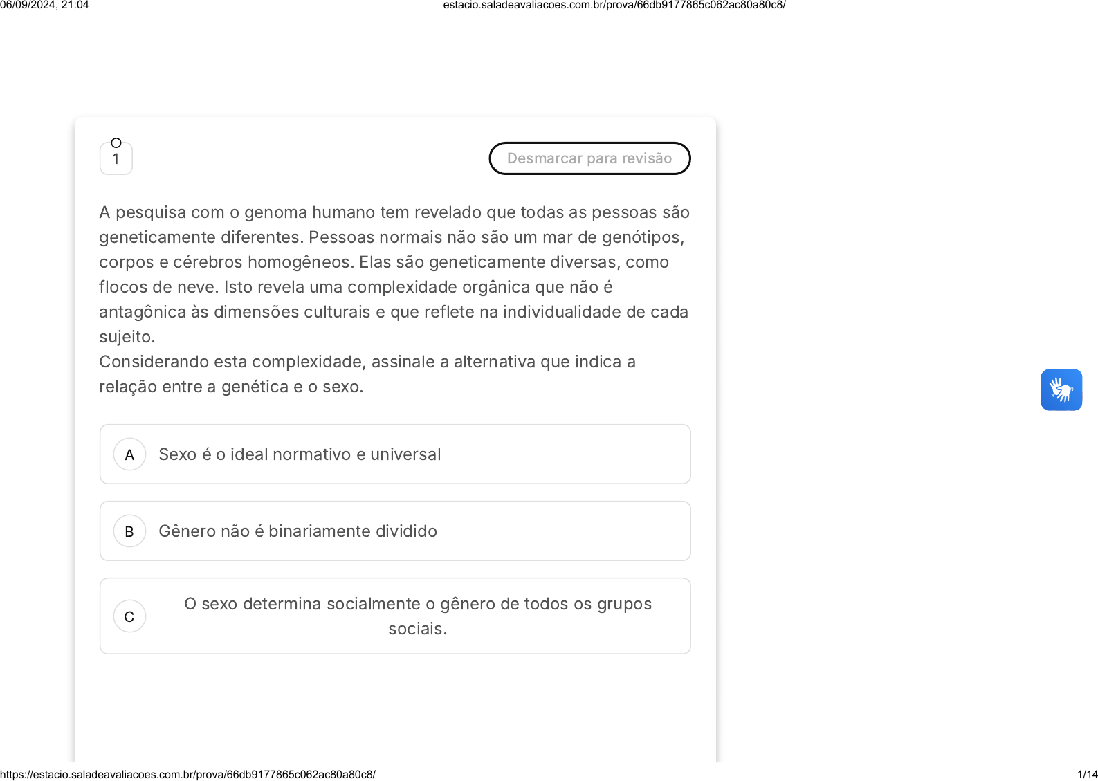<p>A</p><p>B</p><p>C</p><p>1 Desmarcar para revisão</p><p>A pesquisa com o genoma humano tem revelado que todas as pessoas são</p><p>geneticamente diferentes. Pessoas normais não são um mar de genótipos,</p><p>corpos e cérebros homogêneos. Elas são geneticamente diversas, como</p><p>flocos de neve. Isto revela uma complexidade orgânica que não é</p><p>antagônica às dimensões culturais e que reflete na individualidade de cada</p><p>sujeito.</p><p>Considerando esta complexidade, assinale a alternativa que indica a</p><p>relação entre a genética e o sexo.</p><p>Sexo é o ideal normativo e universal</p><p>Gênero não é binariamente dividido</p><p>O sexo determina socialmente o gênero de todos os grupos</p><p>sociais.</p><p>06/09/2024, 21:04 estacio.saladeavaliacoes.com.br/prova/66db9177865c062ac80a80c8/</p><p>https://estacio.saladeavaliacoes.com.br/prova/66db9177865c062ac80a80c8/ 1/14</p><p>D</p><p>E</p><p>Gênero é o resultado de uma série de características orgânicas</p><p>O gênero é a expressão do par cromossômico XX e XY.</p><p>2 Desmarcar para revisão</p><p>�IBADE/2019 - adaptado) Os limites simbólicos que definem o que é</p><p>considerado feminino ou masculino são permeados por relações de poder</p><p>que tendem a fixar o espaço social "adequado" para homens e mulheres.</p><p>Sobre Diversidade e Sexualidade, analise as afirmativas a seguir.</p><p>I. Definir o sexo de alguém é muito simples, já que o sexo é um conceito</p><p>biológico e tem a ver com os órgãos sexuais com que o indivíduo nasceu.</p><p>II. A sexualidade tornou-se um foco de atenção nas sociedades</p><p>disciplinares na elaboração de uma biopolítica que garantisse a produção</p><p>de corpos saudáveis, em nível individual, e produção de uma população</p><p>também saudável, em nível coletivo.</p><p>III. O termo "gênero" é uma forma de se referir às origens sociais e</p><p>biológicas das identidades subjetivas de homens e mulheres, ou seja, é</p><p>uma categoria, baseada na opção individual imposta sobre um corpo</p><p>sexuado.</p><p>Marque a alternativa que apresenta a(s) afirmativa(s) correta(s).</p><p>06/09/2024, 21:04 estacio.saladeavaliacoes.com.br/prova/66db9177865c062ac80a80c8/</p><p>https://estacio.saladeavaliacoes.com.br/prova/66db9177865c062ac80a80c8/ 2/14</p><p>A</p><p>B</p><p>C</p><p>D</p><p>E</p><p>As afirmativas I, II e III estão corretas.</p><p>Apenas as afirmativas II e III estão corretas.</p><p>Apenas as afirmativas I e II estão corretas.</p><p>Apenas a afirmativa II está correta.</p><p>Apenas a afirmativa I está correta.</p><p>3 Desmarcar para revisão</p><p>Segundo Oka e Laurenti: "O esforço de articulação das dimensões do</p><p>"sexo" - a natureza - e de "gênero" - a cultura - é bem ilustrado nas</p><p>pesquisas das ciências da saúde, que, não por acaso, é também um</p><p>campo marcado por uma multiplicidade disciplinar. Isso ocorre de maneira</p><p>mais evidente no ramo da saúde coletiva, que constitui um campo direto</p><p>de aplicação das ciências sociais e surge como uma proposta de</p><p>compromisso com problemas sociais, com políticas públicas em saúde e</p><p>com o Sistema Único de Saúde �SUS) no Brasil, sendo nítidos os traços</p><p>políticos e interventivos de seus estudos".</p><p>06/09/2024, 21:04 estacio.saladeavaliacoes.com.br/prova/66db9177865c062ac80a80c8/</p><p>https://estacio.saladeavaliacoes.com.br/prova/66db9177865c062ac80a80c8/ 3/14</p><p>OKA, M. & LAURENTI, C. Entre sexo e gênero: um estudo</p><p>bibliográfico[1]exploratório das ciências da saúde. Saúde Soc. São Paulo,</p><p>v.27, n.1, p.238�251, 2018.</p><p>Em função desses autores, julgue as afirmativas abaixo.</p><p>I. O processo social e educacional que apontava para a formação moral de</p><p>docentes se sustentava em pilares catolicistas e apontava para um corpo</p><p>puro e higienizado, ou seja, que tivesse sido purificado (proposta de</p><p>conversão cristã).</p><p>II. Nas quatro primeiras décadas do século XX prevaleceu o ideário romano</p><p>ortodoxo de educar corpos castos e vitoriosos, muitas vezes orientado</p><p>através de manuais de castidade e que muitas ordens religiosas chegaram</p><p>ao Brasil tendo como missão a educação.</p><p>III. Associada à formação docente está a cultura escolar de</p><p>disciplinamento do corpo. É preciso controlar os gestos, a forma de portar-</p><p>se e cobrir-se. É preciso tornar este corpo invisível, inexistente.</p><p>IV. As mudanças ocorridas desde os anos 60 marcaram o comportamento</p><p>feminino, sinalizando para o estabelecimento de uma nova ordem na</p><p>história das relações entre homens e mulheres contemporâneos.</p><p>Marque a alternativa que apresenta as afirmativas corretas.</p><p>06/09/2024, 21:04 estacio.saladeavaliacoes.com.br/prova/66db9177865c062ac80a80c8/</p><p>https://estacio.saladeavaliacoes.com.br/prova/66db9177865c062ac80a80c8/ 4/14</p><p>A</p><p>B</p><p>C</p><p>D</p><p>E</p><p>I, II, IV</p><p>II, III, IV</p><p>I, III</p><p>I, II, III</p><p>I, III, IV</p><p>4 Desmarcar para revisão</p><p>Sexo, sexualidade e gênero não são sinônimos. Onanismo é uma palavra</p><p>que deriva de Onan, um personagem da Bíblia que, segundo os relatos</p><p>encontrados, praticava o coito interrompido como método anticonceptivo.</p><p>Segundo diz a Bíblia, perante tais ações, Deus decidiu matar Onan. O seu</p><p>nome, por extensão à prática, passou a ser associado à masturbação, uma</p><p>vez que da mesma forma que o coito interrompido, considera-se que o</p><p>sêmen é desperdiçado e não é usado para procriar. Sendo assim, a</p><p>definição do termo Onanista.</p><p>06/09/2024, 21:04 estacio.saladeavaliacoes.com.br/prova/66db9177865c062ac80a80c8/</p><p>https://estacio.saladeavaliacoes.com.br/prova/66db9177865c062ac80a80c8/ 5/14</p><p>A</p><p>B</p><p>C</p><p>D</p><p>E</p><p>Representa uma figura secundária e periférica que vigoravam o</p><