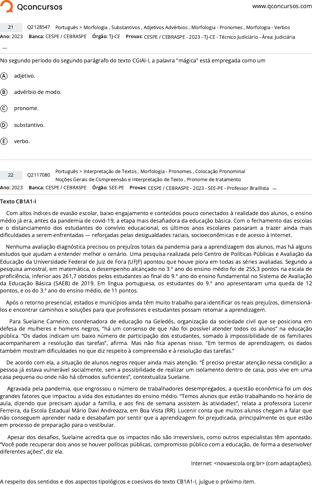 <p>www.qconcursos.com</p><p>Ano: 2023 Banca: CESPE / CEBRASPE Órgão: TJ-CE</p><p>No segundo período do segundo parágrafo do texto CGIAl-I, a palavra "mágica" está empregada como um</p><p>A adjetivo.</p><p>B advérbio de modo.</p><p>C pronome.</p><p>D substantivo.</p><p>E verbo.</p><p>Ano: 2023 Banca: CESPE / CEBRASPE Órgão: SEE-PE</p><p>Texto CB1A1-I</p><p>Com altos índices de evasão escolar, baixo engajamento e conteúdos pouco conectados à realidade dos alunos, o ensino</p><p>médio já era, antes da pandemia de covid-19, a etapa mais desa�adora da educação básica. Com o fechamento das escolas</p><p>e o distanciamento dos estudantes do convívio educacional, os últimos anos escolares passaram a trazer ainda mais</p><p>di�culdades a serem enfrentadas — reforçadas pelas desigualdades raciais, socioeconômicas e de acesso à Internet.</p><p>Nenhuma avaliação diagnóstica precisou os prejuízos totais da pandemia para a aprendizagem dos alunos, mas há alguns</p><p>estudos que ajudam a entender melhor o cenário. Uma pesquisa realizada pelo Centro de Políticas Públicas e Avaliação da</p><p>Educação da Universidade Federal de Juiz de Fora (UFJF) apontou que houve piora em todas as séries avaliadas. Segundo a</p><p>pesquisa amostral, em matemática, o desempenho alcançado no 3.º ano do ensino médio foi de 255,3 pontos na escala de</p><p>pro�ciência, inferior aos 261,7 obtidos pelos estudantes ao �nal do 9.º ano do ensino fundamental no Sistema de Avaliação</p><p>da Educação Básica (SAEB) de 2019. Em língua portuguesa, os estudantes do 9.º ano apresentaram uma queda de 12</p><p>pontos, e os do 3.º ano do ensino médio, de 11 pontos.</p><p>Após o retorno presencial, estados e municípios ainda têm muito trabalho para identi�car os reais prejuízos, dimensioná-</p><p>los e encontrar caminhos e soluções para que professores e estudantes possam retomar a aprendizagem.</p><p>Para Suelaine Carneiro, coordenadora de educação na Geledés, organização da sociedade civil que se posiciona em</p><p>defesa de mulheres e homens negros, “há um consenso de que não foi possível atender todos os alunos” na educação</p><p>pública. “Os dados indicam um baixo número de participação dos estudantes, somado à impossibilidade de os familiares</p><p>acompanharem a resolução das tarefas”, a�rma. Mas não �ca apenas nisso. “Em termos de aprendizagem, os dados</p><p>também mostram di�culdades no que diz respeito à compreensão e à resolução das tarefas.”</p><p>De acordo com ela, a situação de alunos negros requer ainda mais atenção. “É preciso prestar atenção nessa condição: a</p><p>pessoa já estava vulnerável socialmente, sem a possibilidade de realizar um isolamento dentro de casa, pois vive em uma</p><p>casa pequena ou onde não há cômodos su�cientes”, contextualiza Suelaine.</p><p>Agravada pela pandemia, que engrossou o número de trabalhadores desempregados, a questão econômica foi um dos</p><p>grandes fatores que impactou a vida dos estudantes do ensino médio. “Temos alunos que estão trabalhando no horário de</p><p>aula, dizendo que precisam ajudar a família, e aos �ns de semana assistem às atividades”, relata a professora Lucenir</p><p>Ferreira, da Escola Estadual Mário Davi Andreazza, em Boa Vista (RR). Lucenir conta que muitos alunos chegam a falar que</p><p>não conseguem aprender nada e desabafam por sentir que a aprendizagem foi prejudicada, principalmente os que estão</p><p>em processo de preparação para o vestibular.</p><p>Apesar dos desa�os, Suelaine acredita que os impactos não são irreversíveis, como outros especialistas têm apontado.</p><p>“Você pode recuperar dois anos se houver políticas públicas, compromisso público com a educação, de forma a desenvolver</p><p>diferentes ações”, diz ela.</p><p>Internet: <novaescola.org.br> (com adaptações).</p><p>A respeito dos sentidos e dos aspectos tipológicos e coesivos do texto CB1A1-I, julgue o próximo item.</p><p>21 Q2128547 >Português Morfologia , Substantivos , Adjetivos Advérbios , Morfologia - Pronomes , Morfologia - Verbos</p><p>Provas: CESPE / CEBRASPE - 2023 - TJ-CE - Técnico Judiciário - Área: Judiciária</p><p>...</p><p>22 Q2117080</p><p>>Português Interpretação de Textos , Morfologia - Pronomes , Colocação Pronominal</p><p>Noções Gerais de Compreensão e Interpretação de Texto , Pronome de tratamento</p><p>Provas: CESPE / CEBRASPE - 2023 - SEE-PE - Professor Braillista ...</p><p>https://www.qconcursos.com/</p><p>https://www.qconcursos.com/questoes-de-concursos/bancas/cespe-cebraspe</p><p>https://www.qconcursos.com/questoes-de-concursos/institutos/tj-ce</p><p>https://www.qconcursos.com/questoes-de-concursos/bancas/cespe-cebraspe</p><p>https://www.qconcursos.com/questoes-de-concursos/institutos/see-pe</p><p>https://www.qconcursos.com/questoes-de-concursos/questoes/77cc1e1f-e2</p><p>https://www.qconcursos.com/questoes-de-concursos/disciplinas/letras-portugues</p><p>https://www.qconcursos.com/questoes-de-concursos/disciplinas/letras-portugues/morfologia</p><p>https://www.qconcursos.com/questoes-de-concursos/disciplinas/letras-portugues/substantivos</p><p>https://www.qconcursos.com/questoes-de-concursos/disciplinas/letras-portugues/adjetivos</p><p>https://www.qconcursos.com/questoes-de-concursos/disciplinas/letras-portugues/adverbios</p><p>https://www.qconcursos.com/questoes-de-concursos/disciplinas/letras-portugues/morfologia-pronomes</p><p>https://www.qconcursos.com/questoes-de-concursos/disciplinas/letras-portugues/morfologia-verbos</p><p>https://www.qconcursos.com/questoes-de-concursos/provas/cespe-cebraspe-2023-tj-ce-tecnico-judiciario-area-judiciaria</p><p>https://www.qconcursos.com/questoes-de-concursos/questoes/7b98fc11-d9</p><p>https://www.qconcursos.com/questoes-de-concursos/disciplinas/letras-portugues</p><p>https://www.qconcursos.com/questoes-de-concursos/disciplinas/letras-portug