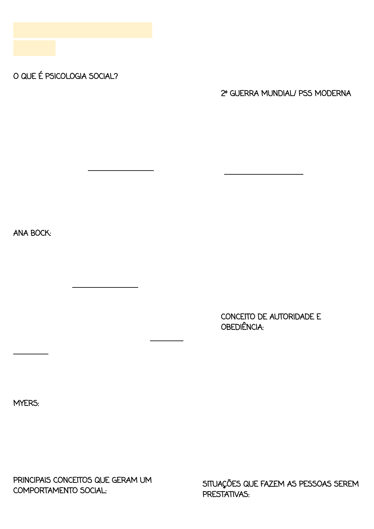 <p>Resum� Psicologi� Socia� � d�</p><p>Trabalh�</p><p>O QUE É PSICOLOGIA SOCIAL?</p><p>> É o ramo da psi. que foca na análise do</p><p>comportamento do indivíduo perante as suas</p><p>relações sociais , ela estabelece uma relação</p><p>entre psicologia, ciências sociais e humanas ,</p><p>tendo como objeto de estudo os grupos sociais</p><p>>De acordo com Aroldo Rodrigues, Eveline Asmar e</p><p>Bernardo Jablonski o ESTUDO CIENTÍFICO DA PSI.</p><p>SOCIAL é baseado na influência recíproca entre as</p><p>pessoas esse conceito recebe o nome de interação</p><p>social, enquanto o pensamento social é o processo</p><p>cognitivo gerado por essas interação</p><p>ANA BOCK:</p><p>>ela reforça a ideia de que não há um consenso</p><p>entre os autores sobre a definição de PSS. e que a</p><p>que existe é muito limitada</p><p>>ela estuda uma dimensão subjetiva dos</p><p>fenômenos os sociais (ex: violência, relações de</p><p>gêneros,comunicação, exclusão, preconceito</p><p>comportamento político, tem dimensões jurídicas,</p><p>étnicas, moral, sociológica) enquanto na dimensão</p><p>psicológica traz registros simbólicos e subjetivos</p><p>>resumindo é a dimensão subjetiva que compõem</p><p>o fenômeno social ,ou seja , o indivíduo como ser</p><p>social e histórico</p><p>MYERS:</p><p>>estuda as influências de nossas situações, como</p><p>vemos e afetamos uns aos outros</p><p>>cientificamente estudam como as pessoas</p><p>pensam , influenciam e se relacionam umas com</p><p>as outras(ex: psi das massas)</p><p>PRINCIPAIS CONCEITOS QUE GERAM UM</p><p>COMPORTAMENTO SOCIAL:</p><p>-subjetividade</p><p>-consciência</p><p>-identidade</p><p>- atitude</p><p>-percepção</p><p>-grupos sociais</p><p>2º GUERRA MUNDIAL/ PSS MODERNA</p><p>>dão maior atenção às doenças</p><p>mentais e a forma de lidar com elas</p><p>>busca nas relações dos indivíduos</p><p>com o mundo priorizar as questões</p><p>sociais e coletivas</p><p>>COGNITIVISMO SOCIAL: parte do</p><p>conhecimento do indivíduo podem</p><p>estar diretamente ligados a</p><p>observação dentro do contexto de</p><p>interações sociais, experiências e</p><p>influências externas da mídia</p><p>>nesse período começou o estudo das</p><p>normas sociais , atitudes , resolução</p><p>de conflitos e a explicação de</p><p>fenômenos como o altruísmo,</p><p>obediência e conformismo</p><p>CONCEITO DE AUTORIDADE E</p><p>OBEDIÊNCIA:</p><p>>é a tendência das pessoas a seguir</p><p>ordens de figuras de autoridade,</p><p>mesmo que essas ordens violem suas</p><p>próprias convicções éticas e morais.</p><p>(explicação prof)</p><p>>é quando você altera seu</p><p>comportamento porque uma figura</p><p>de autoridade te disse para fazer e</p><p>você entende isso como algo certo</p><p>porque ela dá várias justificativas</p><p>“plausíveis” dos seus atos</p><p>SITUAÇÕES QUE FAZEM AS PESSOAS SEREM</p><p>PRESTATIVAS:</p><p>>pensamento social: atitudes moldam e são</p><p>moldadas pelo comportamento</p><p>>influências sociais: moldam o</p><p>comportamento</p><p>>relações sociais: sentimentos e ações em</p><p>relação às pessoas às vezes são negativas ,</p><p>às vezes são positivas</p><p>>aplicando a PSS : vida cotidiana</p><p>PENSAMENTO E REALIDADE SOCIAL:</p><p>>IGUALDADE:: oferece o mesmo tratamento e</p><p>oportunidade a todos , sem qualquer tipo de</p><p>distinção</p><p>>EQUIDADE:garante que todos sejam</p><p>tratados com justiça , para aproveitarem as</p><p>mesmas oportunidades</p><p>>REALIDADE: uns são muito mais</p><p>beneficiados que os outros</p><p>CONSTRUÇÃO DE REALIDADE SOCIAL:</p><p>>reações diferentes geram pensamentos</p><p>diferentes</p><p>>realidade objetiva: refere-se a realidade dos</p><p>fatos como eles realmente são e não</p><p>baseados nas nossas crenças e valores</p><p>é a tendência das pessoas</p><p>a seguir ordens de figuras de autoridade,</p><p>mesmo que</p><p>essas ordens violem suas próprias convicções</p><p>éticas e</p><p>morais.</p><p>INTUIÇÃO:</p><p>>capacidade de entender , identificar ou</p><p>presumir sem um conhecimento empírico</p><p>>baseado nas nossas experiências</p><p>>ideia de que pode ser “eu acho”</p><p>>exerce grande influência no nosso</p><p>comportamento</p><p>>moldam o nossos medos, impressões e</p><p>relacionamentos</p><p>>nossas intuições por nós mesmo também</p><p>são falhas</p><p>>”quando há fatos não há intuição”</p><p>INFLUÊNCIAS SOCIAIS MOLDAM O NOSSO</p><p>COMPORTAMENTO?</p><p>>experimento Asher:Ele estudou a influência</p><p>da pressão do grupo na tomada de decisões</p><p>individuais. No experimento, os participantes</p><p>foram colocados em situações em que tinham</p><p>que escolher entre uma resposta correta e</p><p>uma resposta errada, e a maioria das vezes</p><p>acabavam seguindo a opinião do grupo,</p><p>mesmo que soubessem que a resposta estava</p><p>errada.</p><p>> a pressão social tem grande influência na</p><p>tomada de decisões</p><p>>tudo o que acontece nós reagimos , por conta</p><p>da pressão social podemos agir de modo</p><p>contrário a nossas próprias opiniões , podendo</p><p>induzir as pessoas a concordarem com a</p><p>falsidade ou consentir na crueldade</p><p>CULTURA E AS SITUAÇÕES:</p><p>.>nossos padrões sobre prontidão , fraqueza e</p><p>vestuário são baseados na cultura e</p><p>dependem de quando e onde você vive no</p><p>mundo</p><p>> a justiça social : depende de sua ideologia</p><p>FAKE NEWS:(HAZEL MARKUS)</p><p>>notícias com falsas baseadas em notícias</p><p>verdadeiras</p><p>>as pessoas são acima de tudo maleáveis</p><p>ATITUDE:</p><p>> são afirmações avaliadoras em relação a</p><p>objetos , pessoas ou eventos</p><p>>nossas atitudes internas afetam nosso</p><p>comportamento</p><p>PERSONALIDADE:</p><p>>atitude e personalidade influenciam o</p><p>comportamento</p><p>>você muda seu comp.</p><p>O COMPORTAMENTO É BIOLOGICAMENTE</p><p>ENRAIZA