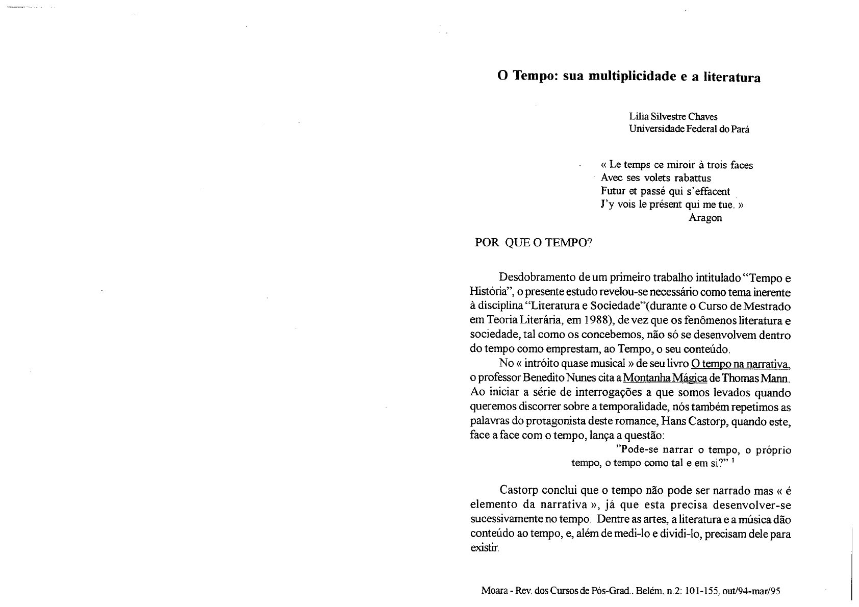 <p>O Tempo: sua multiplicidade e a literatura Lilia Silvestre Chaves Universidade Federal do Pará Le temps ce miroir à trois faces Avec ses volets rabattus Futur et passé qui s'effacent J'y vois le présent qui me tue. Aragon POR QUE O TEMPO? Desdobramento de um primeiro trabalho intitulado "Tempo e História", o presente estudo revelou-se necessário como tema inerente à disciplina "Literatura e o Curso de Mestrado em Teoria Literária, em 1988), de vez que os fenômenos literatura e sociedade, tal como os concebemos, não só se desenvolvem dentro do tempo como emprestam, ao Tempo, o seu conteúdo. No intróito quase musical de seu livro tempo na narrativa, o professor Benedito Nunes cita a Montanha Mágica de Thomas Mann. Ao iniciar a série de interrogações a que somos levados quando queremos discorrer sobre a temporalidade, nós também repetimos as palavras do protagonista deste romance, Hans Castorp, quando este, face a face com o tempo, lança a questão: "Pode-se narrar o tempo, o próprio tempo, o tempo como tal e em si?" 1 Castorp conclui que o tempo não pode ser narrado mas é elemento da narrativa já que esta precisa desenvolver-se sucessivamente no tempo. Dentre as artes, a literatura e a música dão conteúdo ao tempo, e, além de medi-lo e dividi-lo, precisam dele para Moara Rev. dos Cursos de n.2: 101-155. out/94-mar/95</p><p>102 Lilia Silvestre O Tempo: sua multiplicidade e a literatura 103 O mesmo acontece com a vida: a vida preenche o tempo. Existe LAMULTIPLICIDADE DO TEMPO entre eles uma relação de mutualidade. Homem, que constituiu a sociedade e que criou a literatura, é um "ser que dura", que se confunde com o próprio tempo. Talvez, por 1. O que é tempo? isso mesmo, não tenhamos nenhuma dúvida acerca da existência do "Fantastique ambition de l'homme, fabuleux tempo. O índice temporal está sempre ligado a todas as nossas mystère de la nature, le temps est toujours double: expectativas. tempo parece ser inseparável do conceito do eu. Para il s'écoule et Et toujours ambigu: Cassirer, a temporalidade faz tanto parte da auto-consciência do homem temps multiples des multiples histoires des choses quanto do estudo do homem e da sociedade: et des hommes; ( ) Car les formes du temps s'enchevêtrent en des complexes arabesques, en des interférences rafinées" "A vida orgânica existe apenas na medida Jacques Attali em que se desdobra no tempo (...) Não podemos descrever o estado momentâneo de um organismo sem levar em consideração sua história e sem o O tempo existe, mas não é como um fluido especial em que ligar a um futuro estado em relação ao qual o estaríamos involuntariamente e com o qual poderíamos presente não é mais que um ponto de estabelecer uma relação intuitiva cuja compreensão fosse, em si mesma, impossível. Não se pode, pois, compreender vida sem tempo. Sendo a Portanto, as interrogações continuam: o que é o tempo? De vida humana uma das características da história e sendo a história onde ele vem? considerada a "ciência dos homens tempo" 3 não se pode Segundo Santo Agostinho, o tempo nasceu com o Céu e a Terra. compreender história e sociedade sem definir o tempo. Este trabalho tem dois momentos: no primeiro, A multiplicidade "No princípio, Deus criou os céus e a terra. A terra estava informe e vazia; as trevas cobriam do Tempo (fundamentado no livro O Tempo na narrativa, de Benedito o abismo e o Espírito de Deus pairava sobre as Nunes), visa dar uma idéia da pluralidade de conceitos que se acham águas. contidos na palavra Tempo e sua relação com a literatura e a sociedade; Deus disse: "Faça-se a luz!" E a luz foi feita no segundo, Tempo na Literatura (inspirado no capítulo 6, L'obscur Deus viu que a luz era boa e separou a luz das ennemi, de Approches Littéraires, 1/Les thèmes), mostra o Tempo trevas. Deus chamou a luz DIA, e as trevas, transformado em tema São diversas interpretações do tempo NOITE. Sobreveio a tarde e depois a manhã: foi através dos séculos, eternizadas pelas "vozes" dos diferentes grupos o primeiro dia." 5 sociais os poetas (no sentido lato de poesia). E o próprio Santo, em seu questionanento, atrapalhou-se na hora de conceituá-lo: o que, então, é o tempo? Se ninguém me pergunta eu o sei; se desejo explicá-lo àquele que pergunta, não o sei" Moara Rev. dos Cursos de n.2: 101-155, out/94-mar/95 Moara Rev. dos Cursos de Belém, n.2: 101-155. out/94-mar/95</p><p>104 Chaves, Lilia Silvestre O Tempo: sua multiplicidade e a literatura 105 Como já foi dito antes, é a vida que preenche o tempo. São os quantitativa, contínua e acontecimentos que se sucedem que lhe dão uma duração. Tanto Sartre irreversível, em que se entrecruzam a objetividade como Heidegger concordam em afirmar que do tempo com a sucessão regular do presente ao passado e do presente ao futuro do " a temporalidade não é um ser, mas sim tempo cronológico. Neste nível ocorre a singular um caráter do que se temporaliza. Só percebemos metamorfose do tempo real em potência que nos esta continuidade porque ela é assegurada e por penetra e envolve, atualizada na fugacidade das assim dizer, constituída pelo próprio ser que dura, coisas e assumindo, como causa geral das isto é, o homem" mudanças o vulto de um ente fugaz e passageiro 10 nenhum poder, nem ainda o divino, 11 Assim como acontece com o espaço, todos nós sabemos o que pode parar é o tempo e na hora de explicá-lo, titubeamos. Quando tentamos ultrapassar aquilo que a nossa experiência nos dá sobre o tempo, O "tempo está ligado a este conceito de tempo como confundimo-nos e ficamos perplexos. mito, como "ente" (eterno para Platão, mutável para o Padre Vieira). A grande dificuldade que sentimos, explica Benedito Nunes, A crença nas Idades Míticas, por exemplo, como veremos, funda-se deve-se ao fato de não haver apenas um conceito de tempo. Ao neste tempo imaginário, que teria existido no princípio, ou existirá um pensarmos e