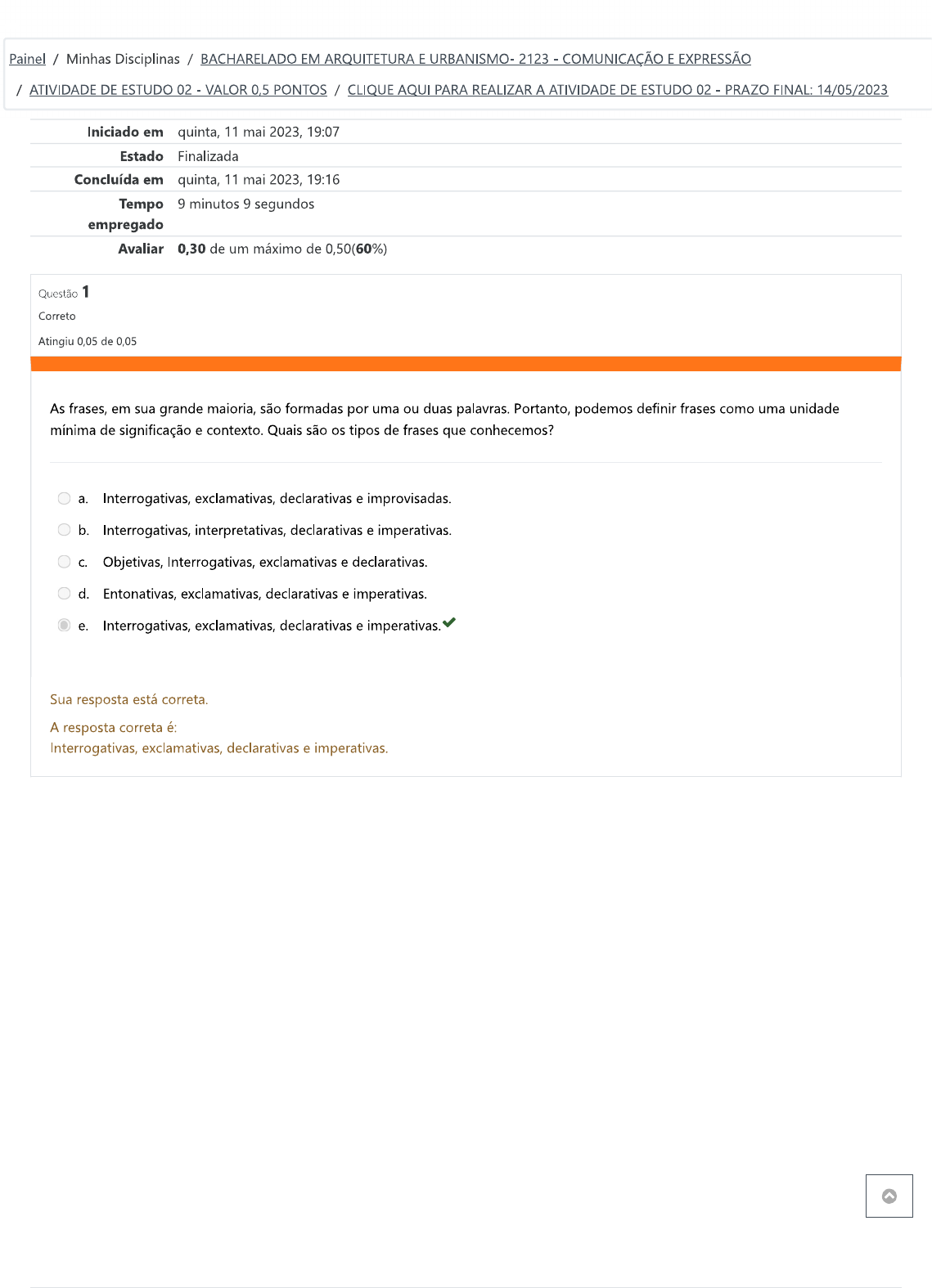 <p>Painel / Minhas Disciplinas / BACHARELADO EM ARQUITETURA E URBANISMO- 2123 - COMUNICAÇÃO E EXPRESSÃO / ATIVIDADE DE ESTUDO 02 - VALOR 0,5 PONTOS / CLIQUE AQUI PARA REALIZAR A ATIVIDADE DE ESTUDO 02 - PRAZO FINAL: 14/05/2023 Iniciado em quinta, 11 mai 2023, 19:07 Estado Finalizada Concluída em quinta, 11 mai 2023, 19:16 Tempo 9 minutos 9 segundos empregado Avaliar 0,30 de um máximo de 0,50(60%) Questão 1 Correto Atingiu 0,05 de 0,05 As frases, em sua grande maioria, são formadas por uma ou duas palavras. Portanto, podemos definir frases como uma unidade mínima de significação e contexto. Quais são os tipos de frases que conhecemos? a. Interrogativas, exclamativas, declarativas e improvisadas. b. Interrogativas, interpretativas, declarativas e imperativas. C. Objetivas, Interrogativas, exclamativas e declarativas. d. Entonativas, exclamativas, declarativas e imperativas. e. Interrogativas, exclamativas, declarativas e imperativas. Sua resposta está correta. A resposta correta é: Interrogativas, exclamativas, declarativas e imperativas.</p><p>Questão 2 Correto Atingiu 0,05 de 0,05 Quando há repetição desnecessária de uma informação na frase temos qual tipo de vício de linguagem? a. Pleonasmo vicioso ou b. Ambiguidade. C. Solecismo. d. Barbarismo. e. Estrangeirismo. Sua resposta está correta. A resposta correta é: Pleonasmo vicioso ou Questão 3 Correto Atingiu 0,05 de 0,05 As idéias serão concluídas, o fechamento do pensamento deve acontecer nessa parte final do texto e as perguntas e hipóteses respondidas ou, ao menos, mostrar que há possibilidades de soluções para os problemas. Estamos nos referindo a qual parte do texto científico? a. b. Apêndice. C. Introdução. d. Conclusão. e. Anexos. Sua resposta está correta. A resposta correta é: Conclusão.</p><p>Questão 4 Correto Atingiu 0,05 de 0,05 Usamos as palavras no seu sentido figurado, quando dizemos uma coisa querendo dizer outra, ou seja, é o tipo de sentido muito utilizado na literatura ou quando queremos enfatizar algo. Estamos nos referindo: a. Sentido referencial. b. Sentido conativo. C. Sentido ambíguo. d. Sentido denotativo. e. Sentido conotativo. Sua resposta está correta. A resposta correta é: Sentido conotativo. Questão 5 Correto Atingiu 0,05 de 0,05 Para que haja entendimento, o receptor da mensagem precisa estar por dentro do assunto que foi abordado, ou seja, precisa saber do contexto que ali foi empregado. Dentro disso, analise a frase abaixo: "O Rei do futebol será homenageado na próxima semana". Temos aqui um exemplo de: a. Solecismo. b. Intertextualidade. C. Ambiguidade. d. Pleonasmo. e. Ambiguidade. Sua resposta está correta. A resposta correta é: Intertextualidade.</p><p>Questão 6 Incorreto Atingiu 0,00 de 0,05 Assim como os textos escritos acadêmicos, os do gênero da oralidade da esfera acadêmica também são estruturados dentro de um modelo e merecem nossa atenção. Qual é o objetivo da exposição oral? a. Chega a uma solução de problemas. b. informar; preparar uma reflexão; preparar uma discussão. C. Dissertar sobre algo. d. Apenas expor um assunto. e. Mostrar o ponto de vista de quem está apresentando Sua resposta está incorreta. A resposta correta é: informar; preparar uma reflexão; preparar uma discussão. Questão 7 Incorreto Atingiu 0,00 de 0,05 Os textos acadêmicos possuem características especificas e que devem ser seguidos à risca, mas é bom lembrar que a estrutura organizacional deles está baseado em três partes. Quais são elas? a. introdução, desenvolvimento e conclusão. b. apêndices, anexos e conclusão. C. introdução, anexos e conclusão. d. resumo, desenvolvimento e conclusão. e. introdução, desenvolvimento e relatórios. Sua resposta está incorreta. A resposta correta é: introdução, desenvolvimento e conclusão.</p><p>Questão 8 Incorreto Atingiu 0,00 de 0,05 Organizar bem as informações, ser persuasivo e convincente, fazendo um encadeamento lógico das ideias leva o leitor a aceitar o que você está dizendo. Estamos nos referindo a qual critério de textualidade? a. b. Intencionalidade. Aceitabilidade. d. Informatividade. e. Sua resposta está incorreta. A resposta correta é: Questão 9 Incorreto Atingiu 0,00 de 0,05 termo monografia refere-se a qualquer trabalho científico que visa aprofundar um assunto específico, por isso é chamado de monografia: a escrita sobre um tema específico. A monografia pode ser dividida em três partes, quais são elas? a. Elementos pré-textuais, Elementos argumentativos e Elementos pós-textuais x b. Elementos pré-textuais, Elementos avaliativos e Elementos pós-textuais C. Elementos pré-textuais, Elementos textuais e Elementos pós-textuais d. Elementos principiantes, Elementos textuais e Elementos pós-textuais e. Elementos pré-textuais, Elementos textuais e Elementos posteriores Sua resposta está incorreta. A resposta correta é: Elementos pré-textuais, Elementos textuais e Elementos pós-textuais</p><p>Questão 10 Correto Atingiu 0,05 de 0,05 É notório que texto se qualifica como interação humana, e pensando no texto enquanto modalidade escrita e unidade de sentido, temos algumas características de como construir uma produção textual com seu sentido estruturado, com coesão e coerência, entre outros elementos. Qual é a definição de coesão textual? a. A concordância entre os termos do parágrafo. b. É a aplicação dos conectivos nas orações. C. A finalização do texto. d. A intertextualidade dos parágrafos. e. As ideias apresentadas no texto. Sua resposta está correta. A resposta correta é: É a aplicação dos conectivos nas orações ÁUDIO AULA 08 Seguir para... CLIQUE AQUI PARA REALIZAR O FÓRUM DA DISCIPLINA</p>