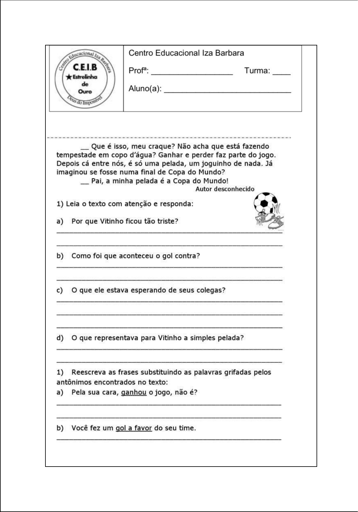 <p>TESTE DE PORTUGUÊS</p><p>3) Complete as frases a seguir com substantivos.</p><p>a) Aquela ________________é muito bonita.</p><p>b) Meu __________________ está no guarda roupa.</p><p>c) Eu vi uma _________________ na parede da cozinha.</p><p>d) As __________________ gostavam muito do filme a que assistiram.</p><p>4) Que palavras ajudam você a saber se o substantivos deveria ser escrito no singular ou plural, no masculino ou feminino.</p><p>_____________________________________________________________________________</p><p>5) Complete as palavras com X ou CH.</p><p>a) Abaca____i</p><p>b) Má_____imo</p><p>c) E____celente</p><p>d) ____eio</p><p>6) Agora complete as frases</p><p>a) A bru____a não conseguiu fazer o feitiço.</p><p>b) Estão à venda _____icória e _____uchu.</p><p>c) Comprei a mo_____ila estava uma pechin_____a.</p><p>7) Relacione.</p><p>a) Peguei uma caneta no estojo ( ) Indica uma caneta específica</p><p>b) Peguei a caneta no estojo ( ) Indica uma caneta qualquer</p><p>8) Complete as frases com bem ou bom.</p><p>a) Roberto exerce muito ___________ a sua profissão.</p><p>b) Mamãe está se sentindo __________ ela teve um _______________.</p><p>c) Alimentar-se __________ é um _____________ hábito.</p><p>d) Hoje fiz um ___________ teste de português.</p><p>e) O sol está ___________ alto. Hoje o tempo vai ser __________.</p><p>f) Mariana sabe dançar muito _______________.</p><p>image1.jfif</p><p>image2.jpg</p>
