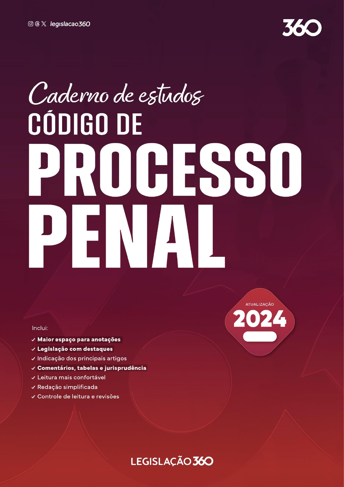 <p>1</p><p>2024.2</p><p>2</p><p>2024.2, 12.04.2024</p><p>3</p><p>INDICAÇÃO DOS PRINCIPAIS ARTIGOS</p><p>TABELAS E JURISPRUDÊNCIA</p><p>REDAÇÃO SIMPLIFICADA</p><p>LEGISLAÇÃO COM DESTAQUES</p><p>NAVEGAÇÃO POR MARCADORES</p><p>Avance no estudo das legislações e organize todas as suas anotações em</p><p>um só lugar.</p><p>Criamos este formato de CADERNO DE ESTUDOS em 2018, combinando</p><p>a letra da lei, jurisprudência, tabelas e o espaço dedicado para anotações</p><p>que se tornou marca da Legislação 360.</p><p>Além de todas as demais marcações, destacamos com uma estrela os</p><p>artigos com maior incidência em provas e que merecem atenção especial.</p><p>Para aprofundar seus estudos, incluímos a jurisprudência relacionada aos</p><p>dispositivos e tabelas esquematizando a doutrina.</p><p>Desenvolvemos uma diagramação especial para as legislações, facilitando</p><p>muito a sua leitura. Além disso, também simplificamos a redação dos</p><p>dispositivos, especialmente nos números.</p><p>NEGRITO ›</p><p>ROXO ›</p><p>LARANJA ›</p><p>CINZA SUBLINHADO ›</p><p>Utilizado para realçar termos importantes.</p><p>Aplicado para destacar números, incluindo datas, prazos, percentuais e outros valores numéricos.</p><p>Expressões que denotam negação, ressalva ou exceção.</p><p>Indica vetos e revogações.</p><p>Dispositivos cuja eficácia está prejudicada, mas não estão revogados expressamente.</p><p>Uma ferramenta adicional para leitores digitais.</p><p>Nossos materiais foram desenvolvidos para garantir uma leitura confortável</p><p>quando impressos, mas se você prefere ler em dispositivos eletrônicos,</p><p>conheça esta funcionalidade. Implementamos em todos os nossos</p><p>conteúdos o recurso de navegação por marcadores, um componente</p><p>interativo do leitor de PDF (cujo nome pode variar de acordo com o</p><p>programa utilizado).</p><p>Nesta ferramenta, títulos, capítulos, seções e artigos das legislações, assim</p><p>como súmulas e outros textos relevantes de jurisprudência, são organizados</p><p>na barra de marcadores do leitor de PDF. Isso permite que você localize cada</p><p>item de forma mais rápida.</p><p>Além disso, a funcionalidade VOLTAR, presente em alguns leitores de PDF,</p><p>facilita o retorno ao ponto de leitura onde você parou, sem a necessidade de</p><p>ficar rolando páginas.</p><p>ESPAÇO PARA ANOTAÇÕES</p><p>CINZA TACHADO ›</p><p>4</p><p>GUIA DE ESTUDOS</p><p>Se você está começando a se preparar para concursos ou busca uma melhor organização e planejamento, este guia será de</p><p>grande ajuda em sua jornada. Disponibilizamos o conteúdo gratuitamente em nosso site: www.legislacao360.com.br</p><p>CONTROLE DE LEITURA DAS LEGISLAÇÕES</p><p>Incluído no Guia de Estudos, o PLANNER METAS DA LEGISLAÇÃO é uma planilha desenvolvida para ajudar você a organizar</p><p>suas leituras e revisões. Este material é gratuito e está disponível para download em nosso site. No guia você encontrará</p><p>também sugestões de como utilizar a planilha. Veja algumas das características principais:</p><p>BIBLIOGRAFIA PARA CONCURSOS PÚBLICOS E OAB</p><p>ORIENTAÇÕES PARA ESTUDAR JURISPRUDÊNCIA</p><p>COMO OTIMIZAR A RESOLUÇÃO DE QUESTÕES</p><p>MODELO DE CICLO DE ESTUDOS</p><p>PLANNER PARA A LEITURA DE INFORMATIVOS (STF E STJ)</p><p>PLANNER PARA O ESTUDO DAS LEGISLAÇÕES</p><p>Desenvolvimento editorial e todos os direitos reservados a 360 EDITORA JURÍDICA LTDA.</p><p>Material protegido por direitos autorais. É proibida a reprodução ou distribuição deste material, ainda que sem</p><p>fins lucrativos, sem a expressa autorização da 360 Editora Jurídica Ltda. Lei 9.610/98 – Lei de Direitos Autorais.</p><p>www.legislacao360.com.br – editora@360.ltda</p><p>5</p><p>SUMÁRIO</p><p>ÍNDICE DAS TABELAS ...................................................................................................................................................................................... 6</p><p>DL 3.689/41 - Código de Processo Penal ................................................................................................................................................. 9</p><p>LIVRO I - DO PROCESSO EM GERAL.......................................................................................................................................................... 10</p><p>Título I - Disposições Preliminares ................................................................................................................................................................... 10</p><p>Título II - Do Inquérito Policial .......................................................................................................................................................................... 16</p><p>Título III - Da Ação Penal ..................................................................................................................................................................................... 24</p><p>Título IV - Da Ação Civil ....................................................................................................................................................................................... 36</p><p>Título V - Da competência ................................................................................................................................................................................... 38</p><p>Título VI - Das questões e processos incidentes.......................................................................................................................................... 48</p><p>Título VII - Da prova .............................................................................................................................................................................................. 59</p><p>Título VIII - Do juiz, do Ministério Público, do a