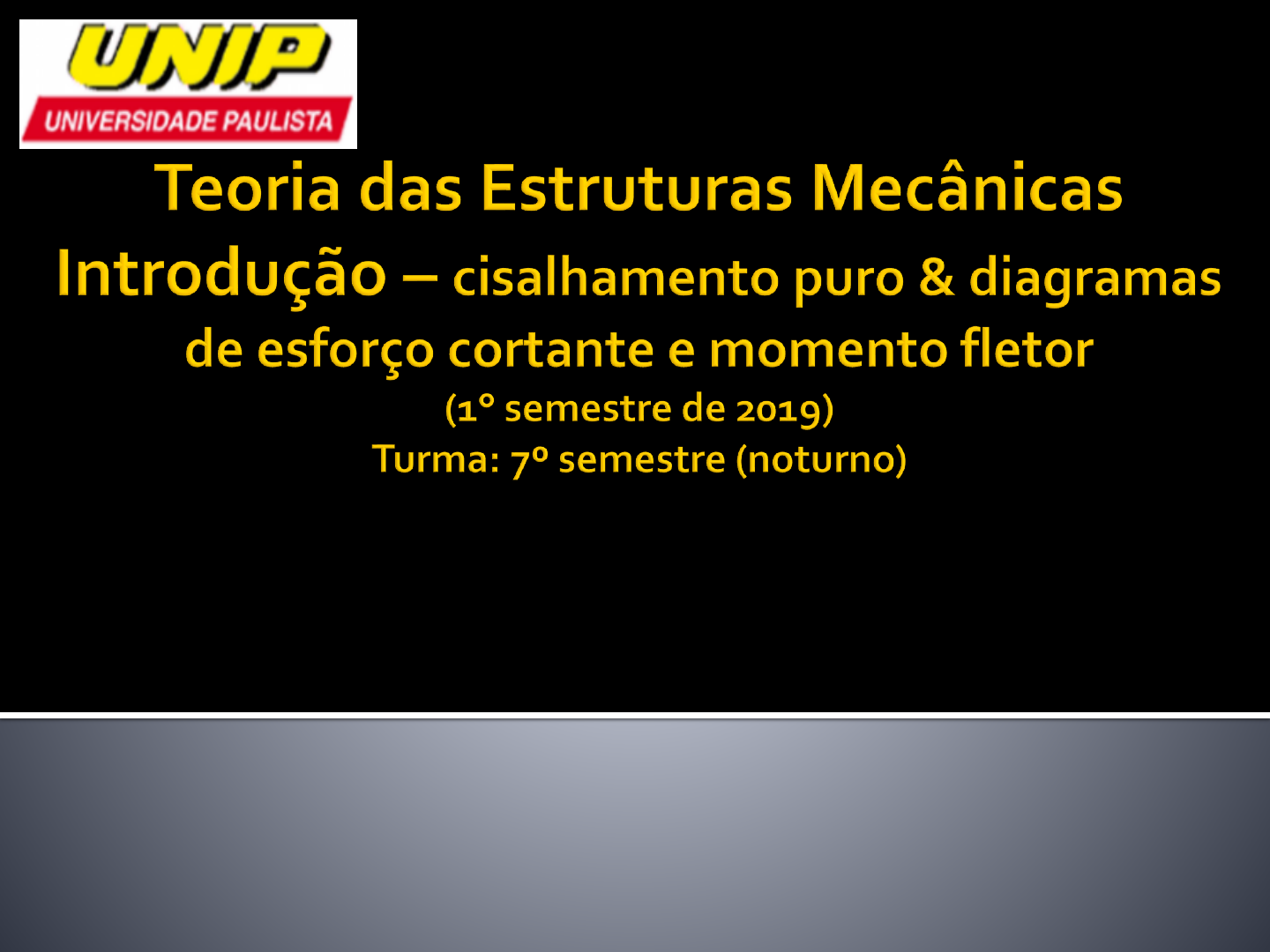 <p>Universidade Paulista – UNIP</p><p>Instituto de Ciências Exatas e Tecnologia (ICET)</p><p>Curso de Engenharia Mecânica – Campus São José do Rio Pardo</p><p>Prof. MSc. Rafael Rodrigues da Silva</p><p> Nesta aula:</p><p>▪ Retomada de conceitos de Estática nas Estruturas</p><p>e Resistência dos Materiais com exercícios:</p><p>▪ Cisalhamento puro / Ensaio de cisalhamento</p><p>▪ Diagrama de esforço cortante e momento fletor</p><p> Cisalhamento puro / Ensaio de cisalhamento</p><p>▪ Exemplos cotidianos do cisalhamento:</p><p>▪ Cortar um tecido, ao fatiar um pedaço de queijo ou</p><p>cortar aparas do papel com uma guilhotina, estamos</p><p>fazendo o cisalhamento.</p><p>▪ No caso de metais, podemos praticar o</p><p>cisalhamento com tesouras, prensas de corte,</p><p>dispositivos especiais ou simplesmente aplicando</p><p>esforços que resultem em forças cortantes.</p><p> Cisalhamento puro / Ensaio de cisalhamento</p><p>▪ Ao ocorrer o corte, as partes se movimentam paralelamente,</p><p>por escorregamento, uma sobre a outra, separando-se. A esse</p><p>fenômeno damos o nome de cisalhamento.</p><p>▪ Todo material apresenta certa resistência ao cisalhamento.</p><p>▪ Saber até onde vai esta resistência é muito importante,</p><p>principalmente na estamparia, que envolve corte de chapas, ou</p><p>nas uniões de chapas por solda, por rebites ou por parafusos,</p><p>onde a força cortante é o principal esforço que as uniões vão ter</p><p>de suportar.</p><p> Sobre o ensaio:</p><p>▪ Para ensaios de</p><p>pinos, rebites e</p><p>parafusos utiliza-</p><p>se um dispositivo</p><p>como o que está</p><p>representado</p><p>simplificadamente</p><p>na figura.</p><p> Cisalhamento puro / Ensaio de cisalhamento</p><p>▪ A tensão de cisalhamento média em um</p><p>componente de fixação é dada pela razão entre a</p><p>força cortante e a área da superfície.</p><p> Exercício 1 - cisalhamento:</p><p> Relação entre a tensão máxima de</p><p>cisalhamento e de tração:</p><p>▪ A realização de sucessivos ensaios mostrou que</p><p>existe uma relação constante entre a tensão de</p><p>cisalhamento e a tensão de tração.</p><p>▪ Na prática, considera-se a tensão de cisalhamento</p><p>(TC) equivalente a 75% da tensão de tração (T).</p><p> Exercício 2 - Cisalhamento:</p><p>▪ Duas chapas são unidas por rebites. Elas precisam</p><p>suportar uma força F de 20 kN. O diâmetro de</p><p>cada rebite é de 4 mm. A tensão de tração que</p><p>cada rebite suporta é de 650 Mpa. Qual o número</p><p>de rebites necessário para esta aplicação?</p><p> Exercício: (resolução)</p><p>▪ Sabemos que a tensão máxima de cisalhamento é</p><p>0,75 da tensão de tração:</p><p>▪ Sabemos que a quantidade de rebites influencia</p><p>na área total de rebites que suportará o</p><p>cisalhamento</p><p> Exercício: (resolução)</p><p>▪ Podemos calcular S, a área para um rebite.</p><p>▪ Logo (atenção com as unidades!):</p><p>4 rebites, considerando a</p><p>segurança.</p><p> Esforço cortante e momento fletor em</p><p>barra submetida a flexão.</p><p>▪ Vamos fazer um exercício para retomar a prática.</p><p>▪ Primeiro vamos lembrar das convenções de sinais</p><p>para os esforços internos.</p><p>▪ Como temos que encontrar o carregamento, ao</p><p>longo da estrutura, dos esforços internos, devemos</p><p>lembrar as convenções brasileiras para sinais.</p><p>▪ Lembrando que essa convenção é usada somente na</p><p>hora de identificar nossa incógnita nos “cortes” que</p><p>analisamos</p><p>Esforço normal</p><p>Convenção: tração</p><p>Esforço cortante</p><p>Convenção: tende a girar no</p><p>sentido horário</p><p>Momento fletor</p><p>Convenção: fibras inferiores tracionadas</p><p>Lembrando, também, que no diagrama (gráfico) o</p><p>momento negativo é representado para cima.</p><p>Esforço torçor</p><p>Convenção: vetor de torção saindo na seção (corte).</p><p> Exercício 1 de V e M:</p><p>▪ Determinar as reações de apoio, as funções do</p><p>esforço cortante (V) e momento fletor (M) e</p><p>desenhar os diagramas dos mesmos</p><p> Exercício 2 de V e M:</p><p>▪ Determinar as reações de apoio, as funções do</p><p>esforço cortante (V) e momento fletor (M) e</p><p>desenhar os diagramas dos mesmos</p>
