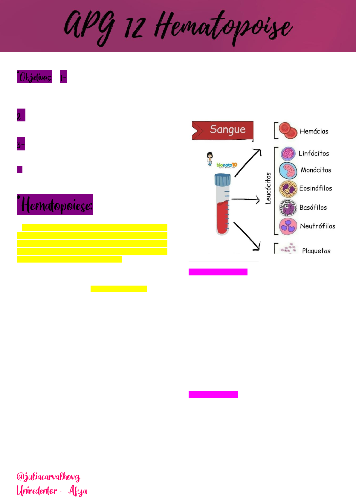 <p>EXPLICAR o processo de</p><p>hematopoise (produção das linhagens celulares e</p><p>seus fatores regulatórios);</p><p>DIFERENCIAR as estruturas e funções das células</p><p>sanguíneas;</p><p>CONHECER a organização estrutural e funcional</p><p>das hemoglobinas;</p><p>4- CONHECER os tipos de hemoglobina;</p><p>Heme provém da palavra grega “haime” que significa</p><p>“sangue”. Hematopoiese consiste no processo de</p><p>divisão, diferenciação e maturação celular, desde a</p><p>célula mais primitiva – célula estaminal – até aos</p><p>diferentes tipos de células sanguíneas. Estes processos</p><p>estão dependentes de diferentes genes existentes nas</p><p>células.</p><p>A célula estaminal, ou célula pluripotencial, tem a</p><p>capacidade de se dividir, e assim de se auto-renovar,</p><p>bem como de se diferenciar nos vários tipos de células.</p><p>As células do sangue têm um tempo de vida limitado e</p><p>necessitam de se renovar de forma continuada e</p><p>constante; em algumas situações pode haver</p><p>necessidade de aumentar a produção, como por</p><p>exemplo, quando há uma perda de sangue ou, no caso</p><p>de uma infecção, em que são necessários mais glóbulos</p><p>brancos. A produção das células é controlada pelos</p><p>diferentes fatores de crescimento. (ROBBINS, 2019).</p><p>O local de formação das células sanguíneas muda ao</p><p>longo do tempo. Nas fases iniciais da vida do embrião a</p><p>hematopoiese ocorre principalmente na vesícula</p><p>vitelínica. Em seguida passa a acontecer no fígado fetal,</p><p>e posteriormente se concentra predominantemente na</p><p>medula óssea, onde continua até a vida adulta.</p><p>Os diferentes tipos de células sanguíneas (hemácias,</p><p>leucócitos e plaquetas) se originam de um precursor</p><p>comum, uma célula-tronco indiferenciada. A</p><p>diferenciação em cada tipo celular se dá através de</p><p>processos conhecidos como eritropoiese (hemácias),</p><p>granulocitopoiese ou mielopoiese (granulócitos),</p><p>monopoiese (monócitos), linfopoiese (linfócitos) e</p><p>trombocitopoiese (plaquetas). (ROBBINS, 2019).</p><p>*Fases da hematopoiese</p><p>*Fase mesoblástica: fase inicial da hematopoiese na</p><p>vida intra-uterina. Ocorre na vesícula vitelínica e surge</p><p>por volta de duas semanas de gestação. O nome dessa</p><p>fase faz referência ao mesoderma do saco vitelínico,</p><p>onde o processo ocorre. Esse período é conhecido</p><p>também como fase extra-embrionária da hematopoiese.</p><p>Os grupamentos celulares do saco vitelínico têm</p><p>potencial para se diferenciar em células vasculogênicas</p><p>ou hematopoieticas, e por isso são chamadas de</p><p>hemangioblastos. As células mais periféricas se</p><p>diferenciam em endotélio, formando, portanto, vasos</p><p>sanguíneos, enquanto as demais vão dar origem</p><p>principalmente a eritroblastos primitivos (células</p><p>precursoras das hemácias).</p><p>*Fase hepática: segunda fase intrauterina da</p><p>hematopoiese. Ocorre no fígado hepático entre a 4ª e a</p><p>6ª semanas de vida intrauterina com a migração de</p><p>células para o desenvolvimento do fígado fetal. Os</p><p>principais órgãos que contribuem com a formação</p><p>celular na fase hepática são o baço, o timo e os</p><p>linfonodos contribuem com a produção de linfócitos. o</p><p>*Fase medular: produção das células sanguíneas</p><p>passa a ser realizada na medula óssea a partir da 11ª</p><p>semana gestacional, até a vida pós-natal.</p><p>No período pós-natal todas as células sanguíneas são</p><p>derivadas primariamente da medula óssea. Os linfócitos</p><p>T sofrem diferenciação no timo, mas são originados de</p><p>células da medula óssea que migraram para aquele</p><p>órgão. (DRAKE, 2017).</p><p>A medula óssea é o tecido que existe dentro dos</p><p>ossos e que constitui a nossa “ fábrica do sangue”. É</p><p>formada por vasos sanguíneos, tecido adiposo, e</p><p>diversos tipos de células: as células precursoras dos</p><p>diferentes glóbulos do sangue, também chamadas</p><p>células estaminais ou pluripotenciais, os fibroblastos e</p><p>plasmócitos.</p><p>Na criança existe medula em quase todos os ossos,</p><p>mas ao longo dos anos vai-se alterando esta</p><p>distribuição, a medula óssea vermelha vai</p><p>progressivamente sendo substituída por medula óssea</p><p>amarela no adulto existe, quase exclusivamente, nos</p><p>ossos da bacia, costelas e no esterno. (JUNQUEIRA,</p><p>2017).</p><p>As células sanguíneas se originam todas de um</p><p>precursor comum indiferenciado, as chamadas células-</p><p>tronco pluripotentes. Ao se dividir, essas células dão</p><p>origem a células-filhas, que por sua vez podem</p><p>permanecer como células-tronco pluripotentes,</p><p>contribuindo para a manutenção da população desse</p><p>grupo celular, ou se diferenciar em outros tipos</p><p>celulares.</p><p>As células-tronco possuem, portanto, algumas</p><p>características especiais, que as distinguem dos demais</p><p>tipos celulares envolvidos na hematopoiese:</p><p>Formam novas células tronco, mantendo a sua</p><p>população inalterada, um processo conhecido como</p><p>autorrenovação. São capazes de se diferenciar e</p><p>originar diferentes linhagens celulares sanguíneas.</p><p>São capazes de colonizar a medular óssea e</p><p>reconstituir o sistema hematopoiético caso esse seja</p><p>destruído. Essa habilidade permite que essas células</p><p>sejam usadas em transplantes de medula óssea.</p><p>As unidades formadoras de colônias (do inglês CFU,</p><p>Colony-Forming Units) e podem dar origem a uma ou</p><p>mais linhagens hematopoéticas. Por exemplo, o</p><p>precursor CFU-G (Colony-Forming Unit – Granu- locytic)</p><p>produz apenas granulócitos, enquanto o CFU-GM</p><p>(Colony-Forming Unit – Granulocytic/Monocytic) produz</p><p>granu- lócitos e monócitos. Quanto mais diferen