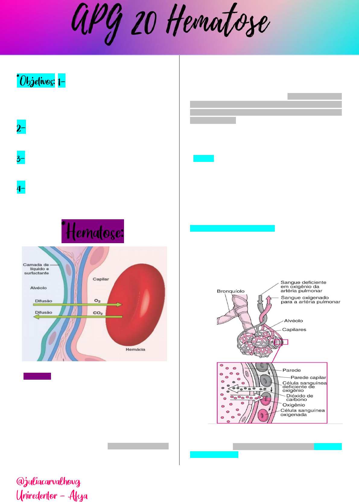 <p>COMPREENDER a hematose:</p><p>-Barreira hematoaérea, determinantes da troca</p><p>gasosa e troca limitada por perfusão e difusão.</p><p>ANALISAR o transporte de O² e CO²; (curva</p><p>de saturação da hemoglobina)</p><p>DESCREVER o controle neural e químico da</p><p>respiração;</p><p>DISCUTIR os reflexos respiratórios,</p><p>destacando estímulos que aumentam e diminuem</p><p>a FR (Frequência Respiratória);</p><p>Hematose pode ser conceituada como a troca gasosa</p><p>que ocorre nas porções terminais pulmonares, sendo</p><p>assim, também pode ser chamada de respiração</p><p>pulmonar (esta é diferente da respiração celular, que</p><p>ocorre dentro da célula em várias partes do corpo).</p><p>Existem cerca de 300 milhões de alvéolos nos dois</p><p>pulmões humanos, estas unidades apresentam paredes</p><p>muito finas e, interconectados a elas, temos uma malha</p><p>de capilares, ambos compõem a membrana respiratória</p><p>e é neste local que ocorre a troca gasosa.</p><p>(SILVERTHORN, 2016).</p><p>Após os alvéolos serem ventilados com ar fresco, o</p><p>próximo passo da respiração é a difusão do oxigênio</p><p>(O2) dos alvéolos para o sangue pulmonar e do dióxido</p><p>de carbono (CO2), na direção oposta, isto é, do sangue</p><p>para os alvéolos. O processo de difusão é simplesmente</p><p>o movimento aleatório de moléculas em todas as</p><p>direções através da membrana respiratória e dos</p><p>líquidos adjacentes. (GUYTON, 2019).</p><p>Difusão é um processo físico em que substâncias são</p><p>transportadas de uma região mais concentrada para</p><p>outra menos concentrada (a favor do gradiente de</p><p>concentração) de maneira aleatória e espontânea. Esse</p><p>processo pode ser observado, por exemplo, ao se</p><p>colocar um corante em um copo com água. (LEVY,</p><p>2018). LL</p><p>A função do sistema respiratório é mover dois gases:</p><p>oxigênio e dióxido de carbono. A troca gasosa ocorre</p><p>nos milhões de alvéolos nos pulmões e nos vasos</p><p>capilares que os envolvem. Conforme mostrado abaixo,</p><p>o oxigênio inspirado passa dos alvéolos para o sangue</p><p>nos vasos capilares e o dióxido de carbono passa do</p><p>sangue nos vasos capilares para o ar nos alvéolos.</p><p>(SILVERTHORN, 2016).</p><p>Três processos são essenciais para a transferência</p><p>de oxigênio do ar exterior para o sangue passando</p><p>pelos pulmões: ventilação, difusão e perfusão. A grosso</p><p>e resumido modo:</p><p> Ventilação é o processo pelo qual o ar entra e</p><p>sai dos pulmões.</p><p> Difusão é o movimento espontâneo dos gases,</p><p>sem o uso de energia ou esforço por parte do</p><p>corpo, entre os alvéolos e os capilares nos</p><p>pulmões. Os gases movem-se por uma energia</p><p>potencial gerada em consequência aos</p><p>diferentes gradientes de concentração dos</p><p>gases em relação à pressão atmosférica.</p><p> Perfusão é o processo pelo qual o sistema</p><p>cardiovascular bombeia o sangue pelos</p><p>pulmões.</p><p>A circulação sanguínea é um elo fundamental entre a</p><p>atmosfera, que contém oxigênio e as células do corpo,</p><p>que consomem oxigênio. Por exemplo, o fornecimento</p><p>de oxigênio para as células musculares em todo o</p><p>corpo não depende só dos pulmões, mas também da</p><p>capacidade do sangue de transportar oxigênio, e do</p><p>sistema circulatório de transportar sangue para os</p><p>músculos. Além disso, uma pequena fração do sangue</p><p>bombeado do coração entra nas artérias brônquicas e</p><p>nutre as vias aéreas. (SILVERTHORN, 2016)</p><p>Se a difusão dos gases entre os alvéolos e o sangue é</p><p>significativamente prejudicada, ou se o transporte de</p><p>oxigênio no sague é inadequado, o sujeito entra em</p><p>hipóxia (estado de muito pouco oxigênio nos tecidos). A</p><p>hipóxia é frequentemente (mas não sempre)</p><p>acompanhada de hipercapnia, isto é, uma concen-</p><p>tração elevada de dióxido de carbono. Essas duas</p><p>condições são sinais clínicos, não doenças, e os</p><p>médicos precisam de informações adicionais para</p><p>definir a sua causa. (SILVERTHORN, 2016).</p><p>Física da Difusão dos Gases (GUYTON, 2019).</p><p> Para que ocorra difusão, deve existir uma</p><p>fonte de energia, que é fornecida pelo</p><p>movimento cinético das moléculas, exceto na</p><p>temperatura de zero absoluto, em que todas</p><p>as moléculas de todas as matérias se</p><p>encontram em movimento constante.</p><p> Se uma câmara de gás ou uma solução</p><p>contiver concentração alta de um gás em</p><p>particular em uma de suas extremidades e</p><p>concentração baixa, na outra extremidade,</p><p>ocorrerá a difusão resultante desse gás da</p><p>área de alta concentração para a área de</p><p>baixa concentração.</p><p> A pressão é diretamente proporcional à</p><p>concentração das moléculas de gás.</p><p> A taxa de difusão de cada gás é diretamente</p><p>proporcional à pressão causada por esse gás</p><p>isolado, que recebe o nome de pressão parcial</p><p>do gás.</p><p> Considere o ar, composto de</p><p>aproximadamente 79% de nitrogênio e 21% de</p><p>oxigênio. A pressão total dessa mistura, ao</p><p>nível do mar, situa-se em torno de 760 mmHg.</p><p>Torna-se claro, por meio dessa descrição</p><p>sobre a base molecular das pressões, que</p><p>cada gás contribui com a pressão total da</p><p>mistura em proporção igual à sua</p><p>concentração. Desse modo, 79% do total de</p><p>760 mmHg são produzidos pelo nitrogênio</p><p>(600 mmHg) e 21%, pelo oxigênio (160</p><p>mmHg). Assim, a pressão parcial de nitrogênio</p><p>na mistura equivale a 600 mmHg e a pressão</p><p>parcial de oxigênio, a 160 mmHg, sendo a</p><p>pressão total de 760 mmHg ou a soma das</p><p>pressões parciais individuais. As pressões</p><p>parciais de gases individuais em uma mistura</p><p>são designadas pelos 