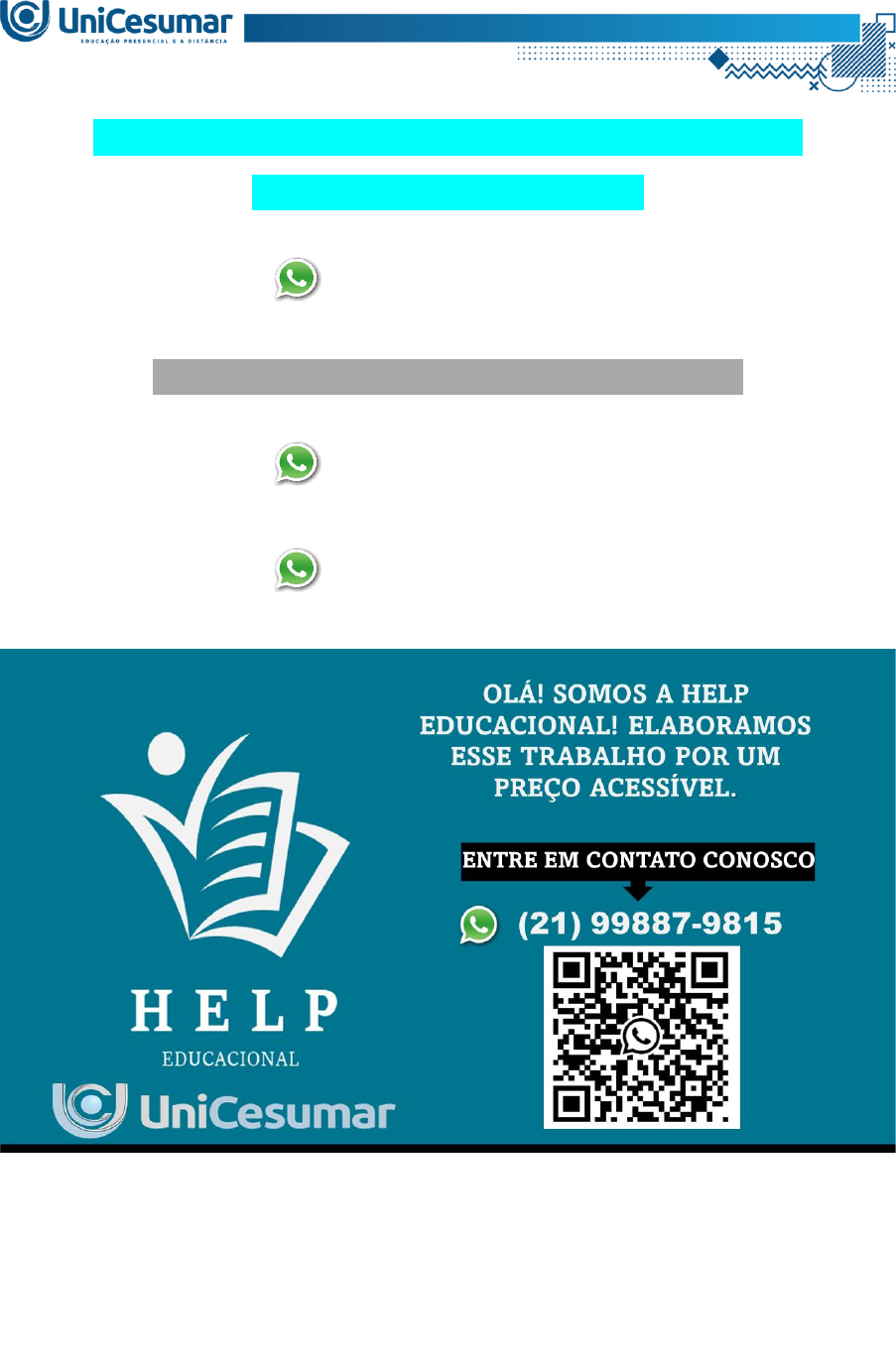 <p>MAPA – PRÁTICA DE ENSINO: CONCEPÇÃO E</p><p>ORGANIZAÇÃO - 53_2024</p><p>(21) 99887-9815</p><p>ASSESSORIA NOS SEUS TRABALHOS</p><p>(21) 99887-9815</p><p>(21) 99887-9815</p><p>Olá, Acadêmico(a)!</p><p>Esta atividade MAPA o(a) ajudará a desenvolver práticas de ensino, bem como o seu</p><p>aprendizado pessoal. O objetivo é oferecer uma contribuição prática e teórica para que você</p><p>possa se preparar para futuro desenvolvimento em sua atuação profissional. Para isso, para</p><p>o desenvolvimento do MAPA considerar os seguintes textos:</p><p>Texto 1:</p><p>Disponível em: <https://olhonavaga.com.br/images?id=12330>. Acesso em: 09/06/2023.</p><p>Texto 2:</p><p>Como lidar com a falta de materiais nas escolas públicas?</p><p>Para desempenhar seu papel de ensinar, os professores se deparam, constantemente, com</p><p>situações difíceis de contornar. A formação é deficitária, a estrutura não é das melhores, o</p><p>Estado, muitas vezes, deixa de cumprir com suas responsabilidades, não há participação</p><p>ativa de várias famílias, além da falta de materiais nas escolas.</p><p>É um conjunto de fatores que influencia, diretamente, na qualidade das aulas e, em conse-</p><p>quência, no aprendizado dos alunos.</p><p>Muitas vezes, o professor quer fazer uma atividade diferente, porém os recursos são escas-</p><p>sos e o profissional acaba desanimando. Tem aqueles ainda que, com o objetivo de tirar</p><p>seus projetos do papel e engajar mais os alunos nas aulas, compram materiais com seu</p><p>próprio dinheiro.</p><p>Se tratando de equipamentos eletrônicos, como os projetores, muitas vezes eles existem</p><p>nas escolas, mas seu uso é tão concorrido que o professor resolve, por fim, se ater aos li-</p><p>vros didáticos e ao quadro negro.</p><p>Segundo pesquisa realizada com gestores de escolas municipais de SP, mesmo quando os</p><p>insumos são fornecidos, eles são insuficientes ou inadequados. Além de as escolas não</p><p>participarem das decisões de compra, o que acarreta em envios que não competem com a</p><p>realidade, os materiais, na maioria das vezes, são de baixa qualidade.</p><p>Disponível em: <https://blog.portabilis.com.br/como-lidar-com-a-falta-de-materiais-nas-esco-</p><p>las/>. Acesso em: 09/06/2023.</p><p>O docente havia elaborado um planejamento que incluía a exibição de um filme seguida da</p><p>proposição de um trabalho aos estudantes. Contudo, no dia designado, a turma se apresen-</p><p>tou indisposta com muita conversa paralela, além de ocorrer uma falha no projetor disponí-</p><p>vel na sala de aula, impossibilitando a realização da atividade prevista. Diante dessa cir-</p><p>cunstância, como solucionar esse impasse? Sua tarefa consiste em propor duas alternati-</p><p>vas para contornar essa situação, bem como elaborar dois planejamentos voltados para</p><p>aulas diferenciadas e não convencionais.</p><p>Nesta atividade MAPA, você deve realizar dois planejamentos de atividades para a mesma</p><p>aula, levando em consideração as dificuldades apresentadas e a necessidade de utilizar</p><p>metodologias práticas de ensino. Cada planejamento deve conter informações como o con-</p><p>teúdo a ser abordado, o ano e a disciplina, a quantidade de aulas, os materiais necessários</p><p>e a metodologia de ensino a ser empregada. Além disso, você deve elaborar um parágrafo</p><p>que responda à seguinte questão: 'É possível realizar uma aula diferenciada, com metodo-</p><p>logias práticas de ensino, sem utilizar programas digitais, internet e equipamentos eletrôni-</p><p>cos como projetor, caixas de som, televisão?' Justifique sua resposta em até 20 linhas,</p><p>apresentando argumentos embasados e coerentes.</p><p>Orientações:</p><p>- Siga atentamente às orientações descritas acima, desenvolvendo em seu trabalho todos</p><p>os conteúdos elencados.</p><p>- Desenvolva o seu trabalho no Template do MAPA disponibilizado no Material da Disci-</p><p>plina.</p><p>- Assista ao vídeo explicativo disponível na Sala do Café.</p><p>- Para auxiliar no desenvolvimento da atividade faça o uso de seu livro didático e de materi-</p><p>ais de apoio.</p><p>- Mantenha uma escrita formal e cuidadosa, desenvolvendo as respostas de forma ade-</p><p>quada ao nível de graduação. Antes de submeter sua resposta, revise o texto, verificando a</p><p>correção ortográfica, a coesão textual e a clareza das ideias.</p><p>- Caso utilize citações para fundamentar seu texto, siga as normas da ABNT para citações e</p><p>referências, informe a referência completa dos materiais pesquisados ao final de seu texto.</p><p>- Formate seu texto com as seguintes configurações: Fonte Arial ou Times New Roman, ta-</p><p>manho 12, espaçamento entre linhas 1,5, texto justificado.</p><p>- Após concluir a sua atividade, salve e envie o arquivo em formato de documento Word.</p><p>- Aproveite esse momento para usar sua criatividade, demonstrar suas habilidades e seu</p><p>conhecimento, mas, principalmente, para treinar para a sua prática docente.</p><p>Atenção:</p><p>- Para anexar o arquivo na atividade, clique sobre o botão "Selecionar arquivo". Após ane-</p><p>xar o trabalho e certificar-se que se trata do arquivo correto, clique no botão "Responder" e,</p><p>posteriormente, em "Finalizar".</p><p>- Após "Finalizar a Atividade", não será possível reenviar ou realizar qualquer modificação</p><p>no arquivo enviado.</p><p>Bom trabalho!</p><p>OLÁ! SOMOS A HELP EDUCACIONAL!</p><p>ELABORAMOS ESSE TRABALHO POR UM PREÇO</p><p>ACESSÍVEL.</p><p>ENTRE EM CONTATO CONOSCO</p><p>(21) 99887-9815</p>