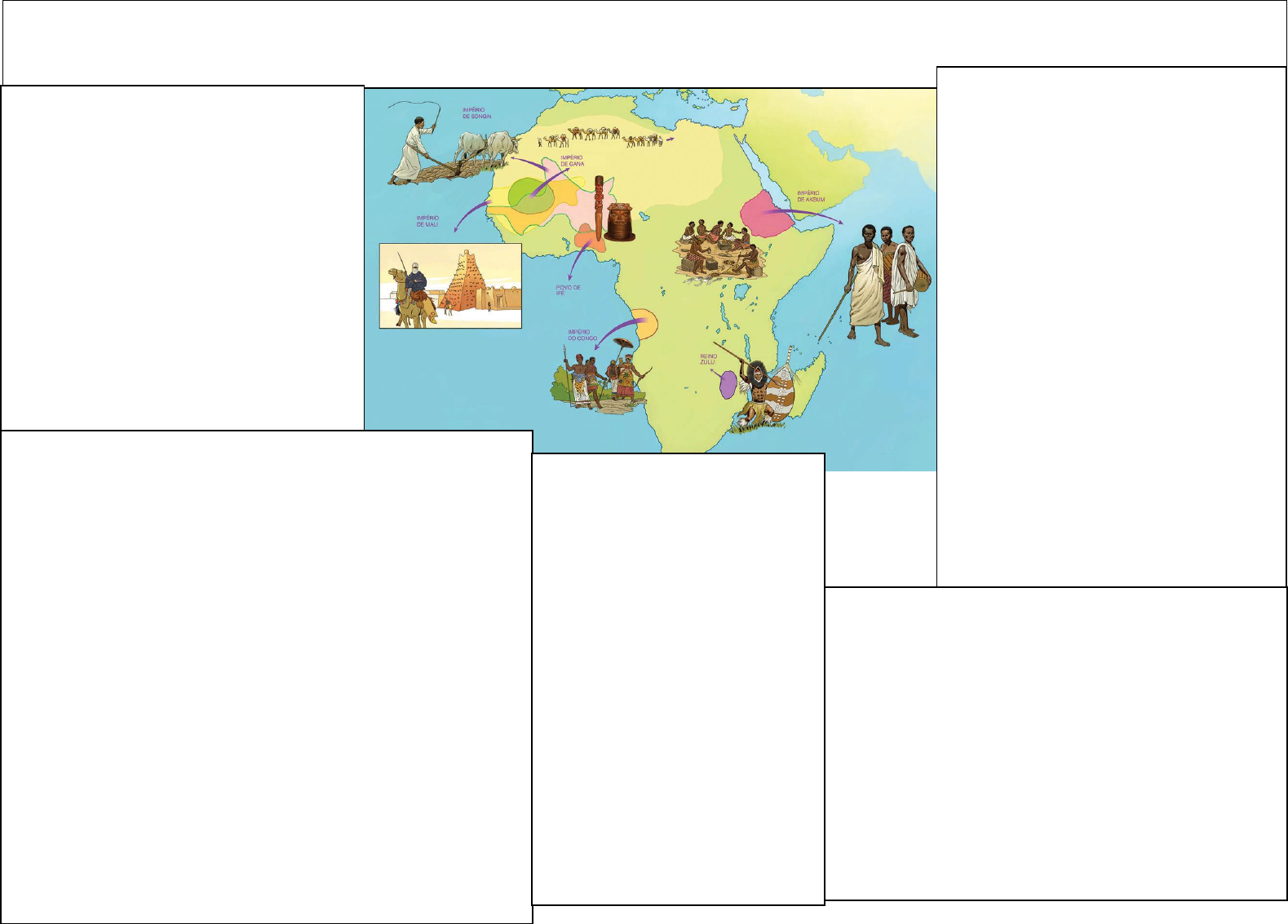 <p>A África dos grandes reinos e impérios</p><p>Antes de os europeus escravizarem os africanos, a partir do século XV, e colonizarem a África, no século XIX, diversas sociedades autônomas já existiam nesse continente, ou seja, as</p><p>sociedades africanas já tinham a sua própria história. Algumas sociedades africanas pré-coloniais, sob o comando de chefes poderosos, ampliaram suas áreas de influência e dominaram outros</p><p>povos, transformando-se, assim, em impérios e reinos prósperos e organizados, conforme relatos da época.</p><p>O reino de Gana: a “terra do ouro”</p><p>Localizado a oeste do continente africano, em uma</p><p>zona chamada Sael e ao sul do Deserto do Saara, região</p><p>também conhecida como África Subsaariana, o Reino de</p><p>Gana cresceu a partir do ano 300 e teve seu apogeu entre os</p><p>séculos IX e X, quando dominou os povos vizinhos e ocupou</p><p>uma faixa territorial maior do que ocupa nos dias de hoje.</p><p>O rei recebia o título de gana e era visto como elo</p><p>entre os deuses e os homens. Ele liderava um poderoso</p><p>exército e ocupava o topo de uma sociedade hierarquizada.</p><p>Sacerdotes, nobres e funcionários cuidavam da administração</p><p>do reino.</p><p>A população se dedicava à agricultura e à criação</p><p>de gado, mas o comércio era a principal atividade econômica</p><p>do reino. O Reino de Gana controlava as rotas de comércio</p><p>que atravessavam o Saara e chegava às cidades e aos portos</p><p>do norte África. Esse comércio era feito por meio de</p><p>caravanas de camelos, pois esses animais conseguem viver</p><p>com pouca quantidade de água.</p><p>O principal artigo transportado era o ouro retirado</p><p>das minas do sul de Gana, isso explica por que seus reis eram</p><p>chamados pelos povos do norte de “senhores do ouro”.</p><p>Durante o domínio português, Gana era chamada de Costa de</p><p>Ouro, por causa da grande quantidade de jazidas de ouro</p><p>nessa região. Atualmente, ao lado da exportação de cacau e</p><p>de madeira, a exploração de ouro ainda é uma das atividades</p><p>econômicas mais importantes do país. Gana é um dos maiores</p><p>produtores de ouro do mundo.</p><p>Também se comercializava o sal, extraído das</p><p>salinas do litoral ou das jazidas no deserto. Do norte vinham</p><p>produtos manufaturados, tecidos europeus asiáticos, barras de</p><p>cobre, contas de vidro e tipos diferentes de arma que</p><p>abasteciam as sociedades africanas.</p><p>O império do Mali: o “lugar onde o senhor reside”</p><p>Este império desenvolveu-se entre os séculos XIII e XVI, período em que impôs sua</p><p>hegemonia sobre a bacia do Rio Níger. Constituído pela atual República de Mali e algumas</p><p>regiões dos atuais Senegal e Guiné, o reino do Mali, no século XIV, expandiu-se por meio da</p><p>anexação das cidades de Tombuctu, Gao e Djenne que foram importantes cidades, centros de</p><p>troca e de concentração de pessoas, graças à rede de rios que fertilizava as terras e facilitava o</p><p>transporte na região.</p><p>O Mali era um império poderoso, pois controlava o comércio transaariano e as rotas</p><p>caravaneiras que se dirigiam para as principais cidades do reino, localizados em sua maioria às</p><p>bordas do Rio Níger, semelhante a rota comercial de Gana. O comércio e principalmente as</p><p>taxas sobre o tráfico de ouro, sal, escravos, marfim, noz-de-cola e outros produtos eram</p><p>fundamentais para a manutenção do Estado, da corte e do mansa. O artesanato era bastante</p><p>desenvolvido. Cada grupo de artesãos tinha seu representante junto ao imperador. Os</p><p>governantes do Mali recebiam o título de mansa. Viajantes árabes relatavam histórias de alguns</p><p>governantes que se tornaram famosos, como Sundiata, herói fundador que reinou de 1230 a</p><p>1255, e Mansa Musa, que governou entre 1312 e 1337.</p><p>A cidade de Tombuctu destacou-se como grande centro cultural do continente</p><p>africano, onde havia vastas bibliotecas, madrassas (universidades islâmicas) e magníficas</p><p>mesquitas que é o lugar onde a comunidade muçulmana se reúne para tratar de todas as questões</p><p>que lhe interessa, questões religiosas, sociais, políticas e locais e também para rezar. Além disso,</p><p>a cidade passou a ser o ponto de encontro de poetas, intelectuais e artistas da África e do Oriente</p><p>Médio. Mesmo após o declino do império, Tombuctu permaneceu como um dos principais polos</p><p>islâmicos da África subsaariana. Em 1988, a cidade de Timbuctu foi declarada patrimônio</p><p>mundial pela UNESCO.</p><p>Vale destacar que as 150 escolas que existiam em Tombuctu eram muito diferentes</p><p>das escolas medievais europeias. Não possuíam uma administração central, registros de</p><p>estudantes ou cursos pré- determinados. Eram formadas por diversas faculdades independentes.</p><p>Os estudantes se associavam a um único professor, o objetivo do ensino era transmitir os</p><p>ensinamentos do Alcorão, livro sagrado do islamismo.</p><p>É importante mencionar que o império do Mali e também de Gana assimilaram a</p><p>cultura e a religião islâmica. Maomé que viveu entre Meca e Medina, de 570 a 632, foi fundador</p><p>do Islã, que significa submissão a um deus, única e onipotente.</p><p>Reino do Congo: “saudações ao manicongo”</p><p>Fundado no século XIV, o reino do Congo abrangia grande extensão da</p><p>África centro-ocidental e se compunha de diversas províncias, governado por um</p><p>rei que recebia o título de Manicongo. Hoje a região que fazia parte do reino</p><p>Congo, recebe o nome de Republica Democrática do Congo.Os habitantes do reino</p><p>do Congo organizavam-se em vários clãs. Esses clãs eram compostos de pessoas</p><p>que acreditavam descender de um mesmo antepassado.</p><p>A base da economia do Congo era a agricultura, pastoreio e o comércio.</p><p>O comércio no território do Con