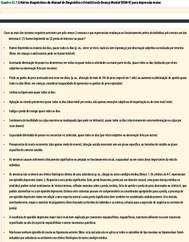 <p>Quadro 32.1 Critérios diagnósticos do Manual de Diagnóstico e Estatístico de Doença Mental (DSM-V) para depressão maior. Cinco ou mais dos sintomas seguintes presentes por pelo menos 2 semanas que representam mudanças no fundonamento prévio do individuo; pel 0 me nos um dos sintomas (1) humor deprimido ou (2) perda de interesse ou Humor deprimido na maioria dos dias, quase todos 05 dias (p. ex, sente-se triste, vazio ou sem esperança) por observação subjetiva ou realizada por terceiros (Nota: em crianças e adolescentes pode ser humor Acentua da diminuição do prazer desinteresse em todas quase todas as atividades na parte do dia, quase todos dias (indica dos por rel ato subje tivo ou observa feita por terceiros) Perda ou ganho de peso acentuado sem estar em dieta alteração de mais de 5% do peso corporal em 1 mês) ou aumento ou diminuição de apetite quase todos 05 dias (Nota: em crianças, considerar incapacidade de apresentar ganhos de peso esperados) nsonia ou hipersonia quase todos 05 dias Agitação ou retardo otor quase todos 05 dias (observável poroutros, não apenas sensações subjetivas de inquietação ou de estar mais ento) Fadiga e perda de energia quase todos 05 dias Sentimento de inutilidade ou culpa excessiva ou inadequada (que pode ser delirante), quase todos 05 dias (não meramente autorrecriminação ou culpa por estar doente) de diminuida de pensar ou indecisão, quase todos 05 dias (por relato subjetivo ou observação feita por outros) Pensamentos de morte recorrentes (não apenas medo de ideação suicida recorrente sem um plano ou tentativa de ou pl ano de cometer suicidio Os sintom as causa m sofrimento clinicamente significativo ou prejuizo no funcionamento social, ocupacional ou em outras áreas importantes da vida do individuo Os sintoma não se devem aos efeitos fisiológicos diretos de uma substância droga) ou outra condição médica (Notas: 1. Os critérios de A-C representam um episódio depressivo maior; 2. Respostas a uma perda significativa (luto, perda financeira, perda por um desastre natural, uma grave nça ou inval idez) podem induir sentimentos de tristeza intensa, reflexão excessiva sobre a perda, insônia, falta de apetite e perda de peso observados no critério A, que podem assemelhar-se a um episódio depressivo. Embora estes sintomas possam ser compre ou consider dos apropria dos para a perda, a presença de um episódio depressivo maior em adição a uma resposta normal a uma perda significativa deve também ser considerada Esta inevitavelmente, requero exercido de julgamento baseado na história do e as normas culturais para a expressão de la no contexto de perda) A de episódio de pressivo maior não é mais bem explicada por transtomo esquizoafetivo, transtorno delirante ououtro transtorno especificado ou não do espectro esquizofrênico e outros transtornos psicóticos Não houve nenhum episódio de mania ou hipomania anterior (Nota: esta exd usão não se apl se todos 05 episódios do tipo maniaco ou hipomaniaco forem induzidos por substância ouatribuíveis aos efeitos de outra condição médica</p>