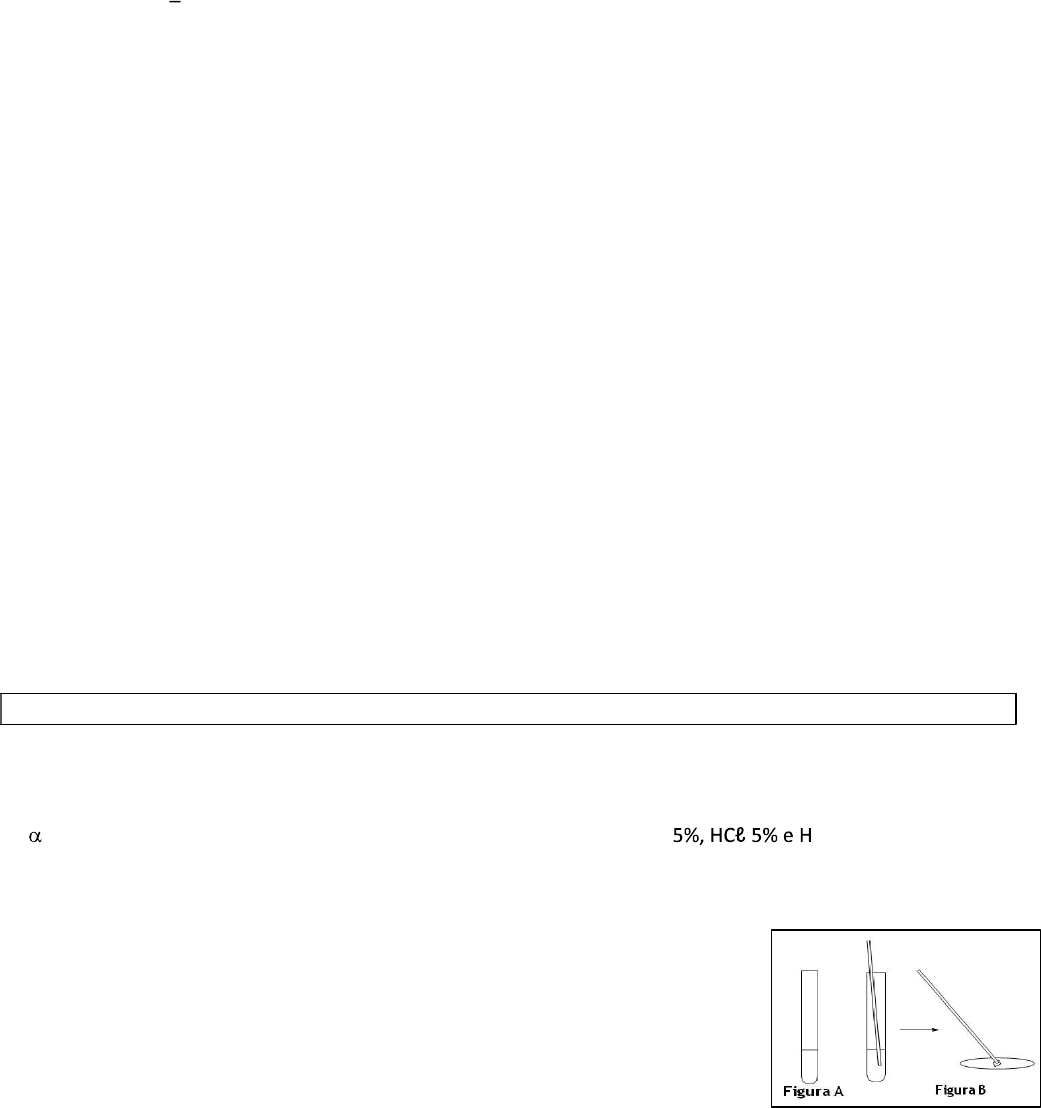 <p>21</p><p>PRÁTICA 03:</p><p>SOLUBILIDADE, ACIDEZ E BASICIDADE.</p><p>DATA: ___/___/___</p><p>1A. INTRODUÇÃO</p><p>Quando uma mistura de certa quantidade de um dado soluto e uma determinada quantidade de um</p><p>dado solvente forma uma mistura homogênea, diz-se que o primeiro é solúvel no último. Esta definição prática</p><p>é utilizada em vários modelos propostos para empregar a solubilidade como base de classificação dos</p><p>compostos orgânicos.</p><p>A solubilidade de um composto orgânico é mais bem compreendida relacionando-a com as forças</p><p>intermoleculares Forças de Van der Waals (dipolo induzido-dipolo induzido), atração dipolo-dipolo e ligações</p><p>de hidrogênio.</p><p>No processo de dissolução, as forças atrativas entre as moléculas do soluto devem ser rompidas e a</p><p>energia liberada ser suficiente para romper as forças de atração entre as moléculas do solvente. É necessário,</p><p>portanto, um estudo mais detalhado das relações entre a solubilidade e a constituição química dos compostos</p><p>orgânicos; porém, algumas generalizações podem ser feitas, tais como: "Um composto é mais solúvel no</p><p>solvente com o qual apresenta uma relação mais íntima de estrutura".</p><p>Assim, compostos orgânicos com até cinco átomos de carbono, contendo nitrogênio ou oxigênio, que</p><p>são polares e podem formar pontes de hidrogênio com a água, são solúveis neste solvente. Desta maneira, os</p><p>álcoois metílico e etílico são solúveis em água em todas as proporções, pois as forças intermoleculares entre</p><p>os álcoois e a água em solução são comparáveis àquelas nos líquidos puros.</p><p>Já o n-hexano, C6H14, um típico hidrocarboneto apolar, é muito pouco solúvel em água, porém é</p><p>completamente miscível com álcool n-butílico e álcoois maiores. Isto se explica pelo seguinte fato: "À medida</p><p>que o comprimento da cadeia aumenta, o composto tende a assemelhar-se mais ao hidrocarboneto e,</p><p>portanto, a solubilidade em compostos apolares aumenta, enquanto que na água diminui".</p><p>A relação entre a área superficial molecular e a solubilidade é importante, pois, observa-se que 2-metil-</p><p>2-butanol é claramente solúvel em água (12,5 g por 100 mL de água), enquanto que 1-pentanol está no limite</p><p>e 1-hexanol é insolúvel. Assim, "um álcool ramificado é geralmente mais solúvel em água do que um álcool</p><p>normal com o mesmo número de átomos de carbono".</p><p>Além da água, outros reagentes são empregados como "solventes" para a caracterização de compostos</p><p>orgânicos, e alguns destes testes de solubilidade incluem reações do tipo ácido-base.</p><p>2. OBJETIVO</p><p>Identificar o composto analisado, com base na sua solubilidade em determinados solventes.</p><p>3. PROCEDIMENTO EXPERIMENTAL</p><p>LEIA ATENTAMENTE AS FICHAS DE SEGURANÇA DOS REAGENTES NO FINAL DESTE MANUAL</p><p>Nesta experiência, um composto será dito solúvel em um dado solvente, se 0,1 g (sólido) ou 10 gotas</p><p>(líquido) for completamente miscível em 3 mL do solvente.</p><p>Nove compostos (ácido acético, ácido salicílico, anilina, benzofenona, clorobenzeno, dietilamina, etanol</p><p>e -naftol) terão suas solubilidades testadas em água, NaOH 5%, NaHCO3 2SO4 concentrado.</p><p>Observação: A anilina, a dietilamina e o H2SO4 concentrado deverão ser mantidos na capela.</p><p>Cada grupo submeterá os compostos a uma série de testes, de acordo com o fluxograma abaixo. Os</p><p>resultados deverão ser anotados na Tabela 1.</p><p>Para realizar os testes, proceda da seguinte maneira:</p><p>Coloque 10 gotas da amostra líquida ou 1(uma) espátula normal, em caso</p><p>de amostra sólida, em um tubo de ensaio e adicione 3 mL de água destilada</p><p>(Figura A).</p><p>Agite bem e verifique se a amostra é solúvel. Se o composto for solúvel em</p><p>água, faça o teste de pH utilizando um bastão de vidro para molhar o papel de pH</p><p>com uma gota da solução (Figura B).</p><p>Caso a amostra não se dissolva em água, prepare outro tubo com o mesmo composto e repita o teste</p><p>utilizando outros solventes de acordo com o fluxograma a seguir.</p><p>22</p><p>Fique atento às orientações a seguir:</p><p>a) O resíduo deverá ser descartado, imediatamente, após cada teste.</p><p>b) Para cada teste deverá ser utilizado um tubo de ensaio limpo.</p><p>c) O tubo de ensaio, para ser reutilizado, deverá ser lavado adequadamente com detergente e escova.</p><p>RESULTADOS DAS ANÁLISES</p><p>AMOSTRA H2O pH NaOH</p><p>(5 %)</p><p>NaHCO3</p><p>(5 %) HCl H2SO4</p><p>(conc) CONCLUSÃO</p><p>Entendendo o fluxograma</p><p>1. Testar a solubilidade de todas as amostras em</p><p>água medindo o pH para aquelas que forem</p><p>solúveis.</p><p>2. Para as amostras insolúveis em água testar a</p><p>solubilidade em hidróxido de sódio (NaOH - 5%)</p><p>3. Para as amostras solúveis em hidróxido de sódio</p><p>(NaOH - 5%) testar a solubilidade em</p><p>bicarbonato de sódio(NaHCO3 5%). A</p><p>solubilidade dessa amostra em bicarbonato de</p><p>sódio sugere a formação de um ácido forte,</p><p>enquanto a sua insolubilidade sugere a formação</p><p>de um ácido fraco.</p><p>4. Para as amostras insolúveis em hidróxido de</p><p>sódio (NaOH - 5%) testar a solubilidade em ácido</p><p>5. Para as amostras solúveis em ácido clorídrico</p><p>-se a formação de substância de</p><p>caráter básico.</p><p>6. Para as amostras insolúveis em ácido clorídrico</p><p>2SO4</p><p>concentrado).</p><p>7. Para as amostras solúveis em ácido sulfúrico</p><p>(H2SO4 concentrado), conclui-se que a amostra</p><p>é um composto neutro.</p><p>8. Para as amostras insolúveis em ácido sulfúrico</p><p>(H2SO4 concentrado), conclui-se que a amostra</p><p>é um composto inerte.</p><p>Seguindo o fluxograma</p><p>23</p><p>4. BIBLIOGRAFIA</p><p>1. ALLINGER, N. L.; Química Orgânica, Editora Guanabara 