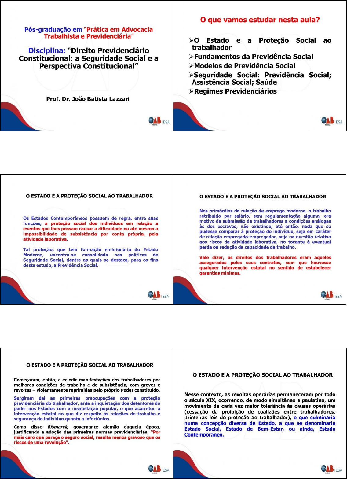 <p>o que vamos estudar nesta aula? Pós-graduação em "Prática em Advocacia Trabalhista e Previdenciária" Estado e a Proteção Social ao Disciplina: "Direito Previdenciário trabalhador Constitucional: a Seguridade Social e a Fundamentos da Previdência Social Perspectiva Constitucional" Modelos de Previdência Social Seguridade Social: Previdência Social; Assistência Social; Saúde Regimes Previdenciários Prof. Dr. João Batista Lazzari ESA ESA o ESTADO E A PROTEÇÃO SOCIAL AO TRABALHADOR o ESTADO E A PROTEÇÃO SOCIAL AO TRABALHADOR Nos primórdios da relação de emprego moderna, o trabalho Os Estados Contemporâneos possuem de regra, entre suas retribuído por salário, sem regulamentação alguma, era funções, a proteção social dos indivíduos em relação a motivo de submissão de trabalhadores a condições análogas eventos que lhes possam causar a dificuldade ou até mesmo a às dos escravos, não existindo, até então, nada que se impossibilidade de subsistência por conta própria, pela pudesse comparar à proteção do indivíduo, seja em caráter atividade laborativa. de relação empregado-empregador, seja na questão relativa aos riscos da atividade laborativa, no tocante à eventual Tal proteção, que tem formação embrionária do Estado perda ou redução da capacidade de trabalho. Moderno, encontra-se consolidada nas políticas de Vale dizer, os direitos dos trabalhadores eram aqueles Seguridade Social, dentre as quais se destaca, para os fins assegurados pelos seus contratos, sem que houvesse deste estudo, a Previdência Social. qualquer intervenção estatal no sentido de estabelecer garantias mínimas. ESA o ESTADO E A PROTEÇÃO SOCIAL AO TRABALHADOR o ESTADO E A PROTEÇÃO SOCIAL AO TRABALHADOR Começaram, então, a eclodir manifestações dos trabalhadores por melhores condições de trabalho e de subsistência, com greves e revoltas violentamente reprimidas pelo próprio Poder constituído. Nesse contexto, as revoltas operárias permaneceram por todo Surgiram daí as primeiras preocupações com a proteção o século XIX, ocorrendo, de modo simultâneo e paulatino, um previdenciária do trabalhador, ante a inquietação dos detentores do movimento de cada vez maior tolerância às causas operárias poder nos Estados com a insatisfação popular, o que acarretou a intervenção estatal no que diz respeito às relações de trabalho e (cessação da proibição de coalizões entre trabalhadores, segurança do indivíduo quanto a infortúnios. primeiras leis de proteção ao trabalhador), o que culminaria numa concepção diversa de Estado, a que se denominaria Como disse Bismarck, governante alemão daquela época, Estado Social, Estado de Bem-Estar, ou ainda, Estado justificando a adoção das primeiras normas previdenciárias: "Por Contemporâneo. mais caro que pareça o seguro social, resulta menos gravoso que os riscos de uma revolução". ESA</p><p>o ESTADO E A PROTEÇÃO SOCIAL AO TRABALHADOR o ESTADO E A PROTEÇÃO SOCIAL AO TRABALHADOR A marcha evolutiva do sistema de proteção, desde a Nem sempre, como visto, houve a preocupação efetiva com a assistência prestada por caridade até o estágio em que proteção dos indivíduos quanto a seus infortúnios. Somente em tempos mais recentes, a partir do final do século XIX, a questão se se mostra como um direito subjetivo, garantido pelo tornou importante dentro da ordem jurídica dos Estados. Estado e pela sociedade a seus membros, é o reflexo de três formas distintas de solução do problema: Comenta Russomano que "o mundo contemporâneo abandonou, há muito, os antigos conceitos da Justiça Comutativa, pois as a da beneficência entre pessoas; novas realidades sociais e econômicas, ao longo da História, a da assistência pública; e mostraram que não basta dar a cada um que é seu para que a a da previdência social, que culminou no ideal de sociedade seja justa. Na verdade, algumas vezes, é dando a cada seguridade social. um o que não é seu que se engrandece a condição humana e que se redime a injustiça dos grandes abismos sociais". ESA o ESTADO E A PROTEÇÃO SOCIAL AO TRABALHADOR A formação do conceito de bem-estar social A formação do conceito de bem-estar social Os ESTADOS DA EUROPA, precursores da ideia de proteção estatal ao indivíduo vítima de infortúnios, estabeleceram, de maneira gradativa, da segunda metade do século XIX até o início do século XX, um sistema jurídico que garantiria aos trabalhadores normas de proteção em relação aos seus empregadores nas suas relações contratuais, e um seguro mediante contribuição destes que consistia no direito a uma A primeira vez em que tem lugar uma mudança na concepção renda em caso de perda da capacidade de trabalho, por da proteção ao indivíduo ocorre na Declaração dos Direitos do velhice, doença ou invalidez, ou a pensão por morte, devida Homem e do Cidadão, em 1789, que inscreve o princípio da aos dependentes. Seguridade Social como direito subjetivo assegurado a todos: "Les secours publiques sont une dette sacrée". (Ajuda pública -Assim se define uma nova política social, não mais é uma dívida sagrada) meramente assistencialista está lançada a pedra fundamental da Previdência Social. ESA A formação do conceito de bem-estar social taxes taxpayer ideas disability Welfare Pós-graduação em "Prática em Advocacia security unemployment education creativity Trabalhista e Previdenciária" credit Reform sustainability local money economy protection vulnérable workforce training benefits confidence access flexible choice Disciplina: "Direito Previdenciário Passou-se a entender que a proteção social era dever da Constitucional: a Seguridade Social e a sociedade como um todo, apresentando o caráter de Perspectiva Constitucional" solidariedade até hoje presente, pelo qual todos contribuem para que os necessitados de amparo possam tê-lo. Este conceito é fundamental para a noção de