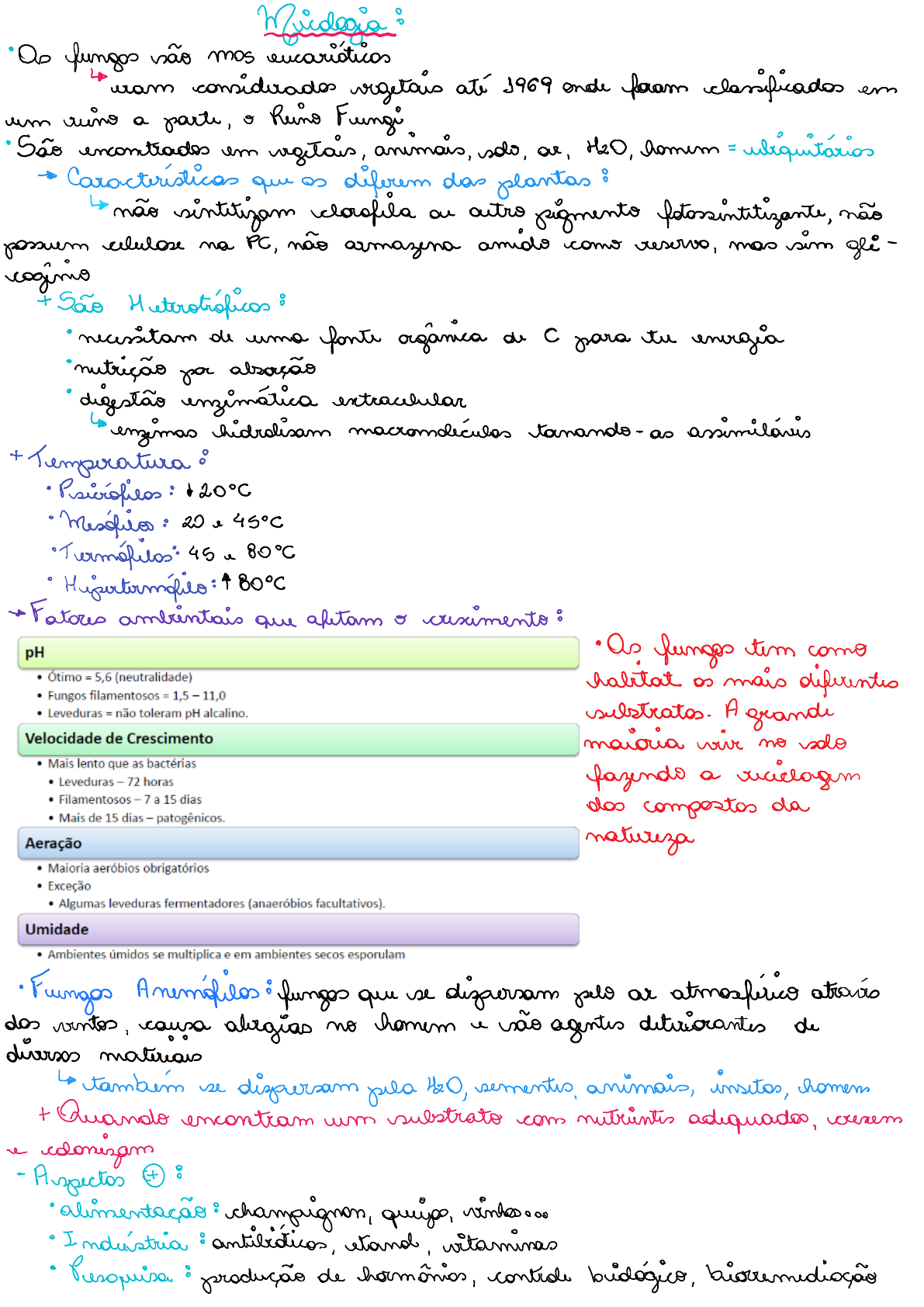<p>fungos mos ate 1969 classificados em um a Fungi em animais, H2O, homem = que as diferem das plantas sintitizam ou autro PC, não armazena como mas sim : necessitam de uma fonte organica de C para tu energia nutrição inzimatica extracelular enzimas hidrolisam assimilaris + 20°C : 20 45°C 45 80°C 4 80°C que afetam pH as funges tem como Ótimo = 5,6 (neutralidade) habitat mais Fungos filamentosos = 1,5 -11,0 Leveduras = não toleram pH alcalino. substrates. A grande Velocidade de Crescimento maioria wive no Mais lento que as bactérias Leveduras - 72 horas fazendo a Filamentosos - 7 a 15 dias compostos da Mais de 15 dias - patogênicos. Aeração Maioria aeróbios obrigatórios Exceção Algumas leveduras fermentadores (anaeróbios facultativos). Umidade Ambientes úmidos se multiplica e em ambientes secos esporulam funges que se pelo or atravis causa no homem u de se pila animais, + Quando encontram wm substrato com : alimentação I : vitaminas : de controle</p><p>: em plantas animais : alimentos alugias, medica: fungos processos que was de ati I - - - de alimentos + que de micose : Fatores externos (micoses indumentaria que now u aquation internos por autro mos, t classificadas as Superficiais : camadas mais superficiais do pele pilos pilo unhas : pele tecidos profundas : atingum da Manoproteínas PC por Glucana quitina, lipidios proteinas Quitina Ergosterol LAMOSSOMOS ??? PAREDE CELULAR estrutura choque osmótico APARELHO DE GOLGI até 8 camadas (200 a 350 nm) agregação interna de glucanas, mananas membranas quitina, proteínas e lipídios armazenamento de que serão MEMBRANA CITOPLASMATICA excretadas barreira semipermeável porção e hidrofilica RETÍCULO esteróis (# bactérias) proteínas e oxidativa RIBOSSOMOS de síntese proteica VACUOLO genoma cromossomos lineares, dupla-helice armazenamento de de reserva histonas nucléolo (DNA, RNA, proteínas)</p><p>Caracteristicas Os - : uni apresentam use 2 em ambrintais + fama u em de cultura a mas quando a 25°C forma mentosa + Outros que dimorfismo a du do re de fungos importante para a Ambas as famas saw de produzir no as filamentosas do SI mais colonias cremesas, de u (72H) a cuca de de u 5 a de Podem formar cadrias pela de individuais, Pseudo-hifa chamadas de - - hilo broto ou + Reproduzem - se brotamento. Apropria cilula cumpre gêmula a funcas no célula-mãe algumas original Blastocon(dio Fungos granulars : branco a a contaminação do or fungoo dias corpo is composto de longes filamentos de conectados as que a unidade do fungo podem : : quando was poros que com que cito plasma das use</p><p>hifo systado conjunto de is denominado ou talo Estrutura reprodutora urgetativo no do funcionands celemento de de absorção de Hifa não septada Estruturas produtoras Micelio aereo Hifas de esporos progeta na super ficio do mio de tura a sexuado Micélio A fungoo chamada de telemor on a de + Brotamento process de origin a parental um em sua medida I broto I do parental use doo migeo para material Micelio vegetativo PC entre broto Q cilula - que uma de ( - Binaria on a - mando 2 fillas de iguais + a hifas que mento u aumento de tamanho. Esporos for de hipas que systadas estruturas denominadas process interno de divagem de A Hifas do quando tas de (+) u de celulas (-) localizadas O de umo cilula - com de umo gerando wm for originam -se de 40 8 ha-</p><p>indi- que gametas (+) (-) no mismo + fungos com pases du que a Gestruturas originam - do estruturas que no interior oh estruturas chamadas que no interior de u sexuais externos : de que no interior basidios. doo Ostiolo Ascos Asco Apotécio Cleistotécio Peritécio Ascocarpos</p><p>microbiologico fungoo : material clinico depende do do superficiais examas de pile u unhas : u + profundas u LCR metado permite a do fungo iden de KOH : cado 100 de 2g de tinto Parker Nankin amostro no umo do descrito acimo, em de examinar no com de com de Os considerados mate que como de energie LD de necessitam 4 elementos H,O,C N, de em quantidade P, Cu, mb, sendo que alouns fungos aindo de diterminados de determinados de como a tiamino mio artificial basico I agar (ASD) que como fonte de a como fonte N, no que do bact ASD de recomends so I use de em tubes, a com facilidade contido em placas Agar com de c) ABD Culturo a 30°C 30 a 40 dias de fungo em mio culturo que agente do A funges no de e no pode em culturo Culturo em lamino Técnica de microcultivo para análise microscópica de fungos filamentosos de dias Lâmina Bastão de vidro Laminula 4 inóculos de fungo nas laterais do cubo Cubo de Água estéril sobre ágar papel de filtro</p><p>com de umo as u do pingar umo goto de azul de algodas u montar culo pingar de corante azul com Obs em com de 40x, I u do de Atividade fungos avaliado pars : de fontes de C N i umo i u pilo de no do u as oh de + no causado for oh climas - ABD- 5 e 10 dias de incubação. cais de origin do infecção com as + N que mas marrom exuro as dias 5 se assume the N, mas produz Agentis ser pars a cilulo do + me tratamento das derm : de estado geral do em 2 To a MP 2. Atwam IC Poliênicos (produzidos por espécies de Streptomyces), vitais ex. Anfotericina-B (micoses profundas), nistatina (candidíase cutânea/ tópico e via oral), primaricina (actidione), não pode ser empregados como (candidíase, aspergilose); medicamentos para o homem. - Imidazólicos (inibem as enzimas P450 fúngicas, -Griseofulvina (dermatofitoses/ quadros crônicos); responsáveis pela síntese do ergosterol, o principal esterol encontrado na membrana das células fúngicas), 5-fluorocitosina, sinergismo com anfotericina-B; ex. Cetoconazol, fluconazol, itraconazol..</p><p>Teste de sensibilidade as drogas antifúngicas A AB 100% 16 8 4 2 1 0.5 0.25 0,12 0,06 C+ de inibição (NCCLS) 90% CIM (EUCAST) Azóis 80% 64 32 16 8 4 2 1 0,5 0,25 C+ Inibição (MACRO) 50% de inibição CIM (MICRO)</p>