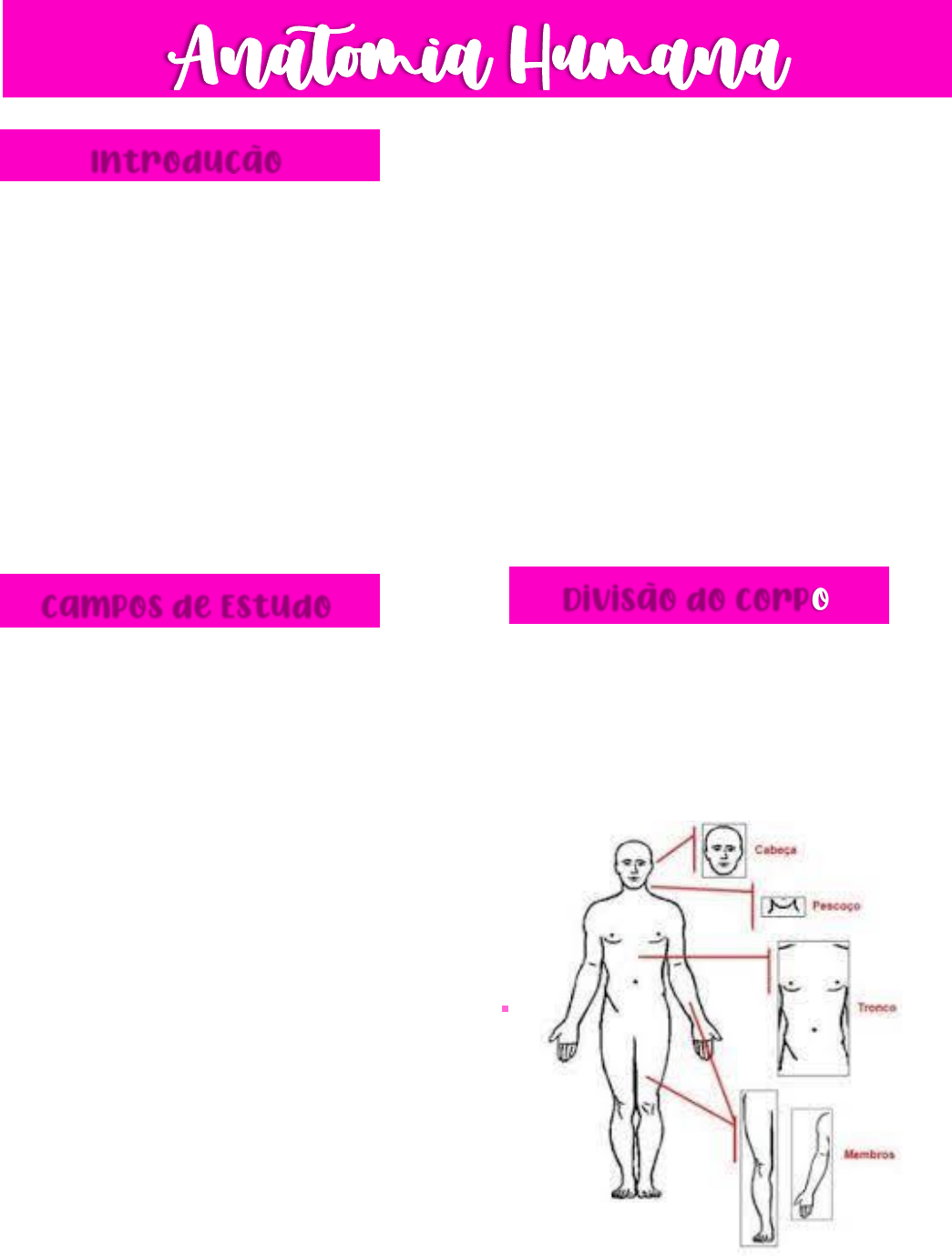 <p>Maria Leticia Alves dos Santos</p><p>Estácio - Nutrição</p><p>➢ Estudo do corpo humano.</p><p>➢ É a ciência que estuda as estruturas e</p><p>os sistemas do corpo humano</p><p>classificados em ESQUELETICO,</p><p>MUSCULAR, ARTICULAR, NERVOSO,</p><p>CIRCULATÓRIO, RESPIRATÓRIO,</p><p>DIGETIVO, URINÁRIO, REPRODUTOR,</p><p>ENDOCRINO E LINFATICO.</p><p>ANA= EM PARTES</p><p>TOMEIN= CORTAR</p><p>• Anatomia Regional ou Cirúrgica:</p><p>divide o corpo em regiões e nestas</p><p>é feito um estudo de suas</p><p>estruturas e relações. EX: o copo</p><p>pode ser dividido em Cabeça e</p><p>Pescoço, Tórax e Abdome....</p><p>• Anatomia Clinica ou Aplicada:</p><p>estudo com ênfase nos aspectos</p><p>da estrutura, função e patologia</p><p>do corpo que são importantes no</p><p>•</p><p>.exercício das profissões da área da</p><p>saúde.</p><p>• Anatomia Palpatória: estudo com</p><p>base na palpação das estruturas</p><p>superficiais e profundas.</p><p>• Anatomia do Desenvolvimento:</p><p>focaliza o desenvolvimento do</p><p>corpo a partir do ovo fertilizado até</p><p>a forma adulta. Está associada a</p><p>Embriologia Humana.</p><p>• Anatomia Radiológica: onde o corpo</p><p>pode ser visualizado por meio de</p><p>técnicas radiológicas.</p><p>• Anatomia Comparada: estabelece</p><p>comparações entre os aspectos</p><p>anatômicos de diferentes animais.</p><p>➢ Cabeça</p><p>➢ Pescoço</p><p>➢ Tronco</p><p>➢ MMSS e MMII</p><p>Introdução</p><p>Divisão do corpo</p><p>humano</p><p>Campos de Estudo</p><p>.</p><p>➢ O indivíduo está em pé, com a face</p><p>voltada para frente e o olhar dirigido</p><p>para o horizonte. Os membros</p><p>superiores ficam estendidos e</p><p>aplicados ao tronco, com as palmas</p><p>das mãos voltadas para frente. Os</p><p>membros inferiores ficam unidos com</p><p>as pontas dos pés dirigidas para a</p><p>frente.</p><p>Superior = Cranial e Inferior = Caudal</p><p>Anterior = Ventral e Posterior = Dorsal</p><p>Medial e Lateral = relação a proximidade</p><p>da linha medial.</p><p>Superficial Intermédio e Profundo =</p><p>relação de profundidade.</p><p>Proximal e Distal = relação de proximidade</p><p>da origem do membro. ao tronco</p><p>Termos de lateralidade.</p><p>Bilateral = estrutura par localizada em</p><p>ambos os lados do corpo.</p><p>Unilateral = estruturas localizadas em</p><p>apenas um dos lados do corpo</p><p>Homolateral ou Ipsilateral = estruturas</p><p>localizadas do mesmo lado.</p><p>Contralateral = estruturas de lados opostos.</p><p>➢ Plano Sagital: divide o corpo em laterais</p><p>direita e esquerda.</p><p>➢ Plano Coronal ou Frontal: divide o corpo</p><p>em partes anterior e posterior.</p><p>➢ Plano Transversal: divide o corpo em</p><p>partes superior e inferior.</p><p>➢ Eixo Látero - Lateral: estende-se de um</p><p>lado ao outro.</p><p>➢ Eixo Ântero - Posterior: estende-se em</p><p>sentido anterior para posterior,</p><p>perpendicular ao plano sagital.</p><p>➢ Eixo Crânio – Caudal: estende-se do</p><p>superior para o inferior ou vice-versa.</p><p>Posição Anatómica</p><p>Terminologia Anatómica</p><p>Planos e Eixos</p><p>• Conjunto de ossos e cartilagens que</p><p>se interligam para formar o</p><p>arcabouço do corpo e desempenha</p><p>diversas funções</p><p>- Sustentação</p><p>- Proteção</p><p>- Movimentação</p><p>- Produção de células sanguíneas</p><p>- Reserva de minerais</p><p>Divisão do Esqueleto</p><p>➢ Esqueleto Axial: mediano, formando</p><p>o eixo do corpo e composto pelos</p><p>ossos da cabeça, pescoço e</p><p>seguidos pela coluna e tronco.</p><p>➢ Esqueleto Apendicular: lateralizado,</p><p>formado pelos pêndulos (membros</p><p>inferiores e superiores)</p><p>• Cinturas: são duas porções osseas que</p><p>unem os membros ao tronco. São</p><p>elas: Escapular e Pélvica.</p><p>NÚMERO DE OSSOS</p><p>• O número de ossos varia se levarmos</p><p>em consideração os seguintes fatores:</p><p>- Idade</p><p>- Individuais</p><p>- Critério de contagem</p><p>• Adultos com o desenvolvimento</p><p>completo tem aproximadamente 206</p><p>ossos.</p><p>• Um recém nascido tem em média 305</p><p>ossos.</p><p>Classificação dos Ossos</p><p>• Ossos Longos: apresentem o</p><p>comprimento maio que a largura,</p><p>também chamados de tubulares.</p><p>EPÍFISE/DIÁFISE/METÁFISE</p><p>Ex: Úmero, Rádio, Ulna, Metacarpos...</p><p>• Ossos Curtos: apresenta equivalência</p><p>em suas três dimensões.</p><p>Ex: Ossos do carpo, ossos do tarso.</p><p>(não se precisa muitos movimentos,</p><p>mas força)</p><p>Sistema Esquelético</p><p>• Ossos Laminares: planos, são aqueles</p><p>que apresentam comprimento e</p><p>largura equivalentes, predominando</p><p>sobre a espessura.</p><p>Ex: Ossos do crânio (parietal, frontal,</p><p>occipital), escápula e quadril.</p><p>• Ossos Irregulares: com morfologia</p><p>complexa, não possui correspondência</p><p>conhecida</p><p>Ex: Vértebras, Maxilar e Osso</p><p>Temporal</p><p>• Ossos Pneumáticos: que apresentam</p><p>uma ou mais cavidades, de forma</p><p>variável, revestidos de mucosa e</p><p>contendo ar.</p><p>Ex: Frontal, Maxilar, Etmóide e</p><p>Esfenóide</p><p>• Ossos Sessamóides: que se</p><p>desenvolvem na substância de certos</p><p>tendões ou cápsulas fibrosa</p><p>desenvolvendo ou protegendo certas</p><p>articulações. Ex: Patela</p><p>Tipos de Substâncias</p><p>• Compactas: células mais próximas</p><p>• Esponjosas: células mais distantes</p><p>❖ Periósteo: superfície articular</p><p>conjuntiva que envolve os ossos, a</p><p>exceção das articulações. Apresenta</p><p>dois folhetos, um superficial, suprido</p><p>de vãos nervosos, e outro profundo,</p><p>onde são produzidas as células osseas.</p><p>❖ Endósteo: é a fina camada de tecido</p><p>conjuntivo que reveste o canal ou</p><p>cavidade medular.</p><p>❖ Nutrição Óssea: os ossos são</p><p>altamente vascularizados e inevardos.</