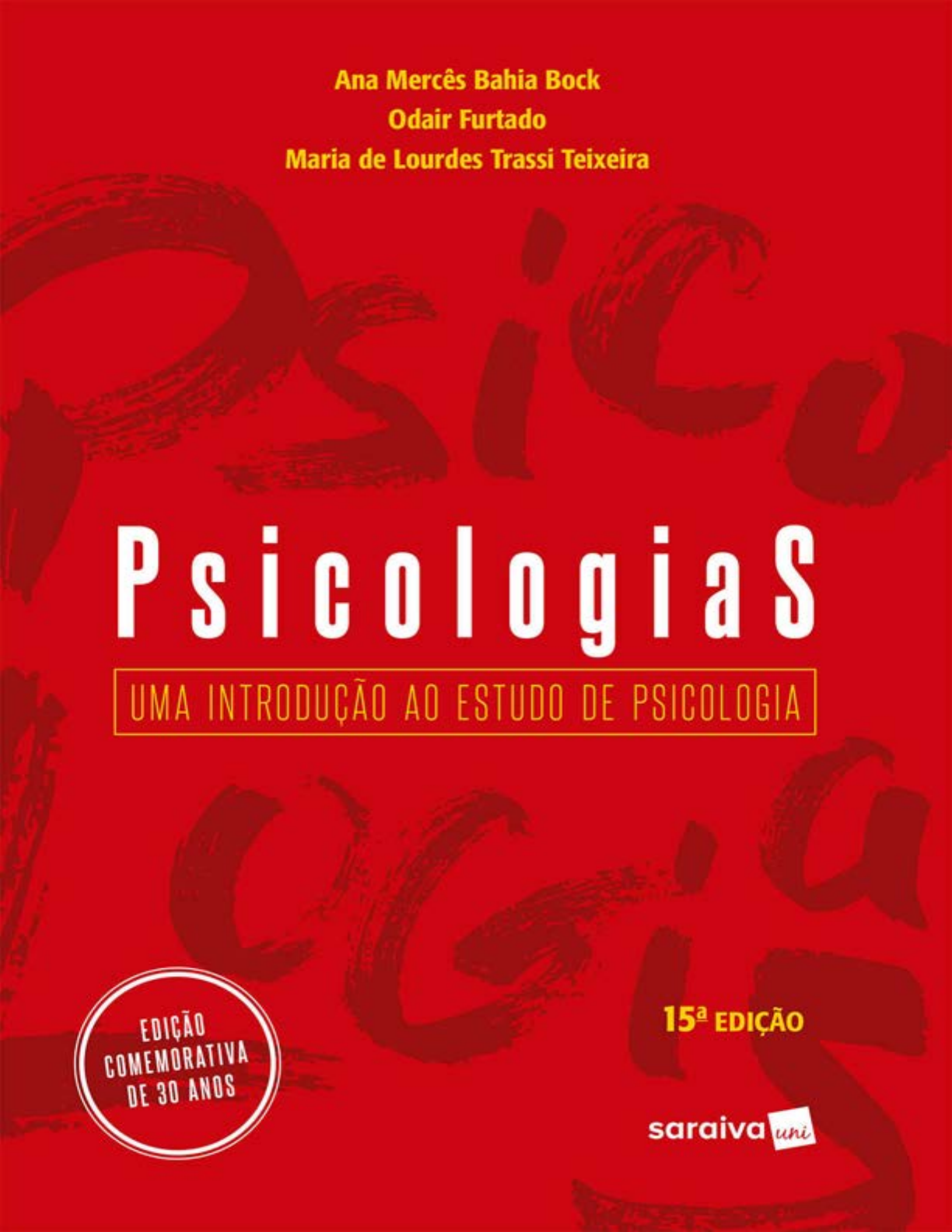 <p>Av. das Nações Unidas, 7221, 1o Andar, Setor B</p><p>Pinheiros – São Paulo – SP – CEP: 05425-902</p><p>PABX (11) 3613-3000</p><p>SAC</p><p>0800-0117875</p><p>De 2a a 6a, das 8h30 às 19h30</p><p>www.editorasaraiva.com.br/contato</p><p>Diretoria executiva Flávia Alves Bravin</p><p>Diretora editorial Renata Pascual Müller</p><p>Gestão editorial Rita de Cássia S. Puoço</p><p>Aquisições</p><p>Fernando Alves (coord.)</p><p>Julia D’Allevo</p><p>Edição Ana Laura Valerio</p><p>Neto Bach</p><p>Thiago Fraga</p><p>Produtoras editoriais Alline Garcia Bullara</p><p>Amanda M. Loyola</p><p>Daniela Nogueira Secondo</p><p>Suporte editorial Juliana Bojczuk Fermino</p><p>Revisão Beatriz Simões</p><p>Diagramação e capa Caio Cardoso</p><p>http://www.editorasaraiva.com.br/contato</p><p>Adaptação para eBook Cinthia Guedes</p><p>ISBN 978-85-53131-31-0</p><p>DADOS INTERNACIONAIS DE CATALOGAÇÃO NA PUBLICAÇÃO (CIP)</p><p>ANGÉLICA ILACQUA CRB-8/7057</p><p>B648p</p><p>Bock, Ana Mercês Bahia</p><p>Psicologias: uma introdução ao estudo de psicologia / Ana Merces Bahia</p><p>Bock, Maria de Lourdes Trassi Teixeira, Odair Furtado. – 15.ed. – São Paulo:</p><p>Saraiva Educação, 2018.</p><p>Bibliografia</p><p>ISBN 978-85-53131-31-0</p><p>1. Psicologia. I. Teixeira, Maria de Lourdes Trassi. II. Furtado. Odair.</p><p>III.Título.</p><p>CDD 150</p><p>CDU 150.1</p><p>Índices para catálogo sistemático:</p><p>1. Psicologia</p><p>Copyright © Ana Mercês Bahia Bock, Odair Furtado e Maria de Lourdes Trassi</p><p>Teixeira</p><p>2018 Editora Saraiva</p><p>Todos os direitos reservados.</p><p>15a edição</p><p>Nenhuma parte desta publicação poderá ser reproduzida por qualquer meio ou</p><p>forma sem a prévia autorização da Editora Saraiva. A violação dos direitos</p><p>autorais é crime estabelecido na lei n° 9.610/98 e punido pelo artigo 184 do</p><p>Código Penal.</p><p>CL 651.521</p><p>Sobre os autores</p><p>Ana Mercês Bahia Bock</p><p>Doutora em Psicologia Social pela Pontifícia Universidade Católica</p><p>de São Paulo (PUC-SP). Professora Titular de Psicologia Social do</p><p>curso de Psicologia da Faculdade de Ciências Humanas e da Saúde</p><p>da PUC-SP. Professora do programa de estudos pós-graduados em</p><p>Educação: Psicologia da Educação da PUC-SP.</p><p>Odair Furtado</p><p>Doutor em Psicologia Social pela Pontifícia Universidade Católica de</p><p>São Paulo (PUC-SP). Professor Associado de Psicologia Social do</p><p>curso de Psicologia da Faculdade de Ciências Humanas e da Saúde</p><p>da PUC-SP. Professor do programa de estudos pós-graduados em</p><p>Psicologia Social da PUC-SP.</p><p>Maria de Lourdes Trassi Teixeira</p><p>Psicanalista, doutora em Serviço Social pela Pontifícia Universidade</p><p>Católica de São Paulo (PUC-SP). Professora e supervisora da área</p><p>de criança, adolescente e instituições do curso de Psicologia da</p><p>Faculdade de Ciências Humanas e da Saúde da PUC-SP.</p><p>Consultora e supervisora de equipes profissionais de programas e</p><p>serviços da área de criança e adolescente em condições de</p><p>vulnerabilidade.</p><p>Apresentação</p><p>PsicologiaS é uma introdução ao estudo da Psicologia,</p><p>apresentada em seus vários aspectos: história, abordagens teóricas,</p><p>temas básicos, áreas de conhecimento, principais características da</p><p>profissão e análise de temas cotidianos. Desde a primeira edição,</p><p>tivemos a certeza de que ensinar a diversidade do universo da</p><p>Psicologia é a melhor forma de iniciar o aprendizado dessa ciência.</p><p>Daí, a escolha do título: PsicologiaS.</p><p>Ao longo desses anos, esta obra permitiu e provocou o nosso</p><p>diálogo com estudantes e professores de cursos do Ensino Médio e</p><p>de várias áreas do Ensino Superior em que a Psicologia está</p><p>inserida. Esse fato nos motiva a estar atentos e atualizar os</p><p>conteúdos, buscando acompanhar o desenvolvimento da Psicologia</p><p>como ciência e como profissão, permitindo ampliar sua contribuição</p><p>para a leitura dos fenômenos sociais.</p><p>Assim, todos os capítulos foram avaliados, alguns ampliados e</p><p>outros substituídos e incluídos. Você vai perceber que houve uma</p><p>reorganização que o ajudará na discussão dos assuntos e na</p><p>aprendizagem da Psicologia.</p><p>Esta nova edição de PsicologiaS buscou atualizar os</p><p>conhecimentos produzidos na área a partir dos últimos estudos,</p><p>pesquisas e publicações nos diferentes aspectos e assuntos</p><p>relacionados a essa ciência e, também, quanto a novas práticas em</p><p>psicologia e novos olhares para fenômenos da cultura. Essa</p><p>atualização é uma exigência ao considerar a existência desses</p><p>fenômenos, as repercussões na produção da subjetividade e as</p><p>contribuições de áreas afins de conhecimento.</p><p>Os capítulos estão distribuídos em quatro partes:</p><p>■ Parte I – A caracterização da Psicologia: visão geral da</p><p>Psicologia: sua história, seu objeto de estudo, as principais teorias</p><p>e a profissão de psicólogo.</p><p>■ Parte II – Áreas de conhecimento da Psicologia: aspectos do</p><p>processo da construção da subjetividade.</p><p>■ Parte III – Temas teóricos em Psicologia: temas relevantes e</p><p>presentes nas diferentes abordagens teóricas e áreas do</p><p>conhecimento.</p><p>■ Parte IV – Psicologia: uma leitura da realidade: leitura de</p><p>fenômenos do mundo social a partir do olhar da Psicologia. Este</p><p>estudo proporciona ao leitor uma visão crítica dos fenômenos</p><p>sociais e, consequentemente, maior lucidez quanto à atuação</p><p>presente e futura nos grupos sociais a que pertence e na</p><p>coletividade.</p><p>Todos os capítulos estão subdivididos em seções a fim de permitir</p><p>melhor compreensão e assimilação do conteúdo. Cada capítulo</p><p>inclui as seguintes seções:</p><p>TEXTO COMPLEMENT
