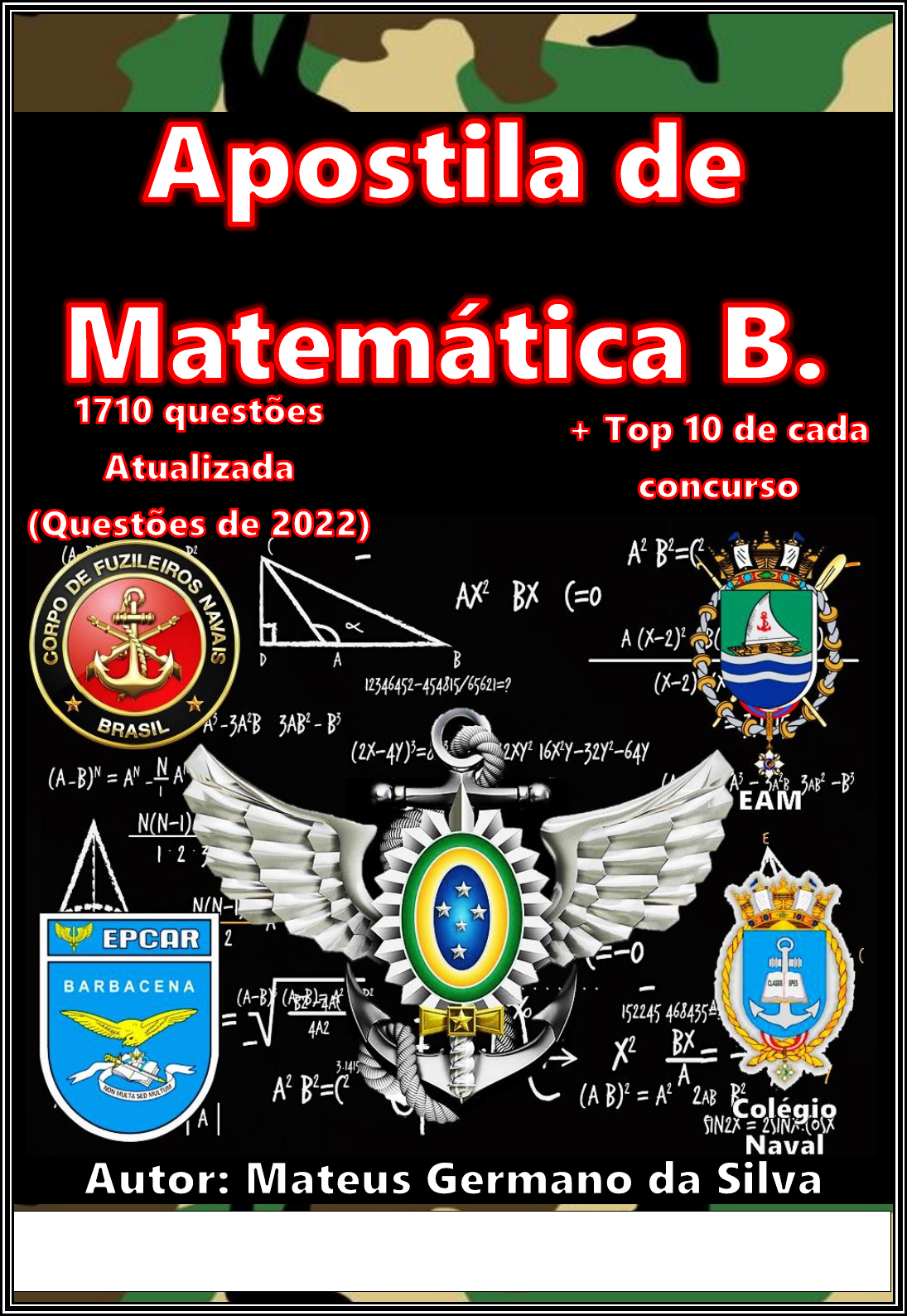 <p>Aluno:</p><p>.</p><p>Autor: Mateus Germano da Silva</p><p>Instagram: @mateus.germano.2001</p><p>Concursos Militares abordados: Fuzileiro Naval (CFN), EAM,</p><p>EPCAR e Colégio Naval</p><p>Sumário</p><p>• Conteúdo Programático de cada concurso ------------------------------------------------- 6</p><p>• Relação de questões por concurso em cada assunto ------------------------------------- 10</p><p>• Top 10 de Matemática de cada Concurso ------------------------------------------------- 11</p><p>Raciocínio Lógico e Problemas Diversos ------------------------------------ 12</p><p>• Gabarito ------------------------------------------------------------------------------------------ 18</p><p>Aritmética ------------------------------------------------------------------------- 19</p><p>• Múltiplos e Divisores -------------------------------------------------------------------------- 19</p><p>➢ Gabarito --------------------------------------------------------------------------------------- 21</p><p>• M.M.C. e M.D.C. ------------------------------------------------------------------------------- 22</p><p>➢ Gabarito --------------------------------------------------------------------------------------- 25</p><p>• Frações e Números Decimais ---------------------------------------------------------------- 26</p><p>➢ Gabarito --------------------------------------------------------------------------------------- 29</p><p>• Dízimas Periódicas ----------------------------------------------------------------------------- 30</p><p>➢ Gabarito --------------------------------------------------------------------------------------- 32</p><p>• Sistema Métrico Decimal --------------------------------------------------------------------- 33</p><p>➢ Gabarito --------------------------------------------------------------------------------------- 35</p><p>• Potenciação e Radiciação --------------------------------------------------------------------- 36</p><p>➢ Gabarito --------------------------------------------------------------------------------------- 41</p><p>• Razões e Proporções --------------------------------------------------------------------------- 42</p><p>➢ Gabarito --------------------------------------------------------------------------------------- 46</p><p>• Regra de Três ----------------------------------------------------------------------------------- 47</p><p>➢ Gabarito --------------------------------------------------------------------------------------- 51</p><p>• Porcentagens ------------------------------------------------------------------------------------ 52</p><p>➢ Gabarito --------------------------------------------------------------------------------------- 56</p><p>• Noções de Matemática Financeira ---------------------------------------------------------- 57</p><p>➢ Juros Simples -------------------------------------------------------------------------------- 57</p><p>➢ Juros Compostos ----------------------------------------------------------------------------- 59</p><p>➢ Gabarito --------------------------------------------------------------------------------------- 61</p><p>• Noções de Estatística Básica ----------------------------------------------------------------- 62</p><p>➢ Tabelas e Representação Gráfica ---------------------------------------------------------- 62</p><p>➢ Cálculo de Médias --------------------------------------------------------------------------- 66</p><p>➢ Gabarito --------------------------------------------------------------------------------------- 68</p><p>Álgebra --------------------------------------------------------------------------------------------- 69</p><p>• Conjuntos ---------------------------------------------------------------------------------------- 69</p><p>➢ Operações com Conjuntos ----------------------------------------------------------------- 69</p><p>➢ Diagrama de Venn -------------------------------------------------------------------------- 70</p><p>➢ Gabarito --------------------------------------------------------------------------------------- 74</p><p>• Conjuntos Numéricos ------------------------------------------------------------------------- 75</p><p>➢ Operações com Conjuntos Numéricos ---------------------------------------------------- 75</p><p>➢ Intervalos Reais ------------------------------------------------------------------------------ 77</p><p>➢ Gabarito --------------------------------------------------------------------------------------- 79</p><p>• Polinômios --------------------------------------------------------------------------------------- 80</p><p>➢ Gabarito --------------------------------------------------------------------------------------- 82</p><p>• Equações Algébricas --------------------------------------------------------------------------- 83</p><p>➢ Gabarito --------------------------------------------------------------------------------------- 88</p><p>• Equações do 1º Grau -------------------------------------------------------------------------- 89</p><p>➢ Gabarito --------------------------------------------------------------------------------------- 94</p><p>• Inequações do 1º Grau ------------------------------------------------------------------------ 95</p><p>➢ Gabarito --------------------------------------------------------------------------------------- 97</p><p>• Equações do 2º Grau -------------------------------------------------------------------------- 98</p><p>➢ Gabarito ------------------------------------------------------------------------------------- 102</p><p>• Inequações do 2º Grau ----------------------------------------------------------------------- 103</p><p>➢ Gabarito ------------------------------------------------------------------------------------- 104</p><p>• Equações Irracionais ------