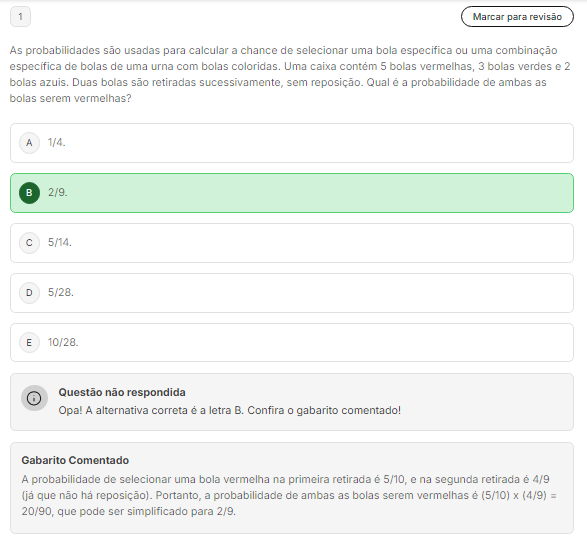 <p>1 Marcar para revisão As probabilidades são usadas para calcular a chance de selecionar uma bola especifica ou uma combinação específica de bolas de uma urna com bolas coloridas. Uma caixa contém 5 bolas vermelhas, 3 bolas verdes e 2 bolas azuis, Duas bolas são retiradas sucessivamente, sem reposição. Qual é a probabilidade de ambas as bolas serem vermelhas? A B 2/9. 5/14. D 5/28. E 10/28. Questão não respondida Opa! A alternativa correta é a letra B. Confira gabarito comentado! Gabarito Comentado A probabilidade de selecionar uma bola vermelha na primeira retirada é 5/10, e na segunda retirada é 4/9 (já que não há Portanto, a probabilidade de ambas as bolas serem vermelhas é (5/10) (4/9) = 20/90, que pode ser simplificado para 2/9.</p>