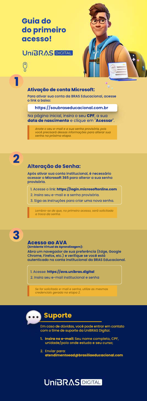 <p>Guia do</p><p>do primeiro</p><p>acesso!</p><p>Na página inicial, insira o seu CPF, a sua</p><p>data de nascimento e clique em "Acessar".</p><p>https://soubraseducacional.com.br</p><p>Anote o seu e-mail e a sua senha provisória, pois</p><p>você precisará dessas informações para alterar sua</p><p>senha na próxima etapa.</p><p>Para ativar sua conta da BRAS Educacional, acesse</p><p>o link a baixo:</p><p>Ativação de conta Microsoft:</p><p>1</p><p>Lembre-se de que, no primeiro acesso, será solicitada</p><p>a troca da senha.</p><p>Após ativar sua conta institucional, é necessário</p><p>acessar o Microsoft 365 para alterar a sua senha</p><p>provisória.</p><p>1. Acesse o link: https://login.microsoftonline.com</p><p>2. Insira seu e-mail e a senha provisória.</p><p>3. Siga as instruções para criar uma nova senha.</p><p>Alteração de Senha:</p><p>2</p><p>Se for solicitado e-mail e senha, utilize as mesmas</p><p>credenciais gerada na etapa 2.</p><p>Abra um navegador de sua preferência (Edge, Google</p><p>Chrome, Firefox, etc.) e verifique se você está</p><p>autenticado na conta institucional da BRAS Educacional.</p><p>1. Acesse: https://ava.unibras.digital</p><p>2. Insira seu e-mail institucional e senha</p><p>Acesso ao AVA</p><p>(Ambiente Virtual de Aprendizagem):</p><p>3</p><p>Suporte</p><p>Em caso de dúvidas, você pode entrar em contato</p><p>com o time de suporte da UniBRAS Digital.</p><p>1.Insira no e-mail: Seu nome completo, CPF,</p><p>unidade/polo onde estuda e seu curso;</p><p>2.Enviar para:</p><p>atendimentoead@brasiliaeducacional.com</p>