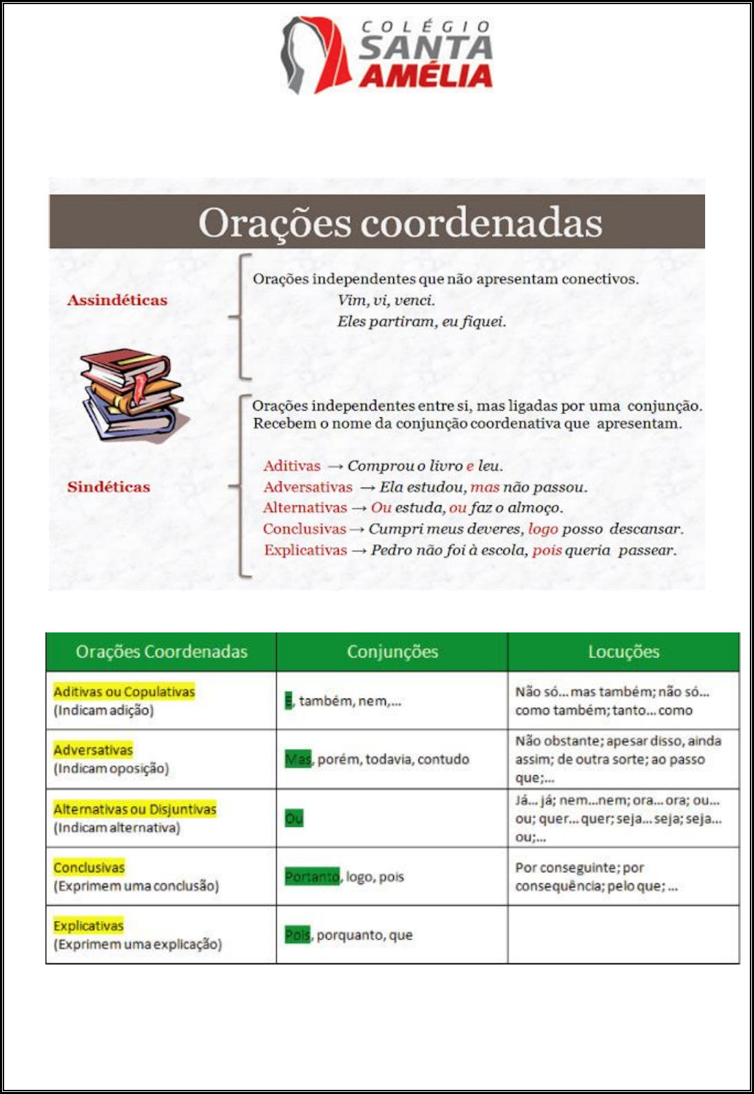 <p>ORAÇÕES COORDENADAS</p><p>As orações coordenadas são orações independentes, ou seja, não há relação sintática entre elas. Elas são classificadas em dois</p><p>tipos: orações coordenadas sindéticas e orações coordenadas assindéticas.</p><p>ATIVIDADE</p><p>1. Assinale a alternativa que apresenta uma oração coordenada sindética</p><p>a) Na festa da Natália comemos, cantamos, dançamos a noite toda.</p><p>b) Não beba quando está comendo, ficará com dores de estômago.</p><p>c) O funcionário não quer trabalhar, aprender, estudar.</p><p>d) Cheguei cedo, portanto terei de esperar a escola abrir.</p><p>e) Minha avó costumava fazer bolos, tortas, pudins.</p><p>2. As orações coordenadas aditivas expressam a ideia de soma. A alternativa abaixo que não apresenta essa ideia é:</p><p>a) Ora gosta de pizza, ora gosta de hambúrguer.</p><p>b) Gosta de museu, bem como de teatro.</p><p>c) Jéssica conheceu Portugal e Espanha.</p><p>d) Não faz nem deixa ninguém fazer.</p><p>e) Gosta de ficar em casa, como também gosta de sair.</p><p>3. Reescreva orações a partir das ideias contidas em cada alternativa abaixo de forma a obter orações com período composto por</p><p>coordenação.</p><p>a) Andou na chuva. Ficou resfriado. (conclusão)</p><p>b) Nas férias, li muito. Fui muitas vezes à praia. (adição)</p><p>c) A professora gosta dos meus textos. A professora não gosta dos meus textos.</p><p>(alternância)</p><p>d) Acordou cedo dar conta de tudo. Muita coisa ficou por fazer. (adversidade)</p><p>e) Ouça o que ele diz. Ele tem mais experiência. (explicação)</p><p>ORAÇÕES SUBORDINADAS SUBSTANTIVAS</p><p>São aquelas que exercem, em relação à oração principal, uma das seguintes funções: sujeito (subjetivas), objeto direto (objetivas diretas),</p><p>objeto indireto (objetivas indiretas), complemento nominal (completivas nominais), predicativo do sujeito (predicativas) ou aposto (apositivas).</p><p>Classificação das orações subordinadas substantivas</p><p>• Oração subordinada substantiva subjetiva</p><p>Cumpre o papel de sujeito da oração principal:</p><p>É de suma importância que mantenhamos a calma.</p><p>• Oração subordinada substantiva objetiva direta</p><p>Exerce a função de objeto direto do verbo da oração principal:</p><p>As testemunhas revelaram que o empresário fugira do local do acidente.</p><p>• Oração subordinada substantiva objetiva indireta</p><p>Exerce a função de objeto indireto do verbo da oração principal:</p><p>Paula lembrou-se de comprar o meu chocolate.</p><p>• Oração subordinada substantiva completiva nominal</p><p>Atua como complemento nominal de substantivo, adjetivo ou advérbio da oração principal:</p><p>A advogada teve a capacidade de mentir diante dos jurados.</p><p>Estava confiante de que conseguiria o emprego.</p><p>Milton esteve perto de cometer uma loucura.</p><p>• Oração subordinada substantiva predicativa</p><p>Age como predicativo do sujeito em relação à oração principal:</p><p>Eu sou quem te ama.</p><p>https://mundoeducacao.uol.com.br/gramatica/tipos-sujeito.htm</p><p>https://mundoeducacao.uol.com.br/gramatica/objeto-direto.htm</p><p>https://mundoeducacao.uol.com.br/gramatica/objeto-indireto.htm</p><p>https://mundoeducacao.uol.com.br/gramatica/complemento-nominal.htm</p><p>https://mundoeducacao.uol.com.br/gramatica/predicativo-do-sujeito.htm</p><p>• Oração subordinada substantiva apositiva</p><p>Desempenha o papel de aposto em relação à oração principal:</p><p>Apenas peço um favor: que ela não volte nunca mais.</p><p>ORAÇÕES SUBORDINADAS ADVERBIAIS</p><p>As orações subordinadas adverbiais são aquelas que possuem a função do advérbio, funcionado como adjunto adverbial na frase.</p><p>Dependendo das circunstâncias que expressam, as orações subordinadas adverbiais são classificadas em 9 tipos: causais, comparativas,</p><p>concessivas, condicionais, conformativas, consecutivas, finais, temporais, proporcionais.</p><p>Vale lembrar que uma oração é subordinada quando estabelece uma função sintática sobre outras, ou seja, depende de outra para</p><p>apresentar seu sentido completo.</p><p>Dependendo da função sintática exercida na frase, as orações subordinadas são classificadas em três tipos: adverbiais, adjetivas e</p><p>substantivas.</p><p>ORAÇÕES SUBORDINADAS ADJETIVAS (RESTRITIVA E EXPLICATIVA)</p><p>As orações subordinadas adjetivas são aquelas que exercem a função de adjetivo. Geralmente, são introduzidas por pronomes relativos (que,</p><p>quem, qual, quanto, onde, cujo, etc.), os quais exercem a função de adjunto adnominal do termo anterior. O adjunto adnominal tem valor de</p><p>adjetivo.</p><p>Orações subordinadas adjetivas explicativas</p><p>Separadas por vírgulas, as orações subordinadas explicativas, como o próprio nome já indica, explicam melhor ou esclarecem o termo ao qual</p><p>se referem.</p><p>Exemplos:</p><p>1) O exame final, que estava muito difícil, deixou todos apreensivos.</p><p>Oração principal: O exame final deixou todos apreensivos.</p><p>Oração subordinada adjetiva explicativa: que estava muito difícil.</p><p>2) João, que é o mais calmo da turma, surpreendeu a todos.</p><p>Oração principal: João surpreendeu a todos.</p><p>Oração subordinada adjetiva explicativa: que é o mais calmo da turma.</p><p>Orações subordinadas adjetivas restritivas</p><p>Ao contrário das orações explicativas, as orações restritivas restringem ou delimitam o significado de seu antecedente e não são separadas por</p><p>vírgulas.</p><p>Exemplos:</p><p>1) As pessoas que são racistas merecem ser punidas.</p><p>Oração principal: As pessoas merecem ser punidas.</p><p>Oração subordinada adjetiva restritiva: que são racistas.</p><p>https://mundoeducacao.uol.com.br/gramatica/caracteristicas-aposto.htm</p><p>2) As pessoas que não praticam esporte costumam ser mais doentes.</p><p>Oração principal: As pessoas cost