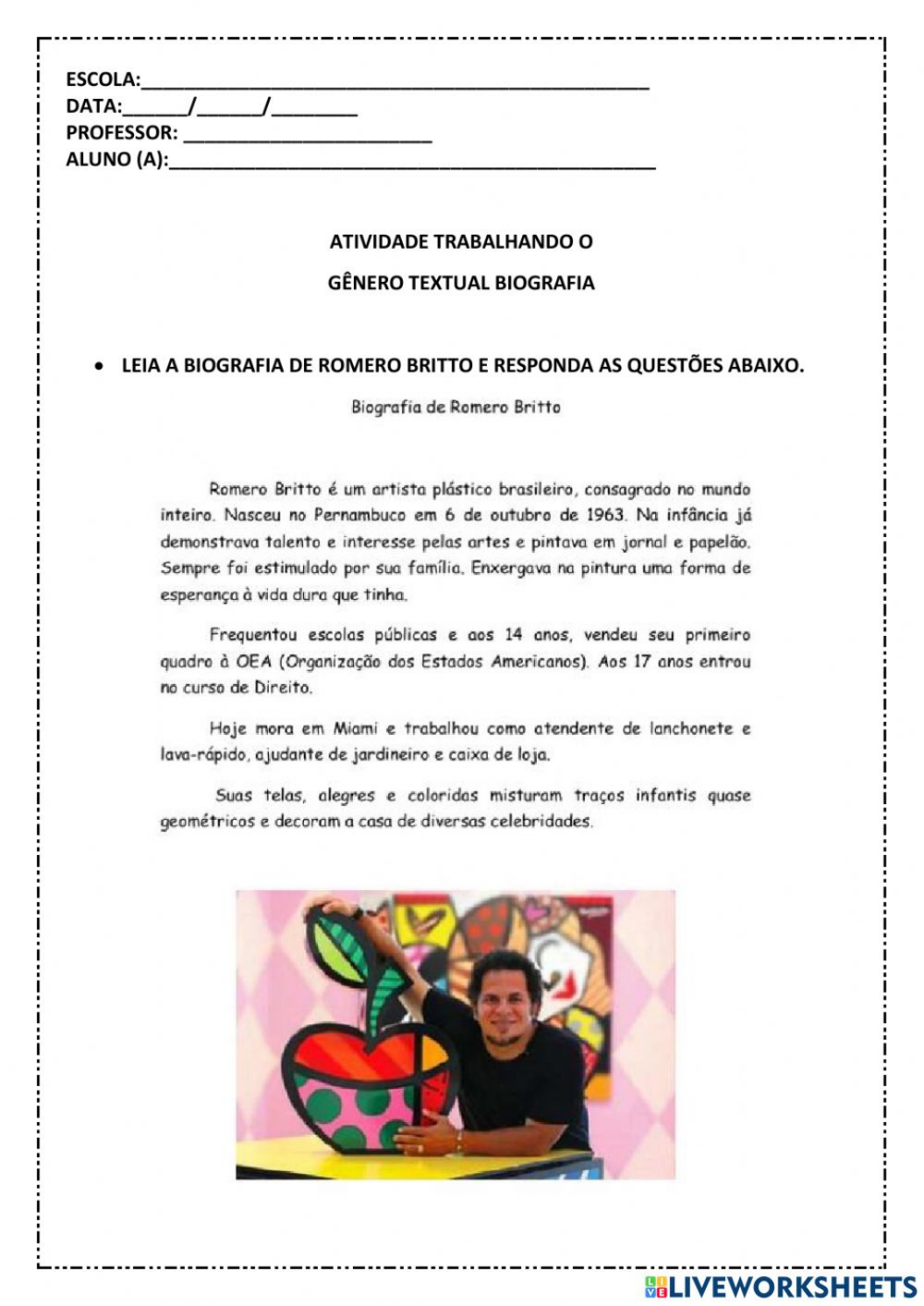 <p>ESCOLA: DATA: / PROFESSOR: ALUNO (A): ATIVIDADE TRABALHANDO o GÊNERO TEXTUAL BIOGRAFIA LEIA A BIOGRAFIA DE ROMERO BRITTO E RESPONDA AS QUESTÕES ABAIXO. Biografia de Romero Britto Romero Britto é um artista plástico brasileiro, consagrado no mundo inteiro. Nasceu no Pernambuco em 6 de outubro de 1963. Na infância já demonstrava talento e interesse pelas artes e pintava em jornal e papelão. Sempre foi estimulado por sua Enxergava no pintura uma forma de esperança à vida dura que tinha. Frequentou escolas públicas e 14 anos, vendeu seu primeiro quadro à OEA (Organização dos Estados Americanos). Aos 17 anos entrou no curso de Direito. Hoje mora em Miami € trabalhou como atendente de lanchonete e ajudante de jardineiro e caixa de loja. Suas telas, alegres e coloridas misturam traços infantis quase e decoram a casa de diversas</p><p>1- ONDE E QUANDO ROMERO BRITTO NASCEU? R- 2- ASSINALE A ALTERNATIVA CORRETA. ROMERO BRITTO COMEÇOU A GOSTAR DE ARTE JÁ NA ADOLESCENCIA. ROMERO BRITTO DEMONSTROU TALENTO E INTERESSE PELA ARTE AINDA NA INFÂNCIA. 3- QUAIS MATERIAIS ELE USAVA PARA PINTAR NA INFÂNCIA? R- 4- COM QUAL IDADE VENEU SUA PRIMEIRA OBRA: 10 ANOS 14 ANOS 16 ANOS 5- QUAL FOI SUA PRIMEIRA FACULDADE? ARTES PLÁSTICAS DIREITO JORNALISMO 6- ONDE MORA HOJE EM DIA? R- 7- QUAIS AS CARACTERÍSTICAS DAS SUAS OBRAS? ALEGRES E COLORIDAS MISTURAM TRAÇOS INFANTINS E GEOMÉTRICOS. REPRESENTAM TRISTEZA E USA CORES NEUTRAS.</p>