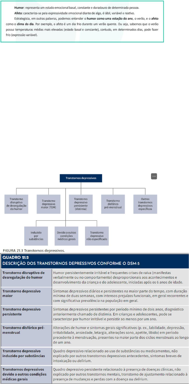 <p>OBJ 1→Caracterizar depressão (TDM, TDP/distimia, TD pré-menstrual) quanto a: definição, epidemiologia,</p><p>classificação, fisiopatologia, características clínicas, diagnóstico, diagnóstico diferencial, complicações e tipos de</p><p>tratamento farmacológico e não farmacológico:</p><p>FONTE: Tratado de Psiquiatria da Associação Brasileira de Psiquiatria - Nardi, Antonio, E. et al. – 2021.</p><p>Introdução</p><p>Uso do Termo "Depressão":</p><p>• Amplamente utilizado na medicina para descrever a "redução do funcionamento".</p><p>Prevalência:</p><p>• A depressão unipolar afeta cerca de 12% da população. É o transtorno psiquiátrico mais comum.</p><p>Humor:</p><p>• Componente da vida afetiva, envolvendo áreas cerebrais relacionadas às emoções (prazer, desprazer, tristeza,</p><p>alegria).</p><p>• Influencia pensamento, comportamento e a maneira de agir do indivíduo.</p><p>Variações Normais e Transtornos:</p><p>• Variações de humor são normais e refletem transições entre bem-estar e mal-estar.</p><p>• Transtornos do humor representam alterações mórbidas nas funções afetivas (qualitativas e quantitativas).</p><p>Sintomas do Humor:</p><p>• Podem ser primários ou secundários a outras condições (ex.: demência, hipotireoidismo).</p><p>• Podem também ser induzidos por abuso ou dependência de substâncias.</p><p>• Em casos secundários, o diagnóstico prevalente é da condição primária.</p><p>TRANSTORNO DEPRESSIVO</p><p>FONTE: Cantilino, Amaury e Dennison Carreiro Monteiro. Psiquiatria Clínica. 2017.</p><p>Características Principais:</p><p>• Ocorrência de episódios depressivos sem episódios maníacos, hipomaníacos ou mistos.</p><p>• Impacto significativo no humor, causando desconforto e sofrimento.</p><p>• Sensação de não conseguir desfrutar da vida, sentimentos persistentes de inadequação, tristeza, irritação,</p><p>desamparo e pessimismo.</p><p>• Pensamentos disfuncionais, como pessimismo, culpa e autoacusação.</p><p>• Dificuldade no desempenho cognitivo, memória, concentração e raciocínio.</p><p>• Sintomas físicos incluem fadiga, perturbação do sono, perda de peso e diminuição do apetite.</p><p>EPIDEMIOLOGIA</p><p>PREVALÊNCIA</p><p>• Média de 6% em 12 meses (World Health Survey).</p><p>• Prevalência ao longo da vida: 12-18%.</p><p>• No Brasil: 10,4% em 12 meses e 18,4% ao longo da vida.</p><p>IDADE DE INÍCIO</p><p>• Início do primeiro episódio geralmente entre 24-25 anos.</p><p>• 40% dos primeiros episódios ocorrem antes dos 20 anos.</p><p>FATORES PROTETORES E DE VULNERABILIDADE</p><p>• Prevalência maior em mulheres (fatores biológicos, psicológicos, ambientais e sociais).</p><p>• Risco aumentado por eventos de vida como separação, menor nível educacional, desemprego e dificuldades</p><p>financeiras.</p><p>• Histórico de traumas na infância e eventos adversos durante o desenvolvimento são fatores de risco.</p><p>A identificação dos fatores de risco para TDs pode ser importante para indicar a necessidade de screening de</p><p>depressão, especialmente na atenção primária (Quadro 21.1).</p><p>Recorrência e Impacto:</p><p>• 40% de recorrência em até 2 anos; 75% após dois episódios.</p><p>• Alta associação com suicídio.</p><p>• Custo econômico significativo (US$ 83 bilhões nos EUA).</p><p>• Frequente comorbidade com abuso de substâncias.</p><p>• Depressão muitas vezes subdiagnosticada (metanálise: 50% dos casos diagnosticados na atenção</p><p>básica).</p><p>• Dificuldades para os pacientes falarem sobre sintomas devido ao estigma e outros fatores.</p><p>COMORBIDADES PSIQUIÁTRICAS</p><p>Transtornos de Ansiedade:</p><p>• 30,6% dos indivíduos deprimidos.</p><p>• Transtorno de Ansiedade Generalizada (TAG): 19,9%.</p><p>• Transtorno de Pânico (TP): 11,1%.</p><p>• Fobia Social: 9,9%.</p><p>Transtornos por Uso de Substâncias:</p><p>• 45,3% dos pacientes com TDM.</p><p>• Transtorno por Uso de Álcool: 22,2%.</p><p>• Transtorno por Uso de Drogas: 10,1%.</p><p>• Dependência de Nicotina: 32,8%.</p><p>Transtornos de Personalidade:</p><p>• Transtorno da Personalidade Borderline (TPB): 35,7%.</p><p>• Transtorno da Personalidade Esquizotípica: 18,4%.</p><p>FISIOPATOLOGIA</p><p>Genética:</p><p>• Interação Gene-Ambiente:</p><p>o Depressão resulta da combinação de predisposição genética e fatores ambientais.</p><p>o Alelo S no polimorfismo do gene do transportador da serotonina (5-HTTLPR) está associado a maior</p><p>risco de depressão em resposta a estressores.</p><p>o Herdabilidade estimada do transtorno: 37%.</p><p>o Risco aumentado de depressão em parentes de portadores: razão de chance de 2,84.</p><p>• Mecanismos Biológicos:</p><p>o Desenvolvimento axonal, diferenciação neuronal, neuroplasticidade, neurotransmissão, citocinas, resposta</p><p>imune e regulação genética são relevantes.</p><p>o Telômeros encurtados associados a envelhecimento celular precoce em depressão.</p><p>Neurobiologia:</p><p>• Eixo Hipotálamo-Hipófise-Adrenal (HHA):</p><p>o Resposta ao estresse elevada desde a infância pode persistir até a vida adulta.</p><p>o Hipersecreção crônica de CRH e níveis elevados de cortisol em pacientes deprimidos.</p><p>o Efeito dos antidepressivos no HHA: aumento agudo de cortisol seguido por normalização.</p><p>• Monoaminas:</p><p>o Teoria monoaminérgica sugere deficiência na neurotransmissão monoaminérgica.</p><p>o Antidepressivos aumentam monoaminas na fenda sináptica, mas efeito clínico demora semanas.</p><p>o Antidepressivos tricíclicos e IMAOs provocam downregulation de receptores β-adrenérgicos; ISRSs</p><p>causam dessensibilização dos autorreceptores 5-HT1A.</p><p>• Norepinefrina:</p><p>o Downregulation de receptores beta-adrenérgicos e redução da norepinefrina liberada estão associados à</p><p>depressão.</p><p>• Serotonina:</p><p>o ISRSs são