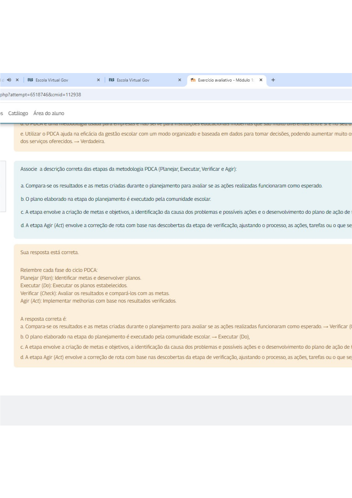 <p>x Escola Virtual Gov Escola Virtual Gov Exercício avaliativo - Módulo 1: + hp?attempt=6518746&cmid=112938 Catálogo Área do aluno que e. Utilizar o PDCA ajuda na eficácia da gestão escolar com um modo organizado e baseada em dados para tomar decisões, podendo aumentar muito o dos serviços oferecidos. Verdadeira Associe a descrição correta das etapas da metodologia PDCA (Planejar, Executar, Verificar e Agir): a. Compara-se os resultados e as metas criadas durante o planejamento para avaliar se as ações realizadas funcionaram como esperado. b. o plano elaborado na etapa do planejamento é executado pela comunidade escolar. C. A etapa envolve a criação de metas e objetivos, a identificação da causa dos problemas e possíveis ações e o desenvolvimento do plano de ação de d. A etapa Agir (Act) envolve a correção de rota com base nas descobertas da etapa de verificação, ajustando o processo, as ações, tarefas ou o que Sua resposta está correta. Relembre cada fase do ciclo PDCA: (Plan): Identificar metas e desenvolver planos. Executar (Do): Executar os planos Verificar (Check): os resultados e compará-los com as Agir (Act): Implementar melhorias com base nos resultados verificados. A resposta correta é: a. Compara-se os resultados e as metas criadas durante o planejamento para avaliar se as ações realizadas funcionaram como esperado. Verificar b. o plano elaborado na etapa do planejamento é executado pela comunidade escolar. Executar (Do), A etapa envolve a criação de metas e objetivos, a identificação da causa dos problemas e possíveis ações e desenvolvimento do plano de ação de d. A etapa Agir (Act) envolve a correção de rota com base nas descobertas da etapa de verificação, ajustando o processo, as ações, tarefas ou o que se</p>
