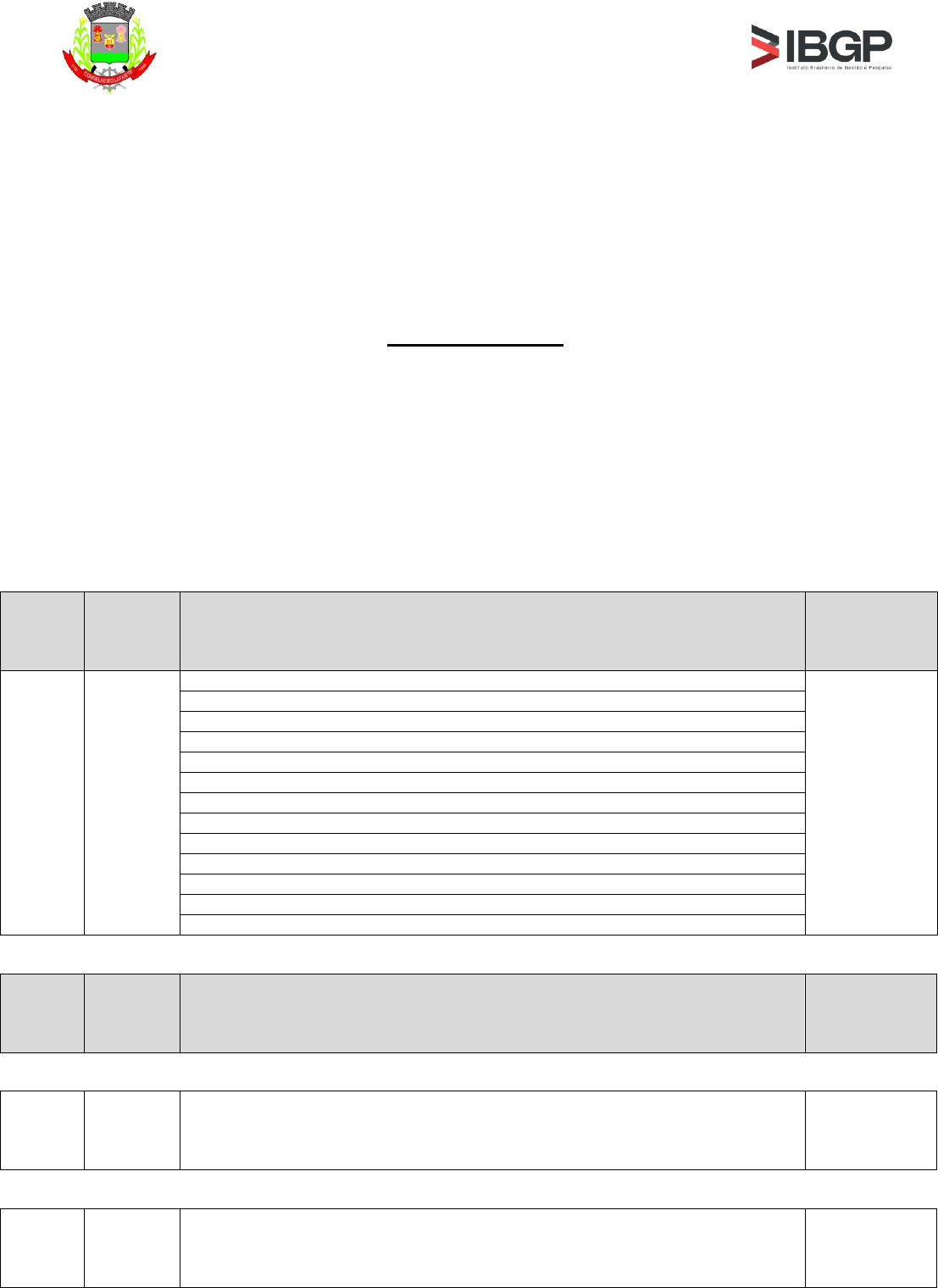 <p>CONCURSO PÚBLICO DO MUNICÍPIO CONSELHEIRO</p><p>LAFAIETE/MG - EDITAL Nº 01/2024</p><p>Página 1 de 11</p><p>CONCURSO PÚBLICO PARA PROVIMENTO DE CARGOS/FUNÇÕES PÚBLICOS(AS) PARA O</p><p>QUADRO DE PESSOAL DO MUNICÍPIO DE CONSELHEIRO LAFAIETE/MG - EDITAL Nº 01/2024</p><p>RETIFICAÇÃO Nº 01</p><p>O Município de Conselheiro Lafaiete e o Instituto Brasileiro de Gestão e Pesquisa – IBGP RESOLVEM</p><p>RETIFICAR o Edital nº 01/2024, de 01/08/2024, e os respectivos anexos I, II, III e IV na forma abaixo</p><p>especificada:</p><p>EDITAL Nº 01/2024</p><p>ONDE SE LÊ:</p><p>1.6. Este Concurso Público terá validade de 02(dois) anos, podendo ser prorrogado uma única vez, por</p><p>igual período.</p><p>LEIA-SE:</p><p>1.6. Este Concurso Público terá validade de 02(dois) anos, a contar da data da publicação da homologação,</p><p>podendo ser prorrogado uma única vez, por igual período.</p><p>ONDE SE LÊ:</p><p>[…]</p><p>DATA DA</p><p>PROVA</p><p>TURNO/</p><p>HORÁRIO</p><p>CARGO/FUNÇÃO</p><p>HORÁRIO DE</p><p>ABERTURA E</p><p>FECHAMENTO</p><p>DO PORTÃO</p><p>24/11/2024</p><p>(domingo)</p><p>Manhã</p><p>Das 09h15</p><p>às 12h15</p><p>616 - MÉDICO ORTOPEDISTA</p><p>Abertura às 08h</p><p>e</p><p>fechamento às</p><p>09h00min00seg</p><p>617 - MÉDICO OTORRINOLARINGOLOGISTA</p><p>618 - MÉDICO PEDIATRA</p><p>619 - MÉDICO PNEUMOLOGISTA</p><p>620 - MÉDICO PSIQUIATRA</p><p>621 - MÉDICO REGULADOR</p><p>622 - MÉDICO UROLOGISTA</p><p>623 - ODONTÓLOGO ATENDIMENTO ESPECIAL</p><p>624 - ODONTÓLOGO CIRURGIÃO BUCOMAXILOFACIAL</p><p>625 - ODONTÓLOGO ENDODONTISTA</p><p>626 - ODONTÓLOGO ESPECIALISTA EM ESF</p><p>627 - ODONTÓLOGO ESTOMATOLOGISTA</p><p>628 - ODONTÓLOGO PERIODONTISTA</p><p>[...]</p><p>[...]</p><p>DATA DA</p><p>PROVA</p><p>TURNO/</p><p>HORÁRIO</p><p>CARGO/FUNÇÃO</p><p>HORÁRIO DE</p><p>ABERTURA E</p><p>FECHAMENTO</p><p>DO PORTÃO</p><p>24/11/2024</p><p>(domingo)</p><p>Tarde</p><p>Das 14h15</p><p>às 17h15</p><p>508 - ENGENHEIRO DE SEGURANÇA TRABALHO</p><p>Abertura às 13h</p><p>e</p><p>fechamento às</p><p>14h00min00seg</p><p>24/11/2024</p><p>(domingo)</p><p>Tarde</p><p>Das 14h15</p><p>às 17h15</p><p>539 - PSICÓLOGO I (SAÚDE)</p><p>Abertura às 13h</p><p>e</p><p>fechamento às</p><p>14h00min00seg</p><p>CONCURSO PÚBLICO DO MUNICÍPIO CONSELHEIRO</p><p>LAFAIETE/MG - EDITAL Nº 01/2024</p><p>Página 2 de 11</p><p>LEIA-SE:</p><p>DATA DA</p><p>PROVA</p><p>TURNO/</p><p>HORÁRIO</p><p>CARGO/FUNÇÃO</p><p>HORÁRIO DE</p><p>ABERTURA E</p><p>FECHAMENTO</p><p>DO PORTÃO</p><p>24/11/2024</p><p>(domingo)</p><p>Manhã</p><p>Das 09h15</p><p>às 12h15</p><p>616 - MÉDICO ORTOPEDISTA</p><p>Abertura às 08h</p><p>e</p><p>fechamento às</p><p>09h00min00seg</p><p>617 - MÉDICO OTORRINOLARINGOLOGISTA</p><p>618 - MÉDICO PEDIATRA</p><p>619 - MÉDICO PNEUMOLOGISTA</p><p>620 - MÉDICO PSIQUIATRA</p><p>621 - MÉDICO REGULADOR</p><p>622 - MÉDICO UROLOGISTA</p><p>623 - ODONTÓLOGO ATENDIMENTO ESPECIAL</p><p>624 - ODONTÓLOGO CIRURGIÃO BUCOMAXILOFACIAL</p><p>625 - ODONTÓLOGO ENDODONTISTA</p><p>626 - ODONTÓLOGO ESPECIALISTA EM ESF</p><p>627 - ODONTÓLOGO ESTOMATOLOGISTA</p><p>628 - ODONTÓLOGO PERIODONTISTA</p><p>629 – ENGENHEIRO DE SEGURANÇA DO TRABALHO</p><p>[...]</p><p>[...]</p><p>ONDE SE LÊ:</p><p>9.1.12. Os candidatos poderão levar consigo o Caderno de Questões após ter concluído a prova.</p><p>LEIA-SE:</p><p>9.1.12. Os candidatos poderão levar consigo o Caderno de Questões após ter concluído a prova.</p><p>9.1.12.1. Ao terminarem as provas, os candidatos deverão se retirar imediatamente do local, não</p><p>sendo possível nem mesmo a utilização dos banheiros dentro dos locais de realização das</p><p>provas.</p><p>DATA DA</p><p>PROVA</p><p>TURNO/</p><p>HORÁRIO</p><p>CARGO/FUNÇÃO</p><p>HORÁRIO DE</p><p>ABERTURA E</p><p>FECHAMENTO</p><p>DO PORTÃO</p><p>24/11/2024</p><p>(domingo)</p><p>Tarde</p><p>Das 14h15</p><p>às 17h15</p><p>508 - ENGENHEIRO DE SEGURANÇA TRABALHO (Revogado)</p><p>Abertura às 13h</p><p>e</p><p>fechamento às</p><p>14h00min00seg</p><p>24/11/2024</p><p>(domingo)</p><p>Tarde</p><p>Das 14h15</p><p>às 17h15</p><p>539 - PSICÓLOGO I</p><p>Abertura às 13h</p><p>e</p><p>fechamento às</p><p>14h00min00seg</p><p>CONCURSO PÚBLICO DO MUNICÍPIO CONSELHEIRO</p><p>LAFAIETE/MG - EDITAL Nº 01/2024</p><p>Página 3 de 11</p><p>ANEXO I – CARGO/FUNÇÃO PÚBLICA, ESCOLARIDADE, REQUISITO PARA</p><p>INGRESSO, JORNADA DE TRABALHO, VAGAS (AMPLA CONCORRÊNCIA E PESSOAS</p><p>COM DEFICIÊNCIA - PcD) E VENCIMENTO INICIAL</p><p>ONDE SE LÊ:</p><p>[…]</p><p>ENSINO SUPERIOR COMPLETO</p><p>CÓD. CARGO/FUNÇÃO REQUISITO</p><p>JORNADA DE</p><p>TRABALHO</p><p>VAGAS</p><p>VENCIMENTO</p><p>MENSAL</p><p>AMPLA</p><p>CONCOR.</p><p>PcD (*)</p><p>NEGROS</p><p>OU</p><p>PARDOS</p><p>TOTAL</p><p>VAGAS</p><p>[…]</p><p>508</p><p>ENGENHEIRO DE SEGURANÇA</p><p>TRABALHO</p><p>Ensino Superior Completo em Engenharia de</p><p>Segurança do Trabalho e Registro no Órgão de Classe</p><p>20 horas</p><p>semanais</p><p>01 00 00 01 + CR (**) R$ 3.637,84</p><p>[…]</p><p>539 PSICÓLOGO I (SAÚDE)</p><p>Ensino Superior Completo em Psicologia e Registro no</p><p>Órgão de Classe</p><p>20 horas</p><p>semanais</p><p>03 01 01 05 + CR (**) R$ 3.637,84</p><p>[…]</p><p>LEIA-SE:</p><p>ENSINO SUPERIOR COMPLETO</p><p>CÓD. CARGO/FUNÇÃO REQUISITO</p><p>JORNADA DE</p><p>TRABALHO</p><p>VAGAS</p><p>VENCIMENTO</p><p>MENSAL</p><p>AMPLA</p><p>CONCOR.</p><p>PcD (*)</p><p>NEGROS</p><p>OU</p><p>PARDOS</p><p>TOTAL</p><p>VAGAS</p><p>[…]</p><p>508</p><p>ENGENHEIRO DE SEGURANÇA</p><p>TRABALHO (Revogado).</p><p>Ensino Superior Completo em Engenharia de</p><p>Segurança do Trabalho e Registro no Órgão de Classe</p><p>20 horas</p><p>semanais</p><p>01 00 00 01 + CR (**) R$ 3.637,84</p><p>[…]</p><p>539 PSICÓLOGO I</p><p>Ensino Superior Completo em Psicologia e Registro no</p><p>Órgão de Classe</p><p>20 horas</p><p>semanais</p><p>03 01 01 05 + CR (**) R$ 3.637,84</p><p>ENSINO SUPERIOR COMPL