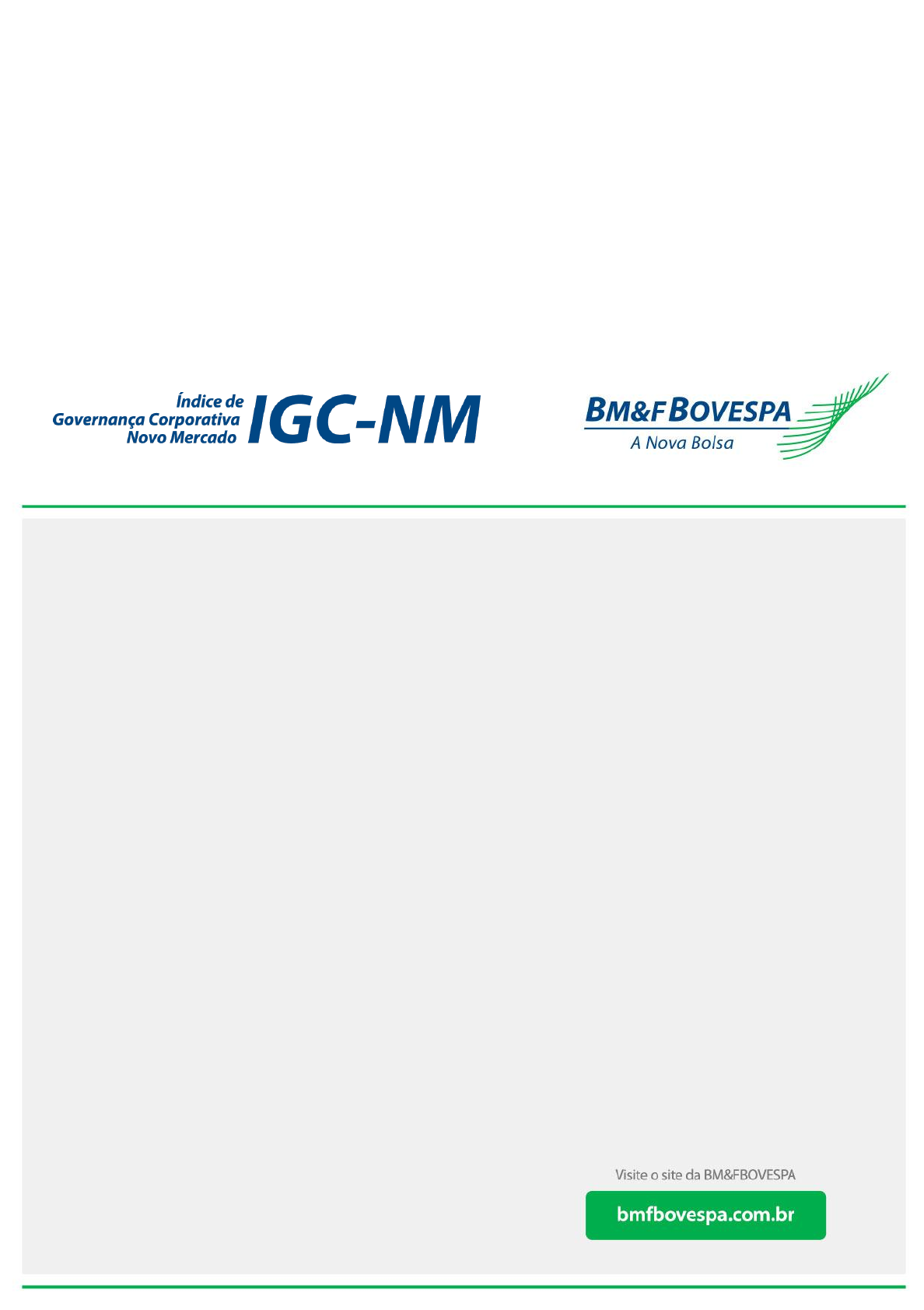[data] Abril/2015 METODOLOGIA DO ÍNDICE DE GOVERNANÇA CORPORATIVA – NOVO MERCADO (IGC-NM) http://www.bmfbovespa.com.br/produtos Abril/2015 2 METODOLOGIA DO ÍNDICE DE GOVERNANÇA CORPORATIVA – NOVO MERCADO (IGC-NM) METODOLOGIA DO ÍNDICE DE GOVERNANÇA CORPORATIVA – NOVO MERCADO (IGC-NM) O IGC-NM é o resultado de uma carteira teórica de ativos, elaborada de acordo com os critérios estabelecidos nesta metodologia. Os índices da BM&FBOVESPA utilizam procedimentos e regras constantes do Manual de Definições e Procedimentos dos Índices da BM&FBOVESPA. 1 Objetivo O objetivo do IGC-NM é ser o indicador do desempenho médio das cotações dos ativos de emissão de empresas que apresentem bons níveis de governança corporativa, listadas no Novo Mercado da BM&FBOVESPA. 2 Tipo de Índice O IGC-NM é um índice de retorno total (ver Manual de Definições e Procedimentos dos Índices da BM&FBOVESPA). 3 Ativos Elegíveis O IGC-NM é composto das ações de companhias listadas na BM&FBOVESPA que atendem aos critérios de inclusão descritos a seguir. Não estão incluídos nesse universo BDRs e ativos de companhias em recuperação judicial ou extrajudicial, regime especial de administração temporária, intervenção ou que sejam negociados em qualquer outra situação especial de listagem (ver Manual de Definições e Procedimentos dos Índices da BM&FBOVESPA). Abril/2015 3 METODOLOGIA DO ÍNDICE DE GOVERNANÇA CORPORATIVA – NOVO MERCADO (IGC-NM) 4 Critérios de Inclusão Serão selecionados para compor o IGC-NM os ativos que atendam cumulativamente aos critérios abaixo. Nas recomposições quadrimestrais 1. Ser listado no Novo Mercado da BM&FBOVESPA; 2. Ter presença em pregão de 50% (cinquenta por cento) no período de vigência das 3 (três) carteiras anteriores ou em seu período de listagem, se inferior; 3. Não ser classificado como “Penny Stock” (ver Manual de Definições e Procedimentos dos Índices da BM&FBOVESPA). Durante a vigência da carteira 1. Ser listado no Novo Mercado da BM&FBOVESPA. Ativos de novas empresas Serão incluídos após o encerramento do primeiro pregão regular de negociação. Ativos de empresas já negociadas na BM&FBOVESPA Serão incluídos após o encerramento do pregão anterior a sua listagem no Novo Mercado. 5 Critérios de Exclusão Serão excluídos da carteira os ativos que: Nas recomposições quadrimestrais Abril/2015 4 METODOLOGIA DO ÍNDICE DE GOVERNANÇA CORPORATIVA – NOVO MERCADO (IGC-NM) 1. Deixarem de atender a qualquer um dos critérios de inclusão acima indicados. Durante a vigência da carteira 1. Deixarem de ser listados no Novo Mercado. Serão excluídos ao final do último dia de negociação nesse segmento; 2. Passem a ser listados em situação especial (ver Manual de Definições e Procedimentos dos Índices da BM&FBOVESPA). Serão excluídos ao final de seu primeiro dia de negociação nesse enquadramento. 6 Critério de Ponderação No IGC-NM, os ativos são ponderados pelo valor de mercado do “free float” (ativos que se encontram em circulação) da espécie pertencente à carteira (ver Manual de Definições e Procedimentos dos Índices da BM&FBOVESPA). Ressalta-se que a participação de um ativo de uma companhia no índice não poderá ser superior a 20% (vinte por cento), quando de sua inclusão ou nas reavaliações periódicas. Caso isso ocorra, serão efetuados ajustes para adequar o peso do ativo da companhia a esse limite, redistribuindo-se o excedente proporcionalmente aos demais ativos da carteira. Abril/2015 5 METODOLOGIA DO ÍNDICE DE GOVERNANÇA CORPORATIVA – NOVO MERCADO (IGC-NM) http://www.bmfbovespa.com.br/produtos